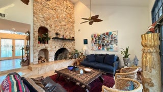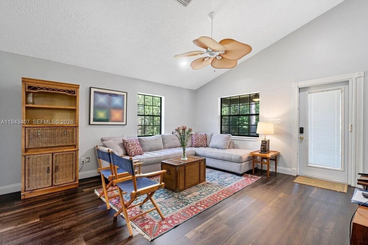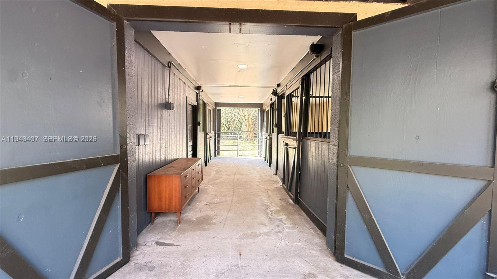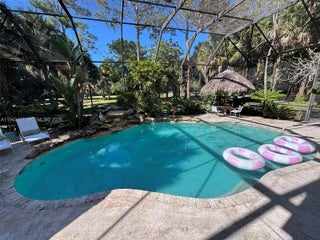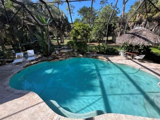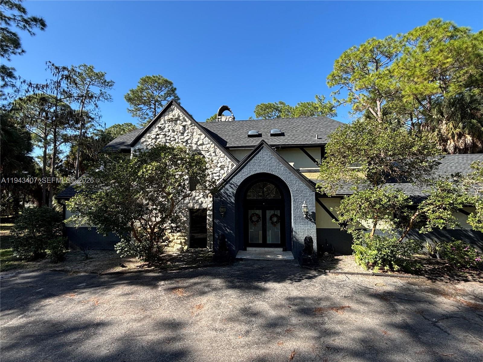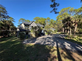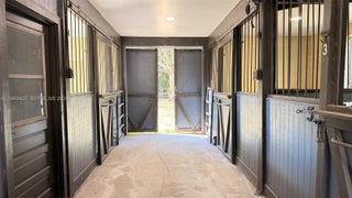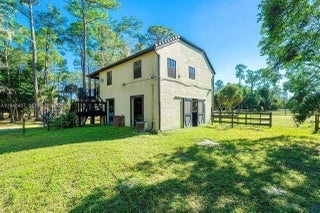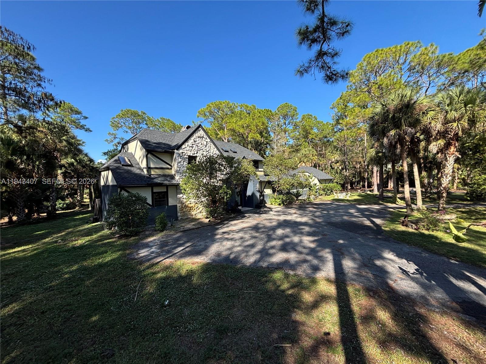 Distinctive Tudor-style estate set on 5 acres in the highly desirable Fox Trail Equestrian Community, where all homes sit on five-acre parcels, offering privacy and space. The main residence offers 2,560 sq ft under air and features three spacious master bedrooms, each with its own full bath and ample closet space, plus an additional half bathroom for guests. Skylights throughout the home flood the interiors with natural light and enhance the architectural character. Multiple sets of impact-rated French doors open to an extra-large screened-in pool surrounded by lush tropical vegetation, ideal for entertaining. A separate full bathroom serves the pool and stable area. The barn is very well maintained and includes three stalls and a tack room, with space for paddocks or an arena while preserving mature vegetation and pine trees. Above the barn, a light-filled 728 sq ft air-conditioned apartment offers privacy and flexibility, complete with living area, kitchen, bedroom, full bath, and laundry, and provides income potential, with seasonal or annual rental opportunities of up to $3,500 per month. Additional highlights include a new roof with transferable warranty,low HOA of $83/month, and approximately 16 miles of riding trails. Completely private yet minutes from shopping, dining, and Wellington’s equestrian venues. A rare opportunity to enjoy true luxury rural living in one of the fastest-growing, world-class counties in Florida, Palm Beach County.