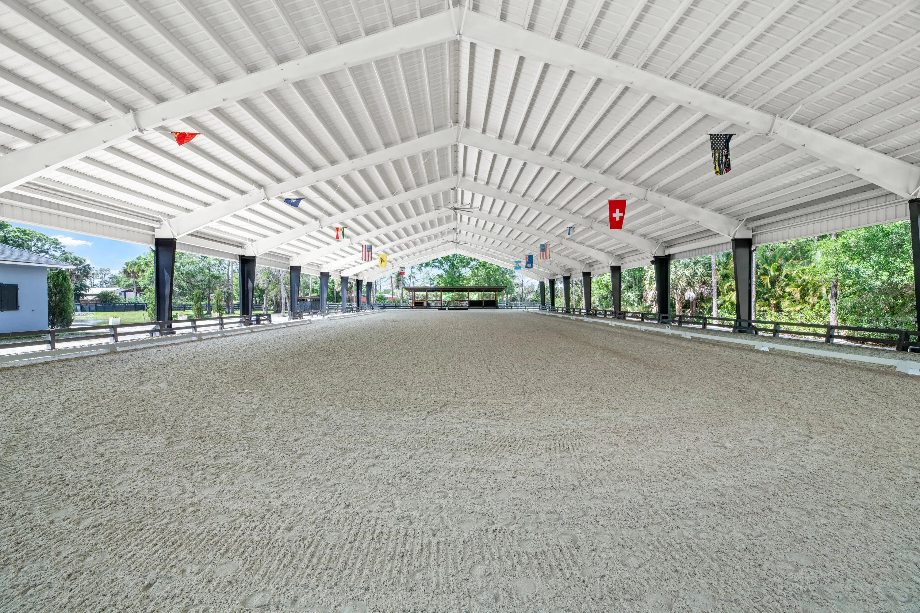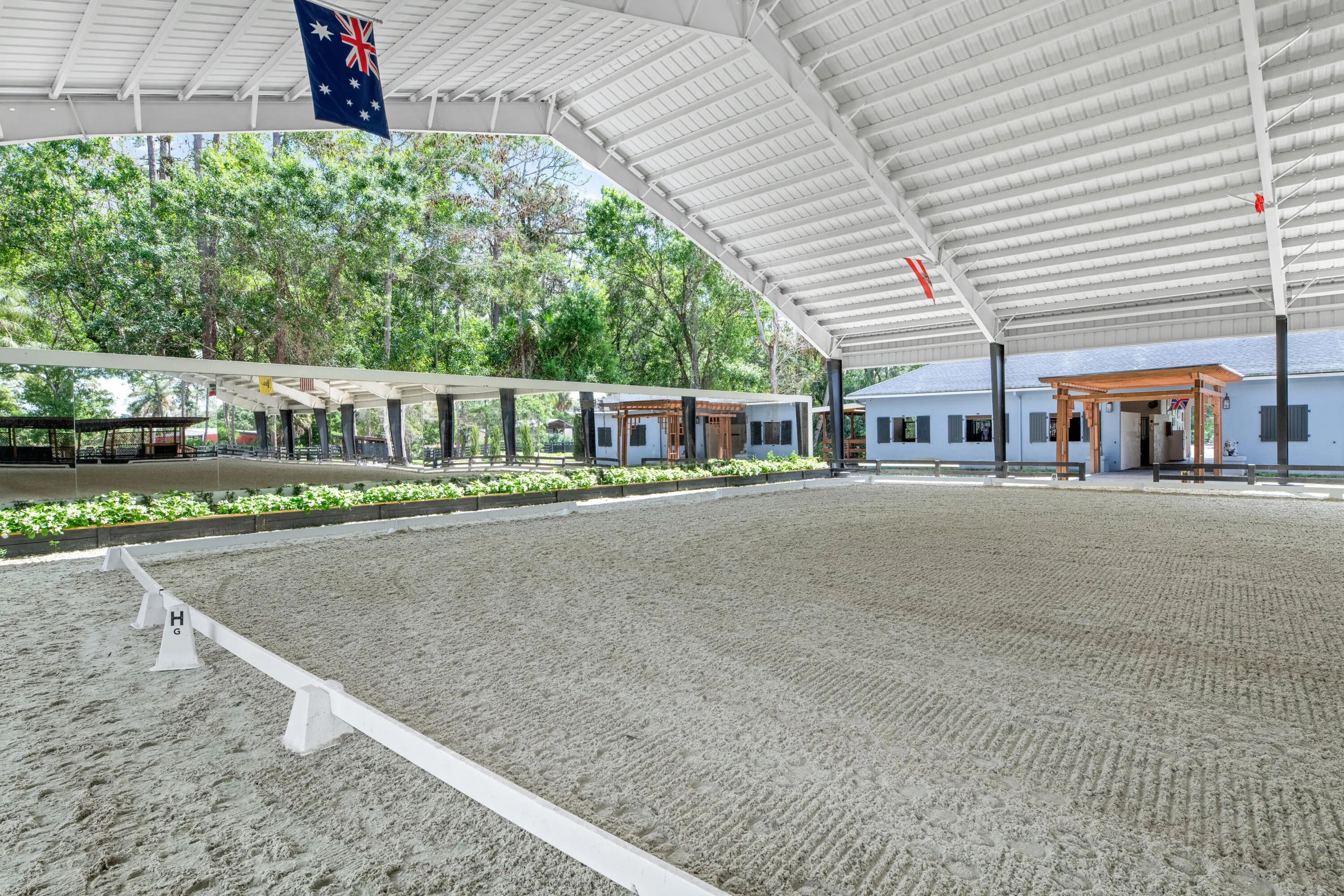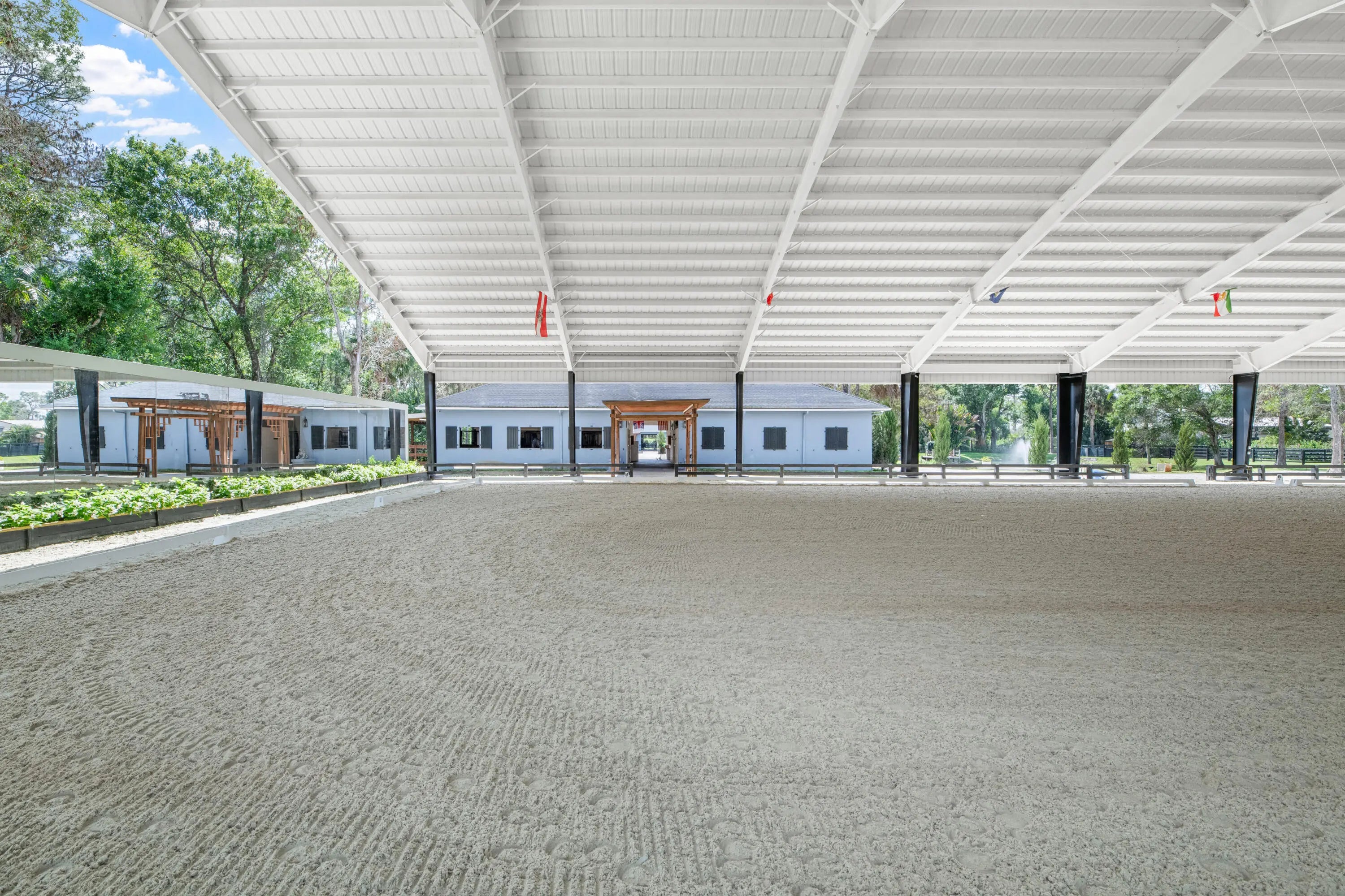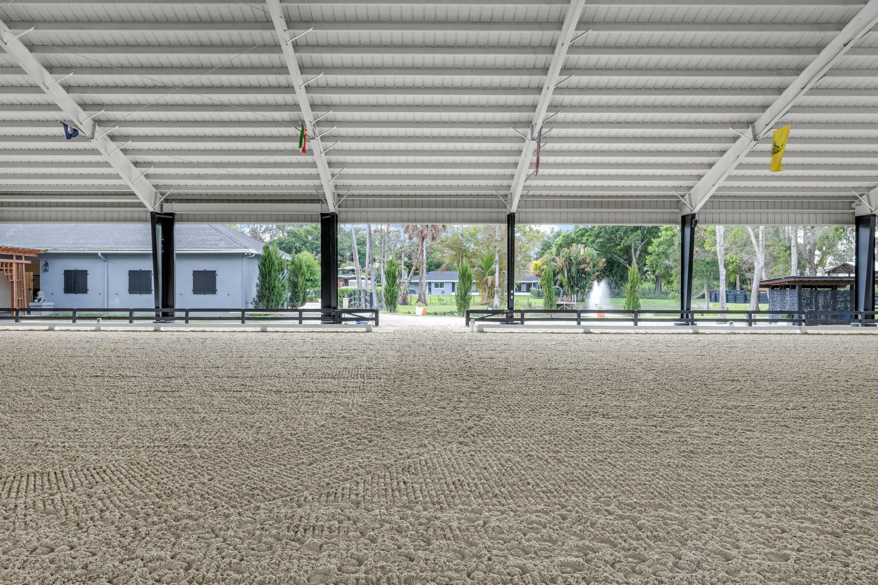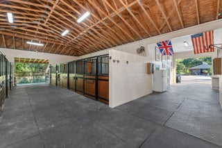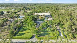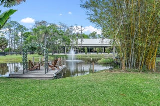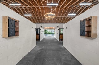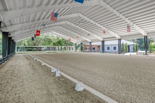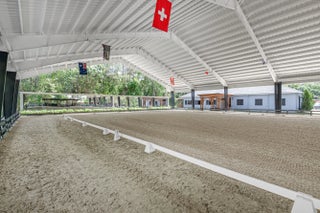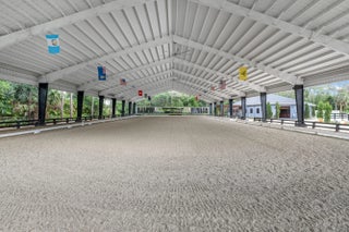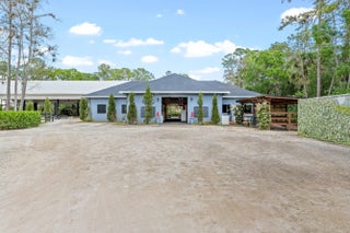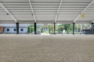 Set beneath a canopy of mature oak trees and just 13 minutes from Wellington International, this exceptional equestrian estate offers a rare blend of top-tier equestrian facilities and refined residential living, all within a private, beautifully landscaped five-acre setting. The property features two CBS barns totaling 17 stalls, thoughtfully designed with custom stall fronts, elegant chandeliers, and quality finishes throughout—creating a polished yet highly functional environment suited for both professional operations and private use. At the heart of the farm is a newly constructed 2022 covered arena (120 x 190). The arena is appointed with GGT footing, an advanced Ebb & Flow watering system, custom mirrors, and a spacious viewing area, delivering a consistent and elevated experience Supporting the facility are eight irrigated paddocks, a round pen, tack room with lounge, feed rooms, full bathroom with wood tile accents, laundry, and exceptional groom's quarters, offering a fully equipped, turnkey setup. The completely remodeled 5-bedroom, 3-bath residence seamlessly blends comfort and style. The chef's kitchen is centered around a dramatic 15-foot island with quartzite countertops, stainless steel appliances, and a wine chiller, ideal for both everyday living and entertaining. The primary suite offers a private retreat with a wood-burning fireplace, an expansive custom walk-in closet with seating area, and a beautifully appointed bath featuring dual vanities, a soaking tub, and a walk-in shower with dual shower heads. A guest ensuite bedroom provides additional comfort and flexibility for visitors. Outdoor living is equally impressive, with a private, fenced pool terrace finished in travertine with custom turf inlay, creating a clean, architectural aesthetic with a relaxed, resort-style feel. The grounds also feature a pond with a dock and seating area, a fenced dog park, and a gazebo ideal for entertaining or quiet evenings outdoors. Surrounded by lush landscaping and natural shade, the property offers both privacy and functionality, with a layout ideal for a boutique training operation or private equestrian retreat—just moments from the heart of Wellington's world-class competition venues.