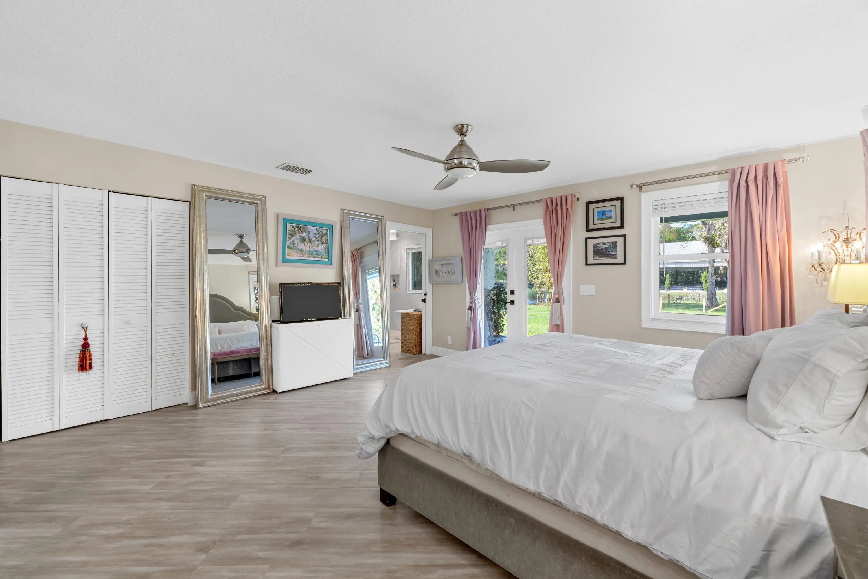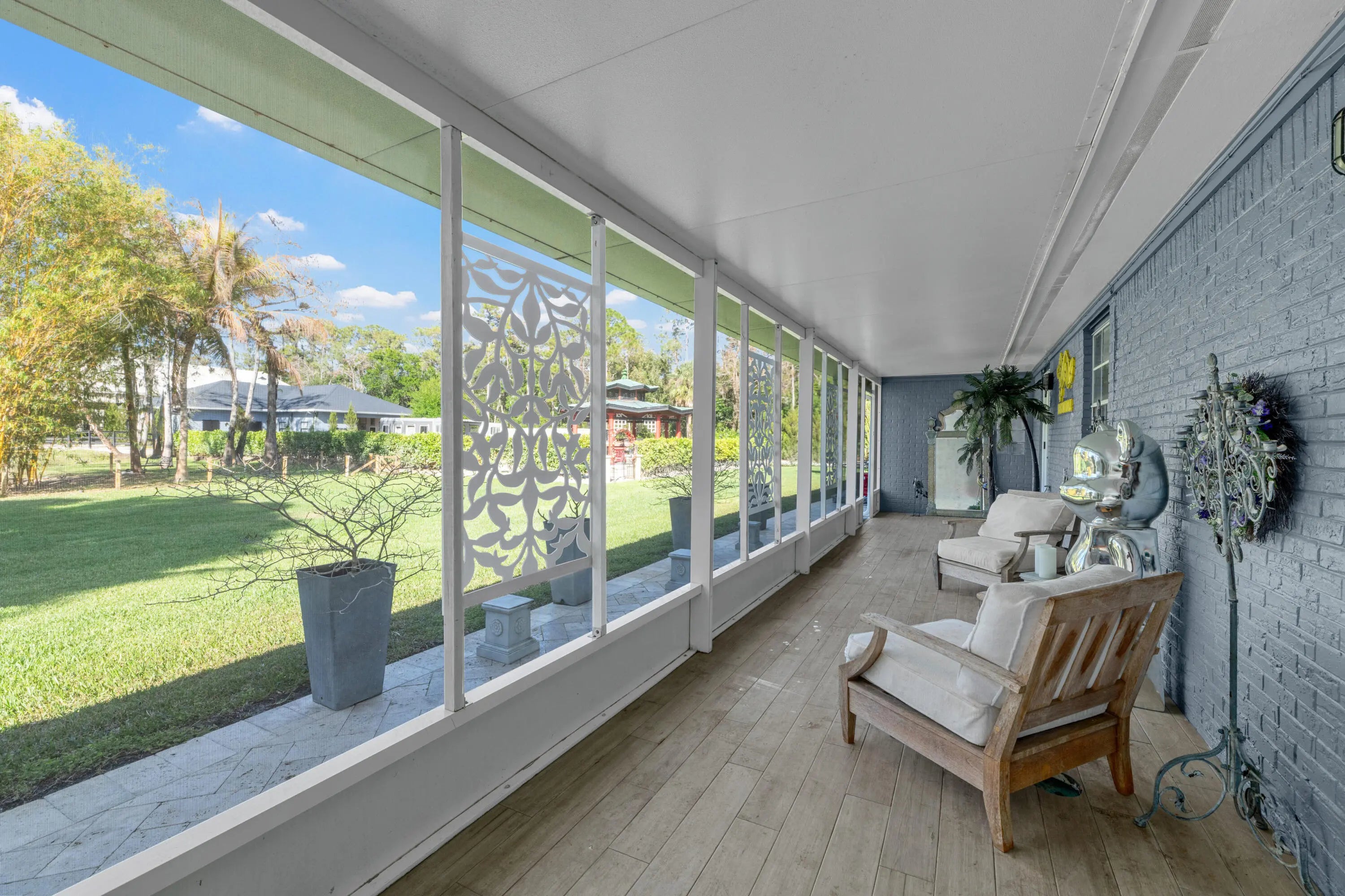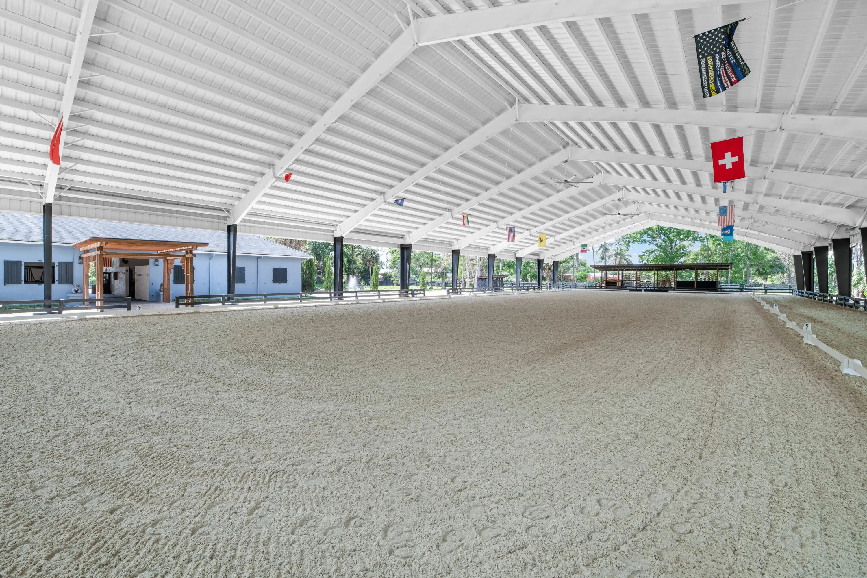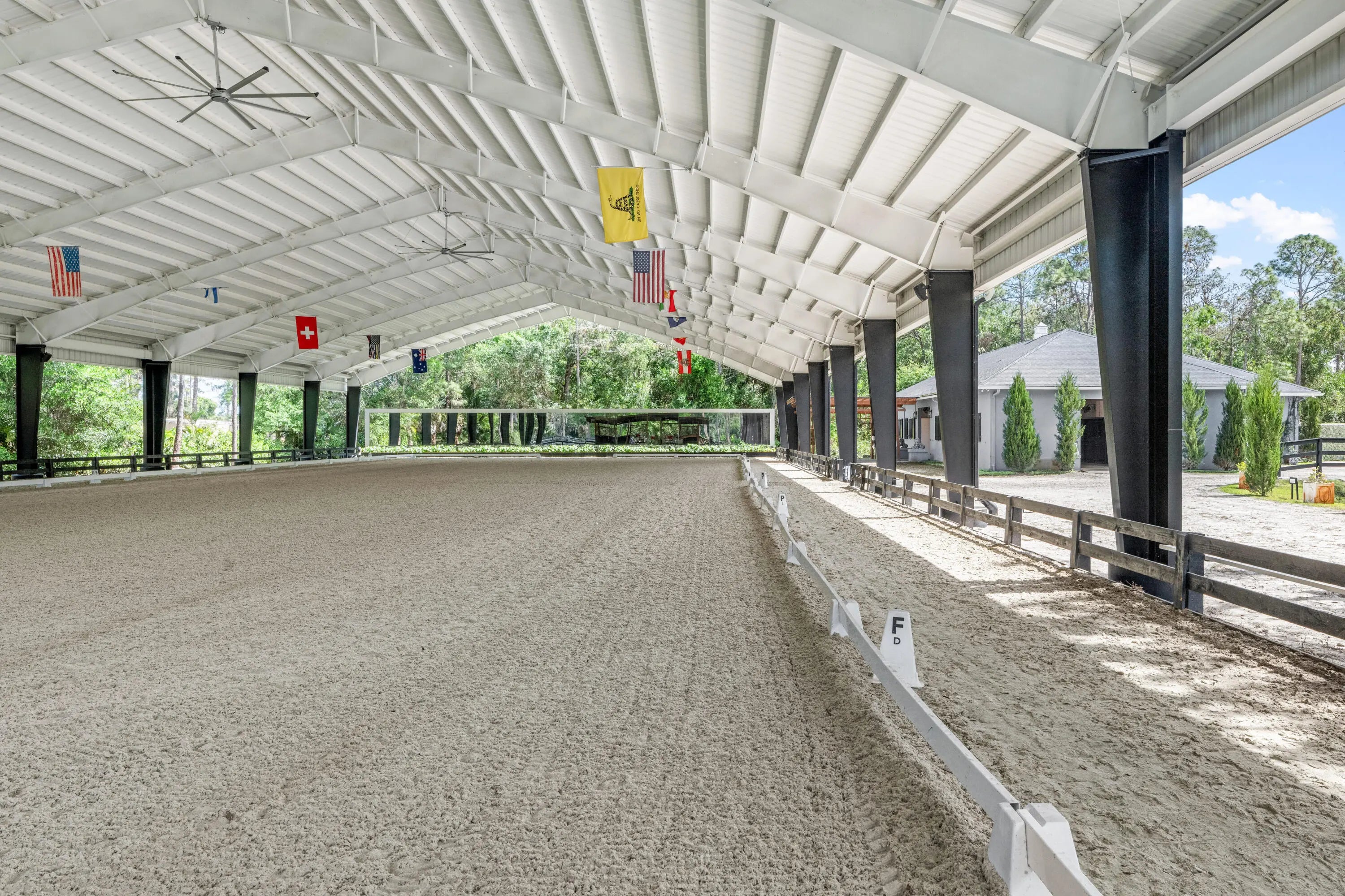 Set beneath a canopy of mature oak trees and just 13 minutes from Wellington International, this exceptional equestrian estate offers a rare blend of top-tier equestrian facilities and refined residential living, all within a private, beautifully landscaped five-acre setting. The property features two CBS barns totaling 17 stalls, thoughtfully designed with custom stall fronts, elegant chandeliers, and quality finishes throughout—creating a polished yet highly functional environment suited for both professional operations and private use. At the heart of the farm is a newly constructed 2022 covered arena (120 x 190). The arena is appointed with GGT footing, an advanced Ebb & Flow watering system, custom mirrors, and a spacious viewing area, delivering a consistent and elevated experience Supporting the facility are eight irrigated paddocks, a round pen, tack room with lounge, feed rooms, full bathroom with wood tile accents, laundry, and exceptional groom's quarters, offering a fully equipped, turnkey setup. The completely remodeled 5-bedroom, 3-bath residence seamlessly blends comfort and style. The chef's kitchen is centered around a dramatic 15-foot island with quartzite countertops, stainless steel appliances, and a wine chiller, ideal for both everyday living and entertaining. The primary suite offers a private retreat with a wood-burning fireplace, an expansive custom walk-in closet with seating area, and a beautifully appointed bath featuring dual vanities, a soaking tub, and a walk-in shower with dual shower heads. A guest ensuite bedroom provides additional comfort and flexibility for visitors. Outdoor living is equally impressive, with a private, fenced pool terrace finished in travertine with custom turf inlay, creating a clean, architectural aesthetic with a relaxed, resort-style feel. The grounds also feature a pond with a dock and seating area, a fenced dog park, and a gazebo ideal for entertaining or quiet evenings outdoors. Surrounded by lush landscaping and natural shade, the property offers both privacy and functionality, with a layout ideal for a boutique training operation or private equestrian retreat—just moments from the heart of Wellington's world-class competition venues.