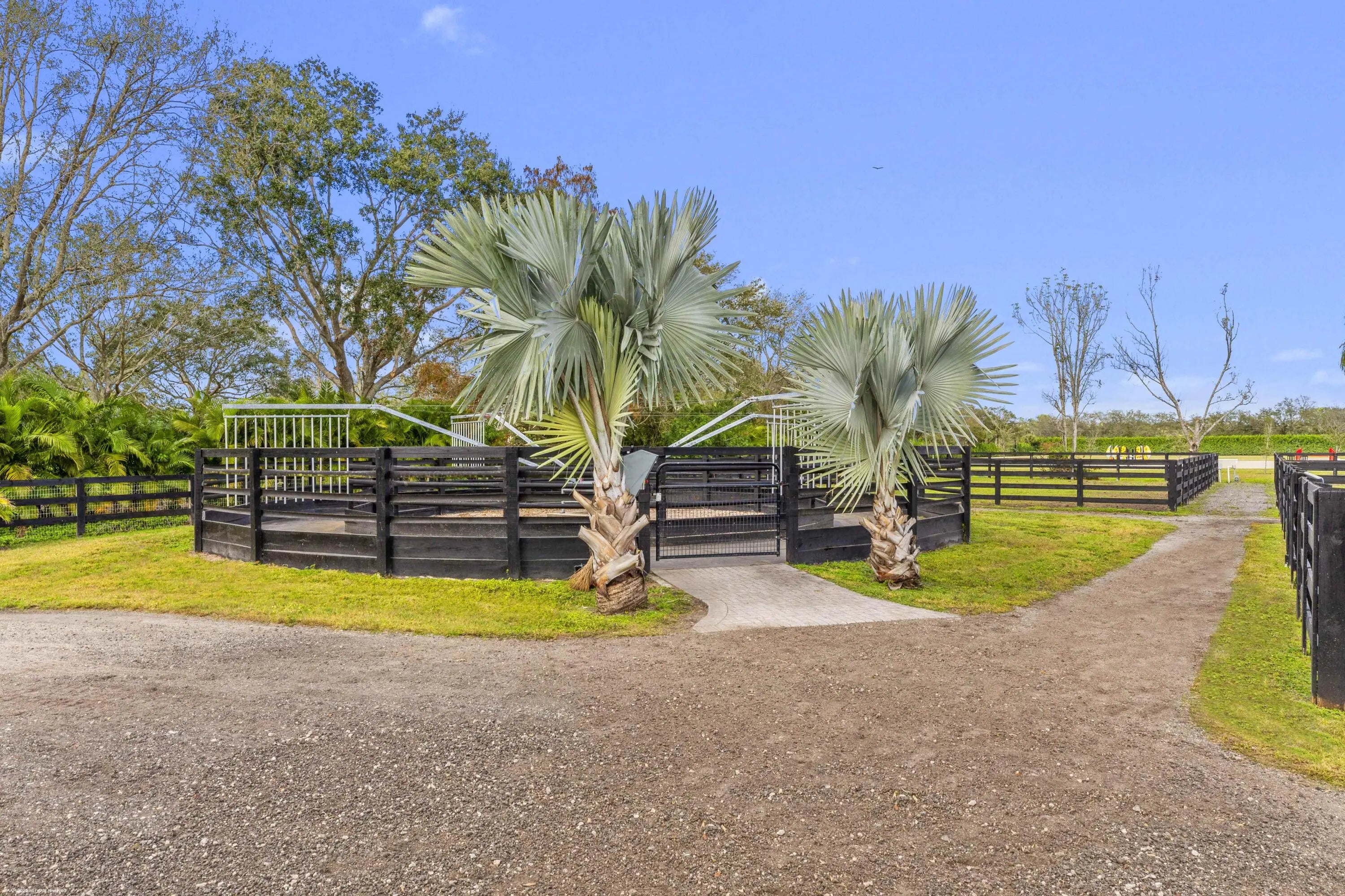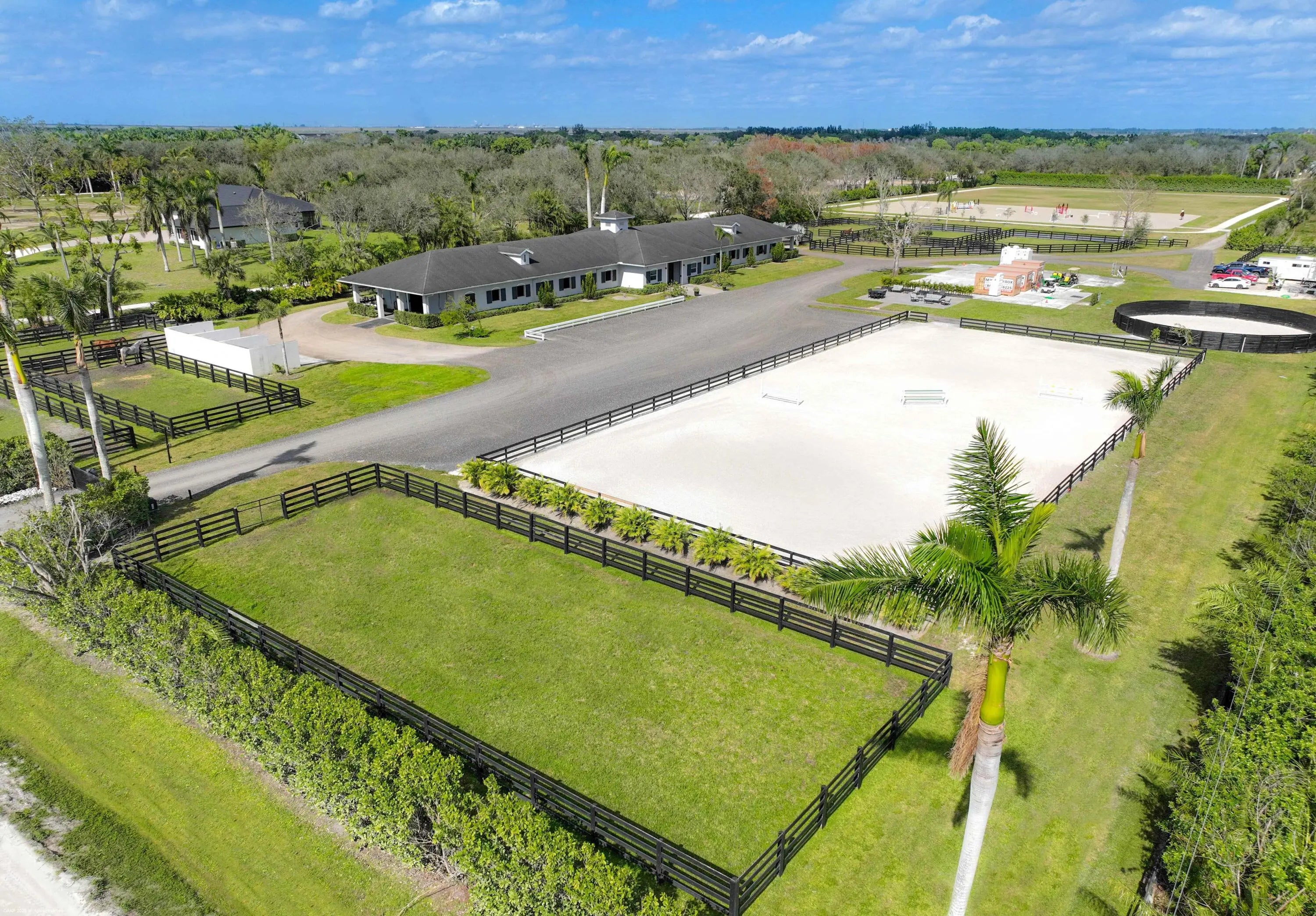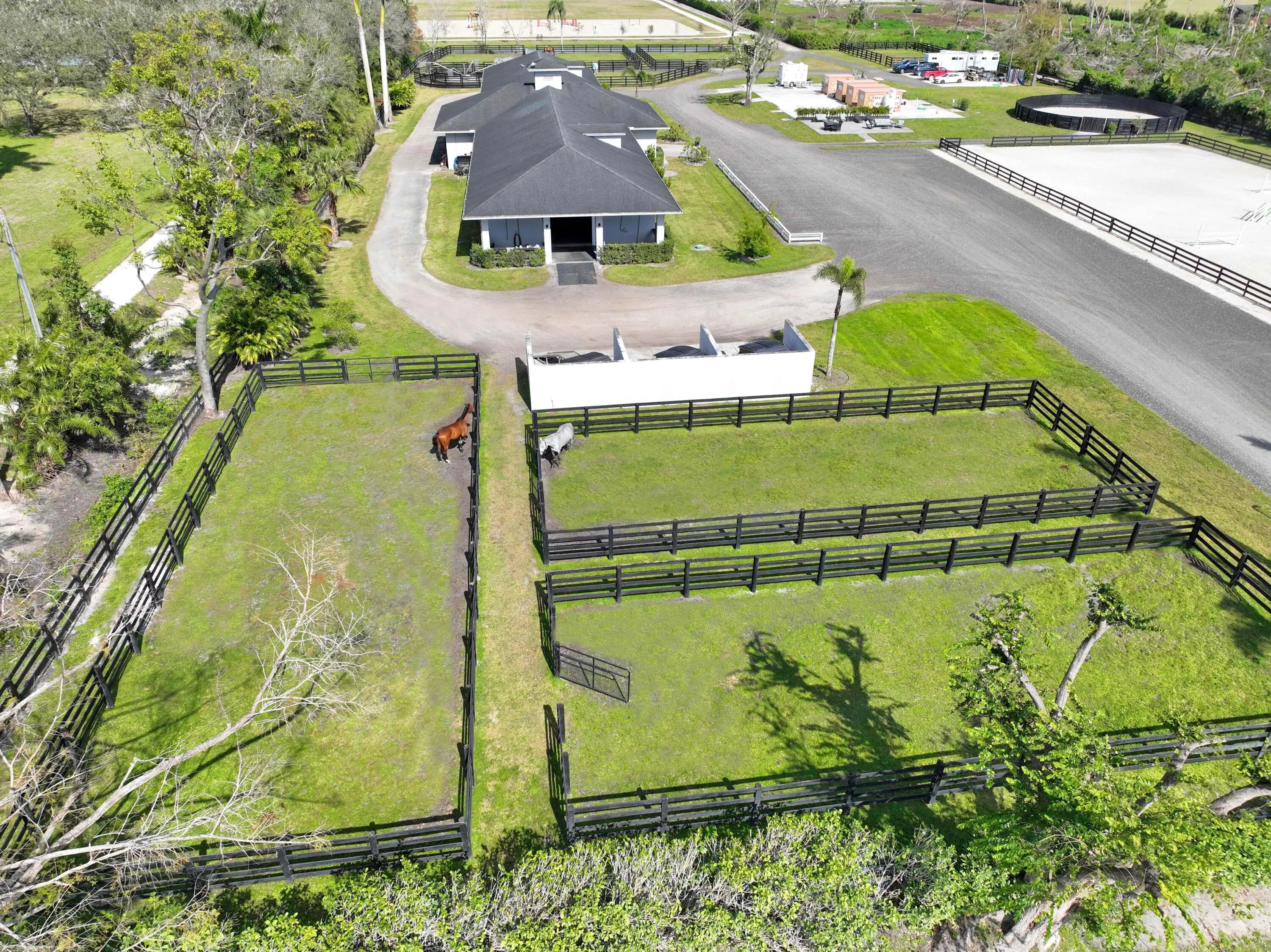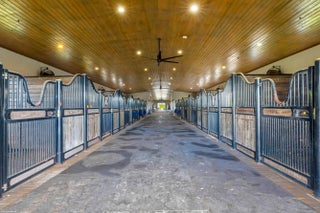 This 10 acre equestrian facility has frontage on both Norris Rd. & Deer Path Lane in Rustic Ranches Estates.. Built in 2018, the 24 stall center aisle CBS barn was designed by a true equestrian for optimal functionality and workflow. ADJACENT PROPERTY WITH HOUSE ALSO AVAILABLE! There are 4 blocks of 6 stalls, each with its own tack room. Each half of the barn has its own laundry room, feed room/storage and is equipped with ample grooming stations and wash stalls. The 250'x150' all weather arena by Gould is complimented by a large (280'x280') grass derby field and 1/4 mile exercise track. There is a second arena 100'x200' (that can be covered), 10 paddocks, a 4 horse walker and a round pen. There is a tent pad in place with water, electricity and 2 wash stalls for ten 10 additional stalls. 24 stall barn 4 tack rooms 2 laundry rooms 2 feed rooms 4 interior grooming stalls 4 exterior but covered wash stalls 2 riding arenas (w/ full drainage and irrigation)(250'x150')(100'x200') Walker (4 horse) (MK Walker) Grass riding field ~2.2 acres (~280'x280') Exercise Track ~ 1/4 mile around 10 paddocks 10 acres unified into one parcel 2 Rv hookups 2 septics for wash stalls 1 septic for future construction Property is on city water Irrigation is from a well and pond