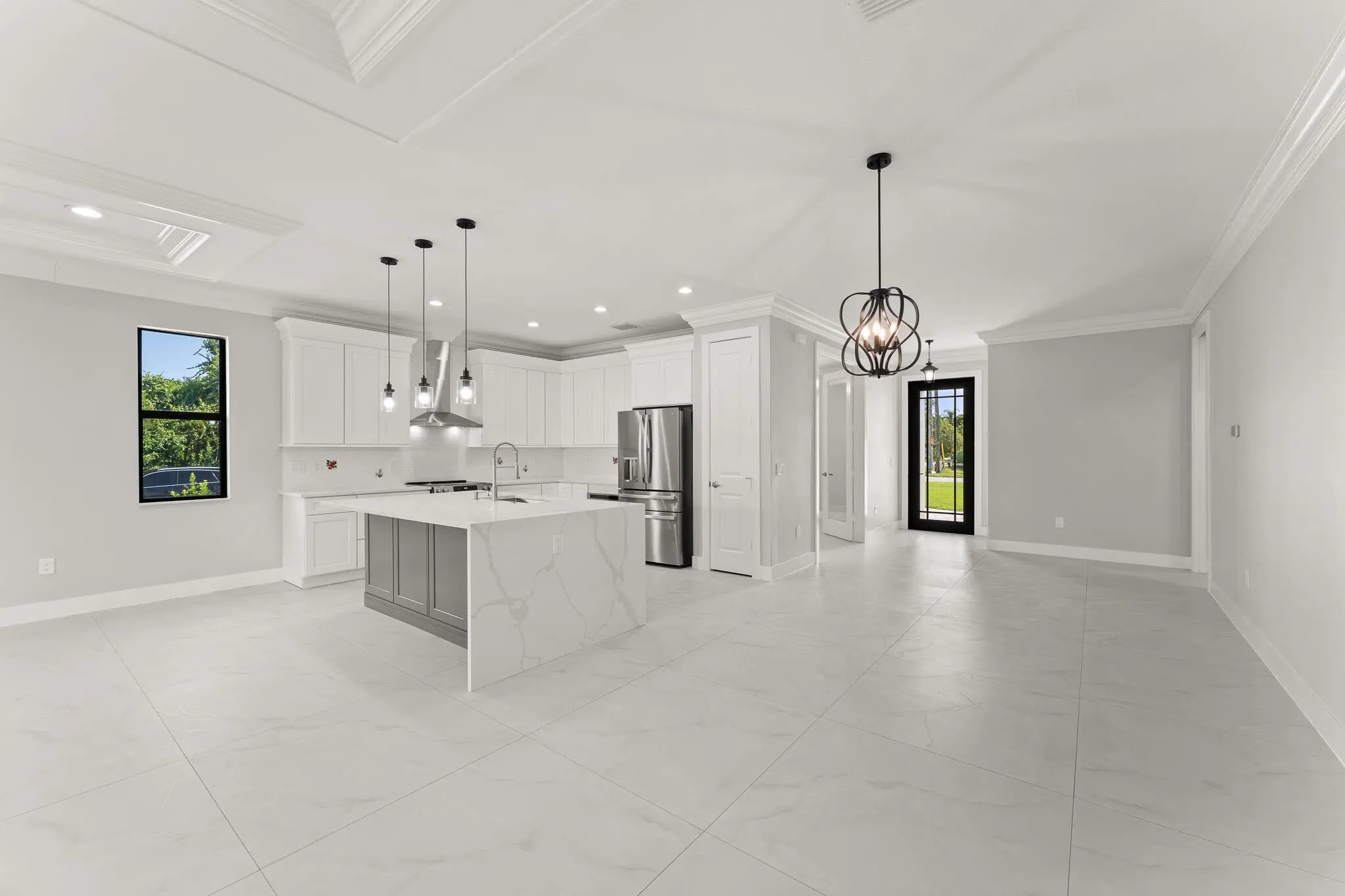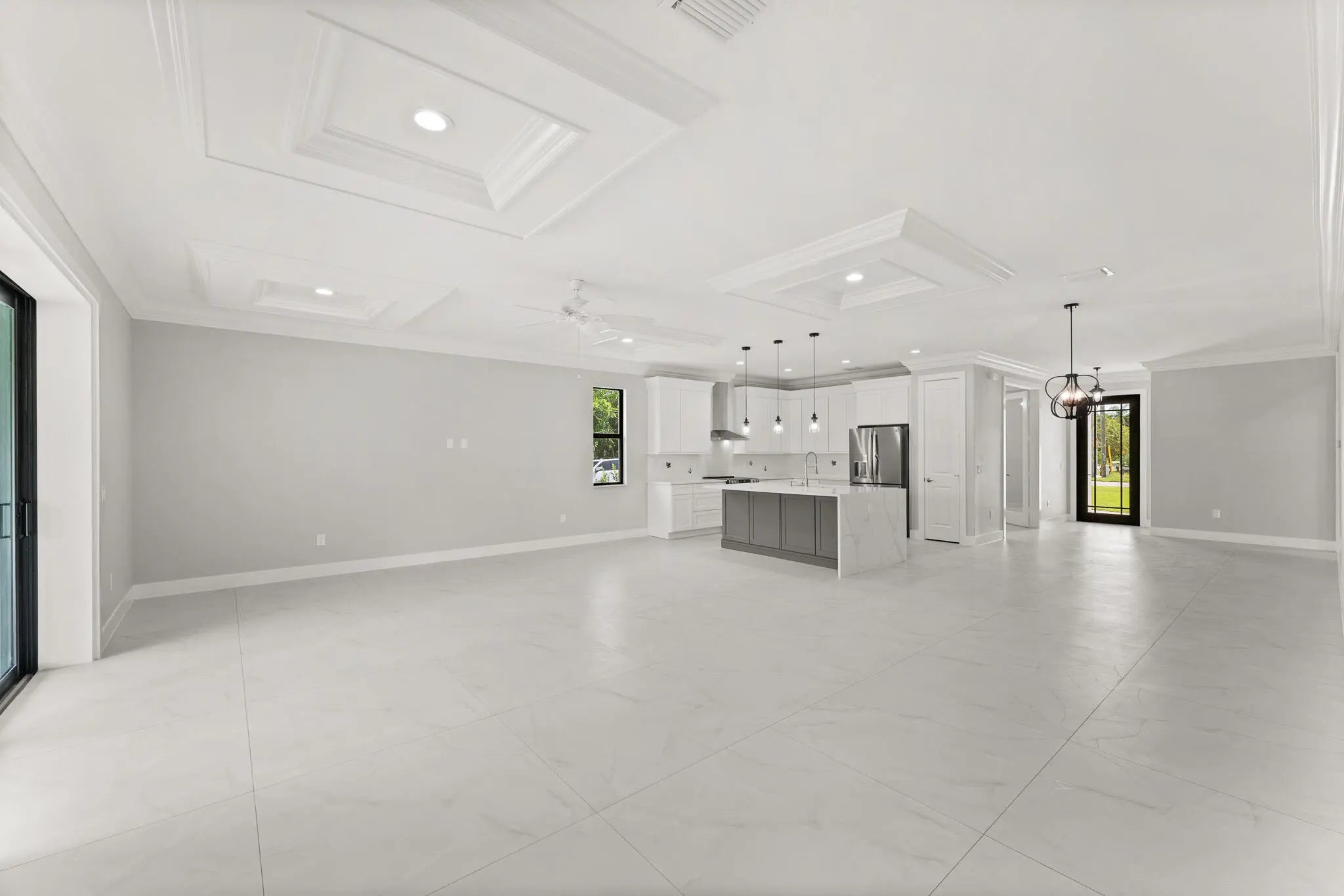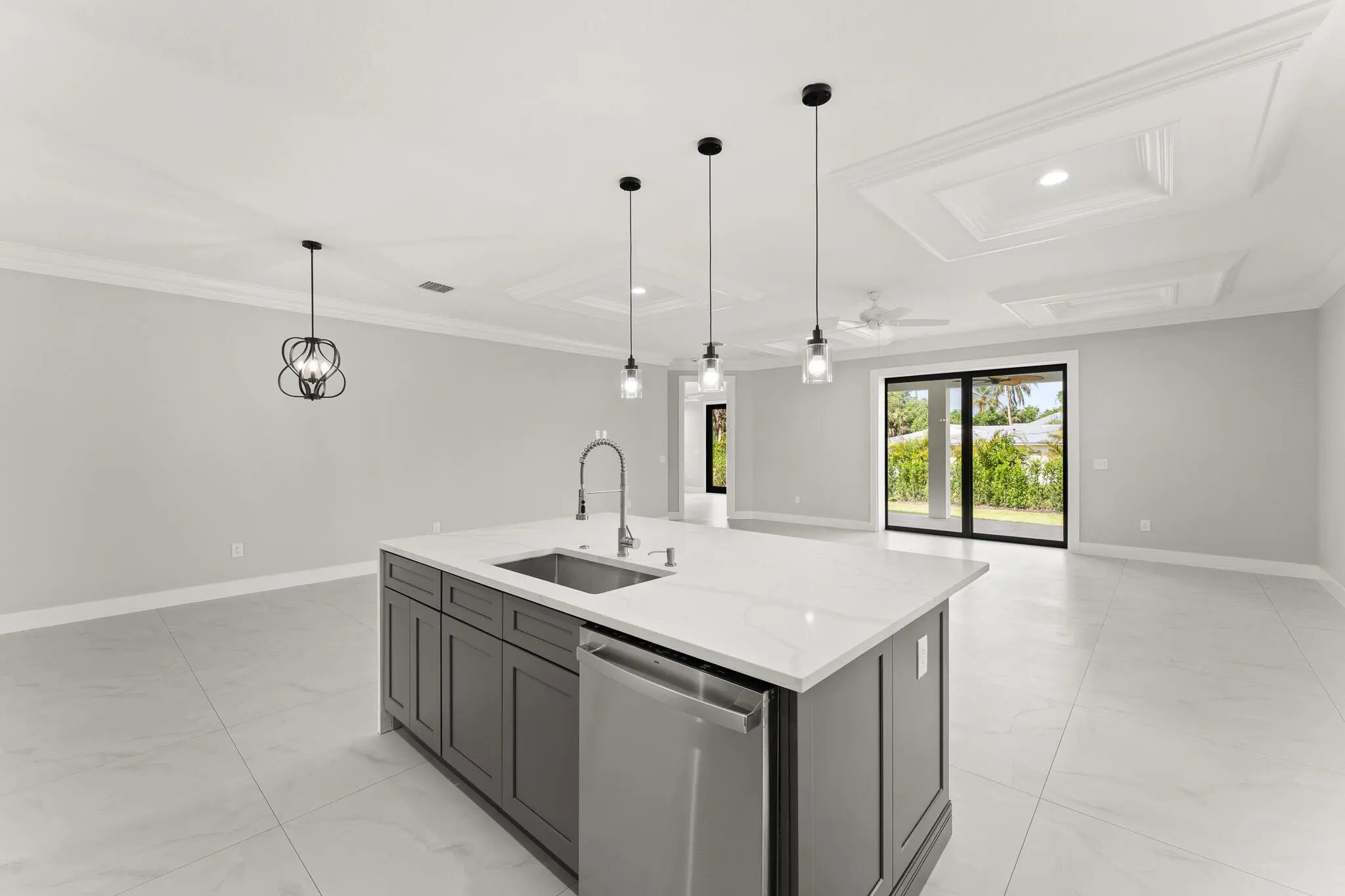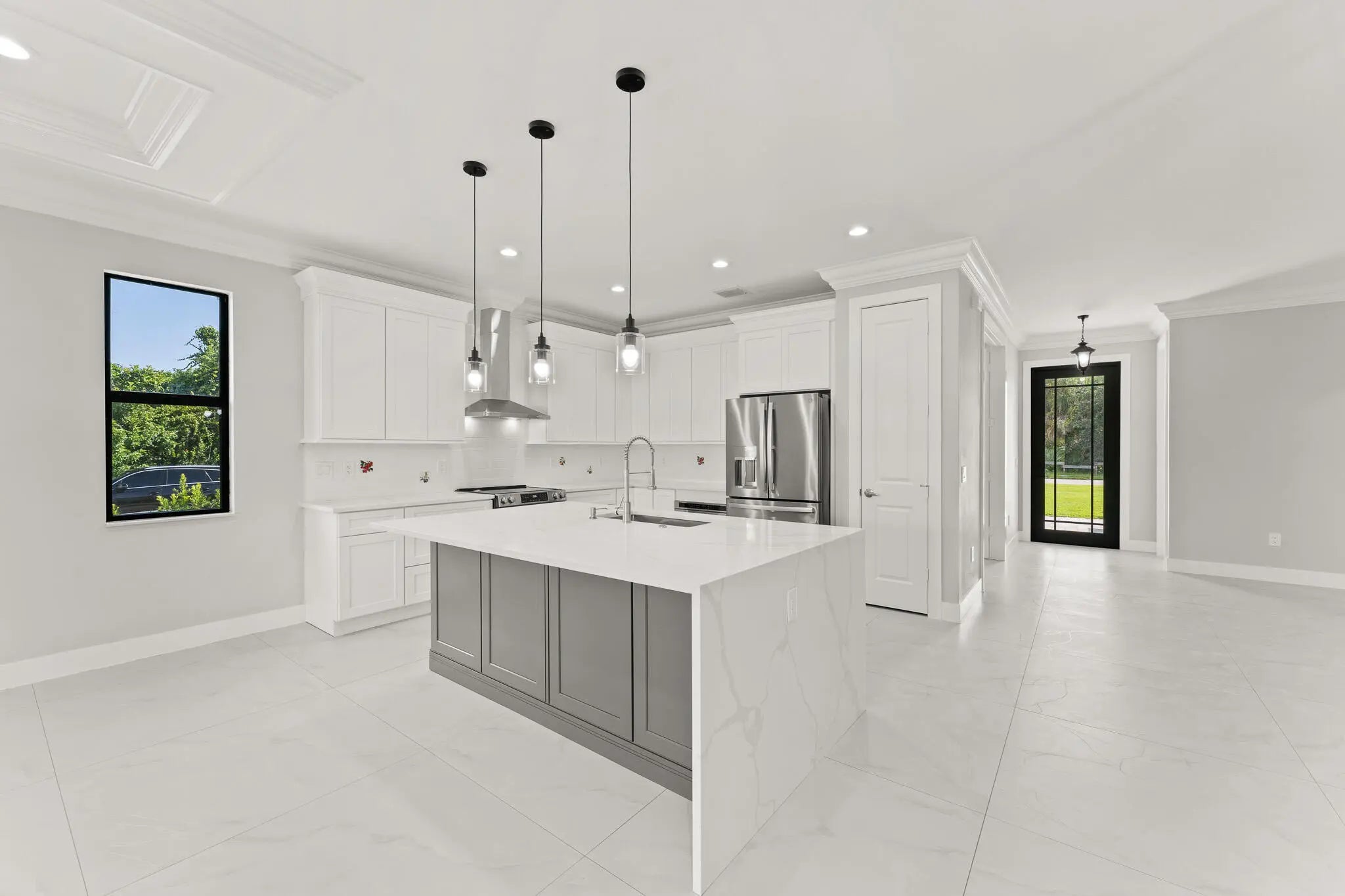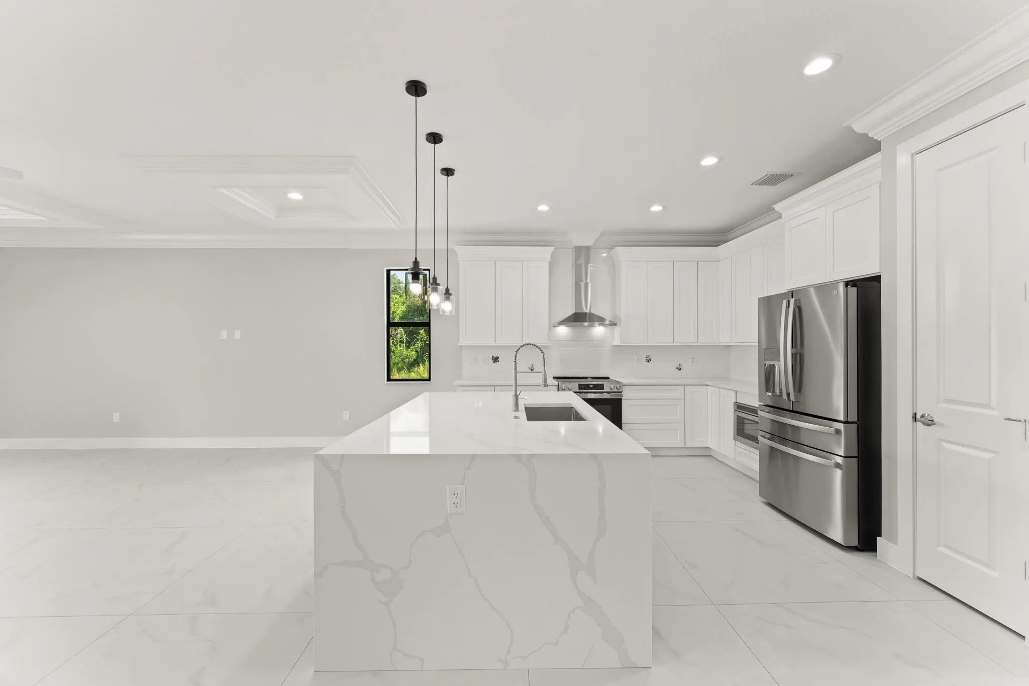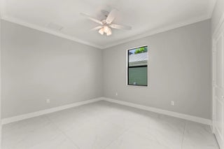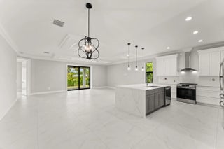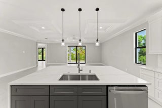 This thoughtfully designed 3 bedroom + den, 2.5 bath estate blends charm, quality, and convenience in one beautiful new build. Located just minutes from public boat ramps, Sandsprit Park and Port Salerno's waterfront dining, this home is the perfect blend of lifestyle and location. Inside, enjoy an open-concept design with quartz countertops, a waterfall eat-in island, wood cabinetry and luxury porcelain tile throughout. Tray ceilings, crown molding, recessed lighting and ceiling fans add elegance and comfort. Built for peace of mind and longevity with impact windows and doors, metal roof and stucco exterior. Relax on the elevated front or back patio with fresh coastal breezes. The oversized 10' garage door and large lot offer space for your boat, RV or future pool. No HOA.