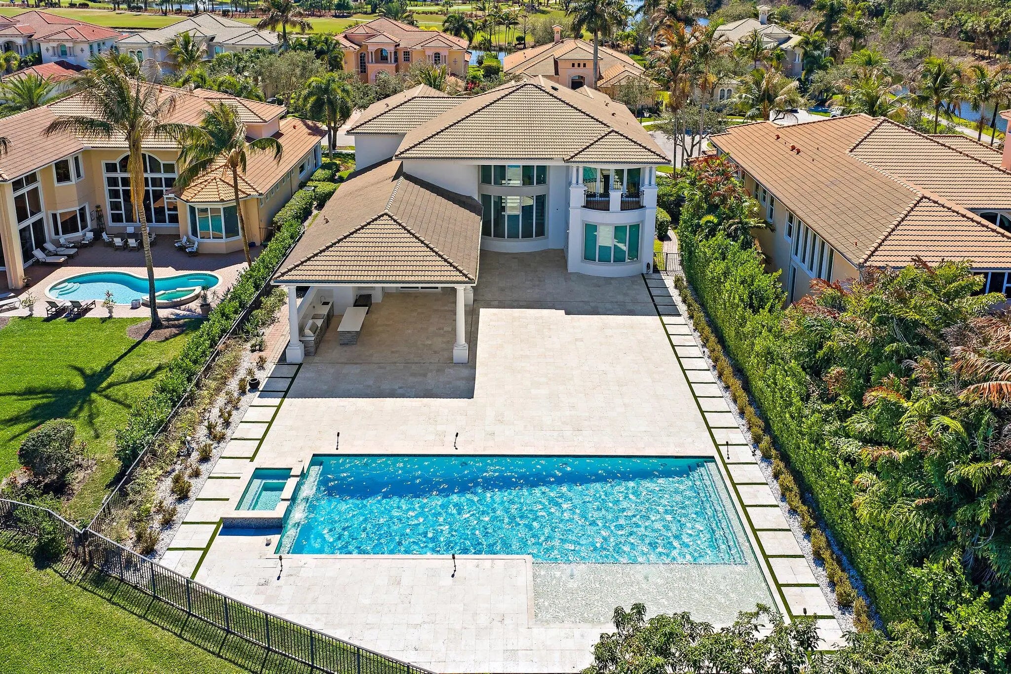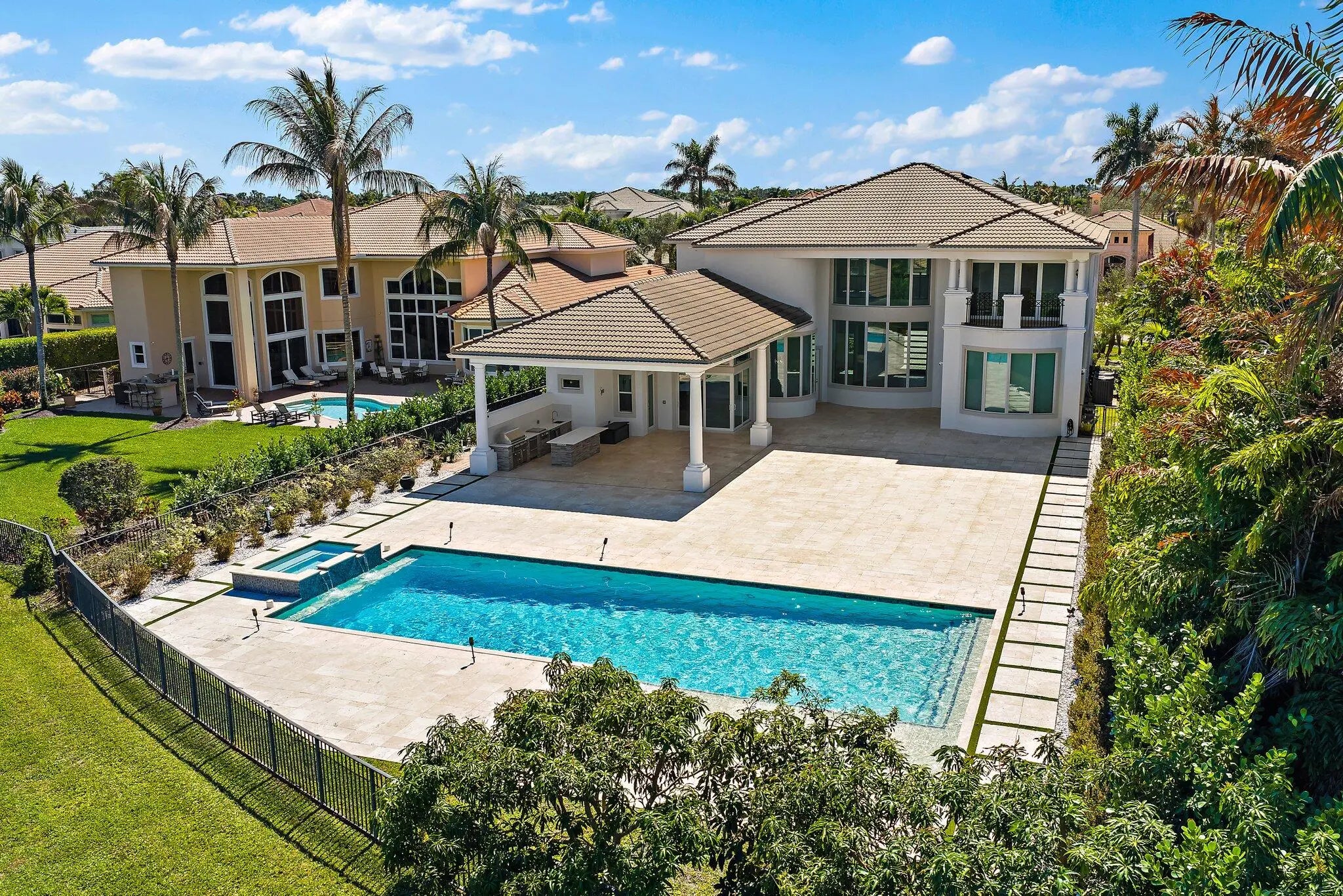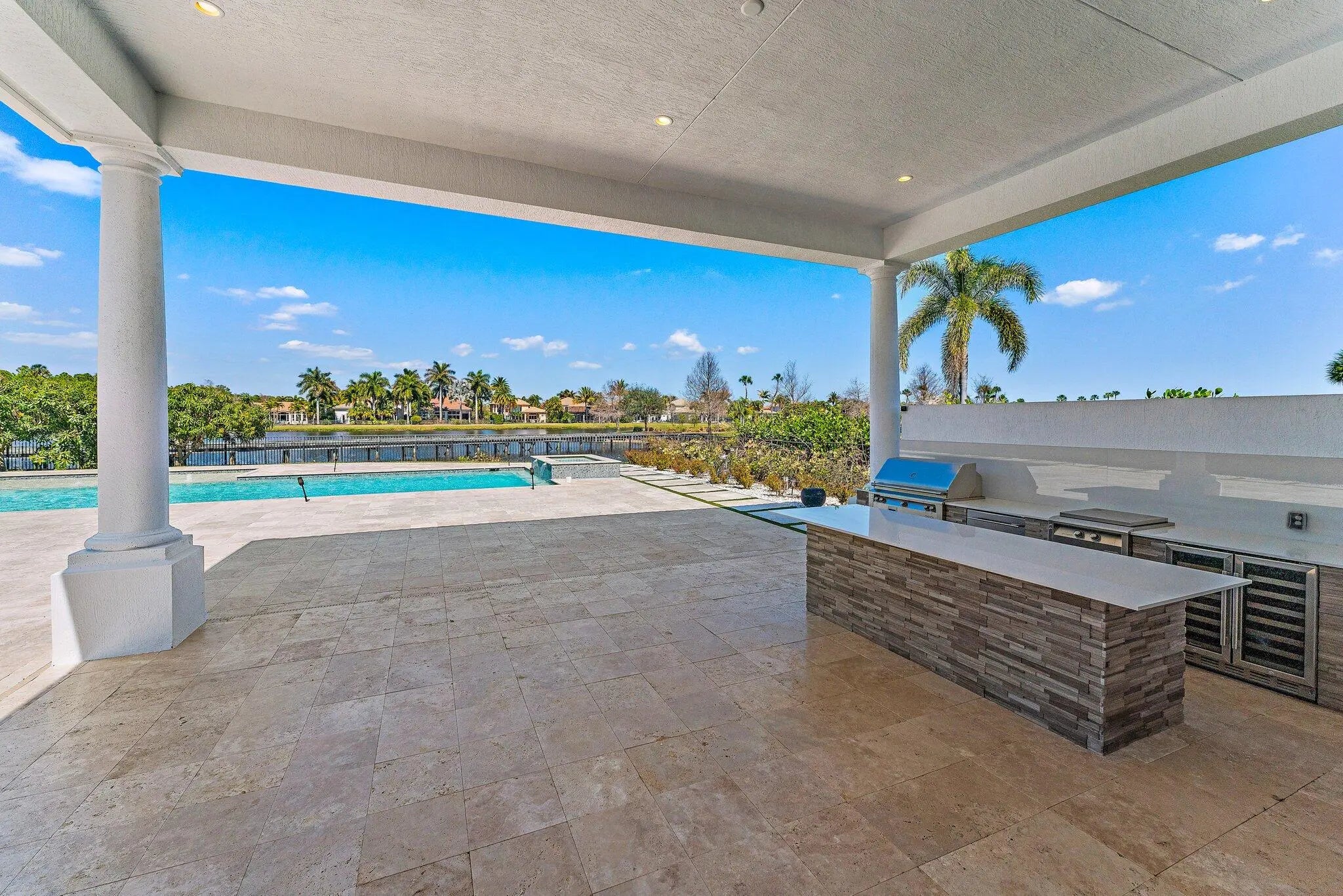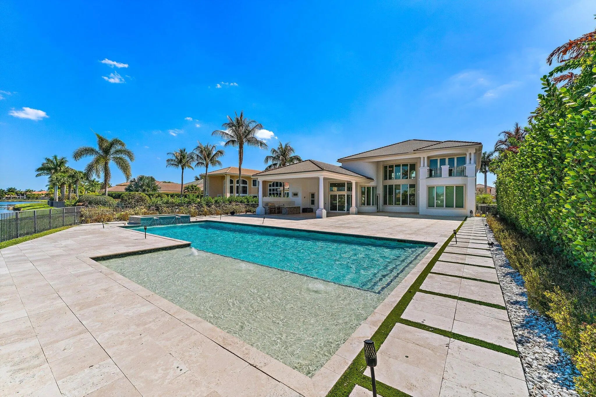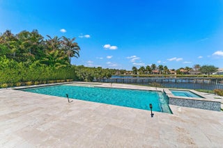Exquisitely crafted in 2019 and designed to the highest standards, this extraordinary custom residence offers the perfect blend of architectural drama, refined luxury, and effortless indoor outdoor living. From the moment you arrive, the striking high end front door makes a bold statement as it cantilevers open, setting the tone for what lies beyond. As one of the newer homes in Jupiter Country Club and situated on one of the largest lots in the entire community, this property offers a rare combination of modern construction, expansive outdoor space, and premier positioning that is increasingly difficult to find. Step inside to a breathtaking grand entry featuring 25 foot coffered ceilings and dramatic walls of glass that flood the home with natural light throughout the day. The expansive floor plan was thoughtfully designed for a large family who loves to entertain, offering generous gathering spaces balanced with private retreats. The ultra sleek white custom gourmet kitchen is a true showpiece, complete with a waterfall edge center island, porcelain flooring, and seamless flow into the main living and dining areas. The owner's suite is a private sanctuary with floor to ceiling windows, oversized his and hers walk in closets, and a dedicated dressing area. Luxe finishes and elevated design details are showcased in every room. Freshly painted inside and out, this home has been meticulously cared for and shows like a brand new residence. Every space reflects pride of ownership and thoughtful maintenance. Outdoors, the property transforms into a private resort. The expansive travertine deck surrounds a stunning 50 by 20 custom pool and spa, complemented by a fully equipped outdoor kitchen, multiple dining and lounging areas, and sweeping long lake views that create the ultimate backdrop for entertaining. Located within the prestigious gated community of Jupiter Country Club, residents enjoy a lifestyle built around the renowned Greg Norman designed golf course, along with two resort style pools, a state of the art fitness center, lighted tennis courts, and exceptional clubhouse dining. The location is simply unmatched. Just minutes to the pristine beaches of Jupiter, world class waterfront dining, upscale shopping, and convenient access to I 95 and the Florida Turnpike, this home places you in the heart of everything while still offering privacy and exclusivity. This is more than a home. It is a statement property designed for those who value quality, space, and a vibrant South Florida lifestyle.