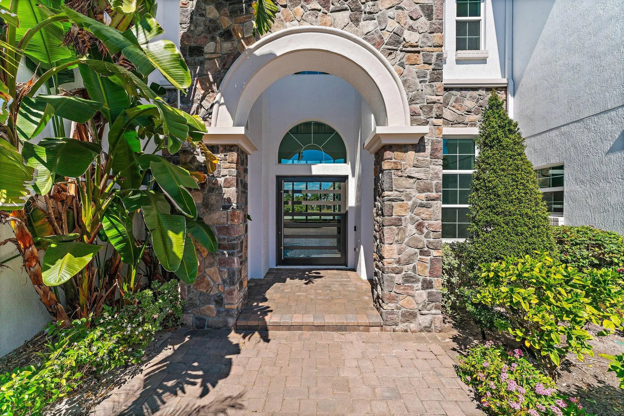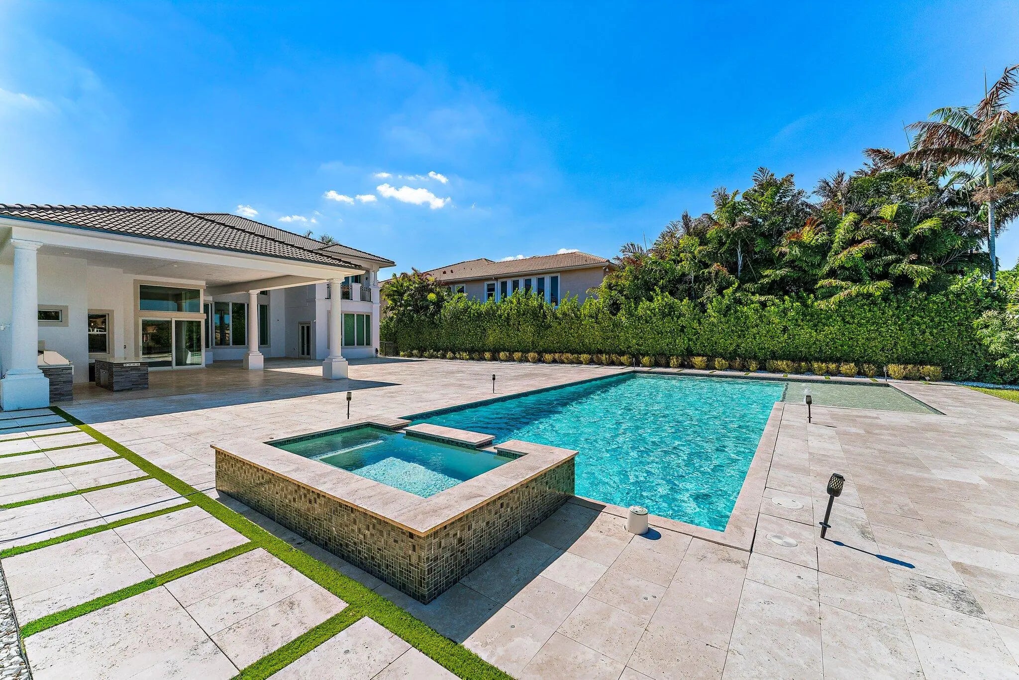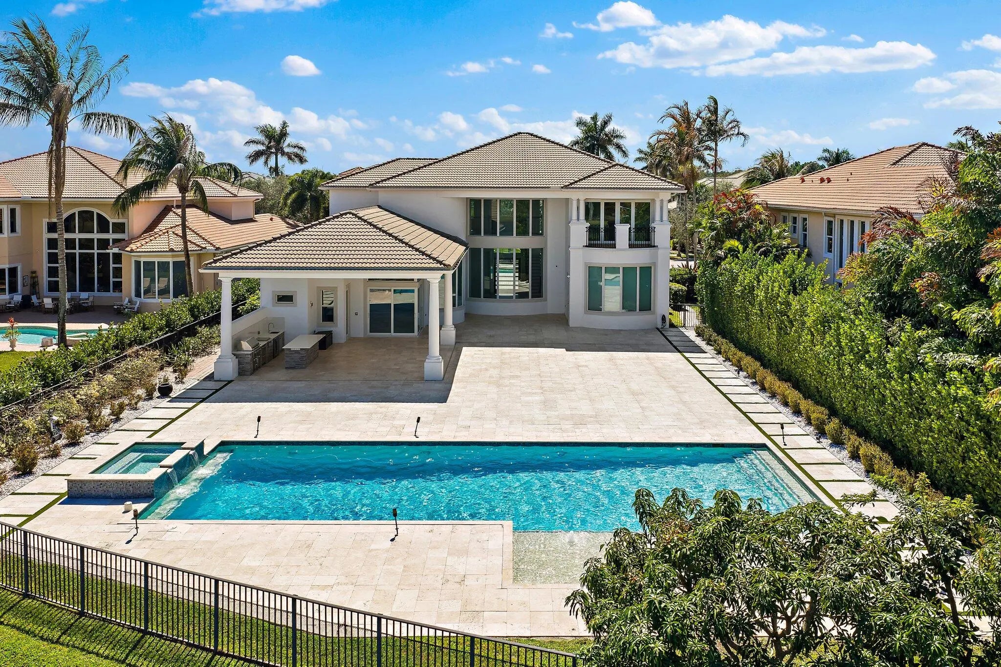 Exquisitely crafted in 2019 and designed to the highest standards, this extraordinary custom residence offers the perfect blend of architectural drama, refined luxury, and effortless indoor outdoor living. From the moment you arrive, the striking high end front door makes a bold statement as it cantilevers open, setting the tone for what lies beyond. As one of the newer homes in Jupiter Country Club and situated on one of the largest lots in the entire community, this property offers a rare combination of modern construction, expansive outdoor space, and premier positioning that is increasingly difficult to find. Step inside to a breathtaking grand entry featuring 25 foot coffered ceilings and dramatic walls of glass that flood the home with natural light throughout the day. The expansive floor plan was thoughtfully designed for a large family who loves to entertain, offering generous gathering spaces balanced with private retreats. The ultra sleek white custom gourmet kitchen is a true showpiece, complete with a waterfall edge center island, porcelain flooring, and seamless flow into the main living and dining areas. The owner's suite is a private sanctuary with floor to ceiling windows, oversized his and hers walk in closets, and a dedicated dressing area. Luxe finishes and elevated design details are showcased in every room. Freshly painted inside and out, this home has been meticulously cared for and shows like a brand new residence. Every space reflects pride of ownership and thoughtful maintenance. Outdoors, the property transforms into a private resort. The expansive travertine deck surrounds a stunning 50 by 20 custom pool and spa, complemented by a fully equipped outdoor kitchen, multiple dining and lounging areas, and sweeping long lake views that create the ultimate backdrop for entertaining. Located within the prestigious gated community of Jupiter Country Club, residents enjoy a lifestyle built around the renowned Greg Norman designed golf course, along with two resort style pools, a state of the art fitness center, lighted tennis courts, and exceptional clubhouse dining. The location is simply unmatched. Just minutes to the pristine beaches of Jupiter, world class waterfront dining, upscale shopping, and convenient access to I 95 and the Florida Turnpike, this home places you in the heart of everything while still offering privacy and exclusivity. This is more than a home. It is a statement property designed for those who value quality, space, and a vibrant South Florida lifestyle.