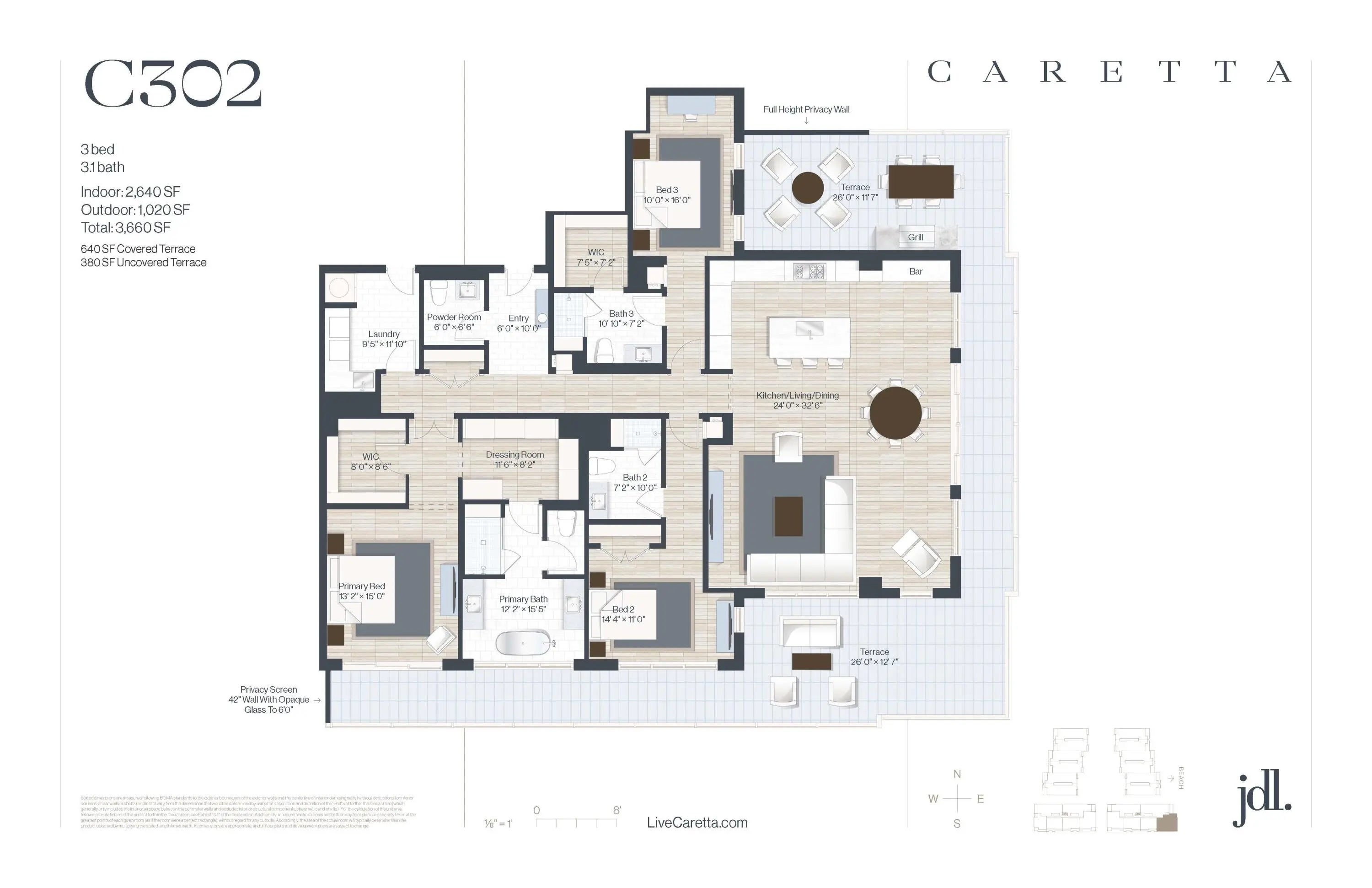 Juno Beach's newest seaside urban community, Caretta! Sales center now open. This corner unit offers all the modern luxuries including a chef's kitchen featuring wolf stove, sub-zero refrigeration and a spacious island with waterfall countertops, elegant features, and 10' ceilings. Enjoy Florida living with a wrap around outdoor terrace and outdoor kitchen with a built-in gas grill. Caretta is Juno's newest luxury development with amenities including rooftop pool, sauna, dog park, fitness center, golf simulator, and restaurant. Just 400 yards to the beach. Since 1993, JDL Development has earned a reputation for developing luxury developments that exceed expectations, resulting in some of Chicago's most significant developments like One Chicago and No.9 Walton.