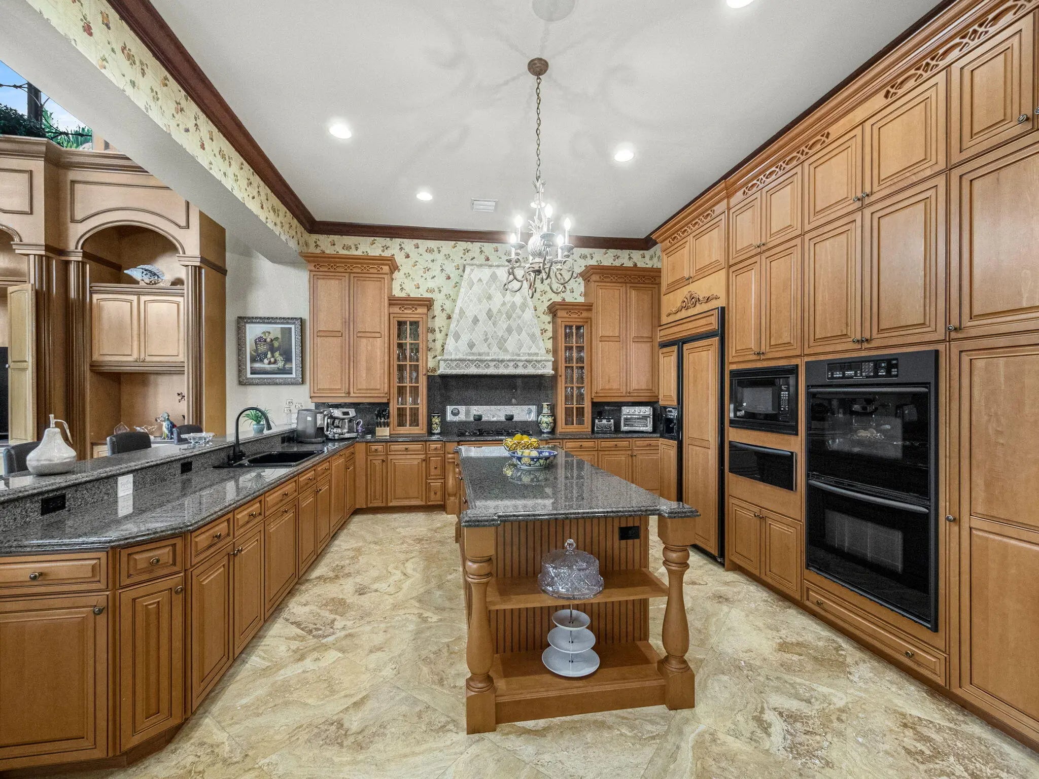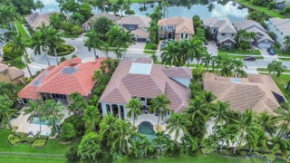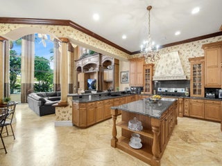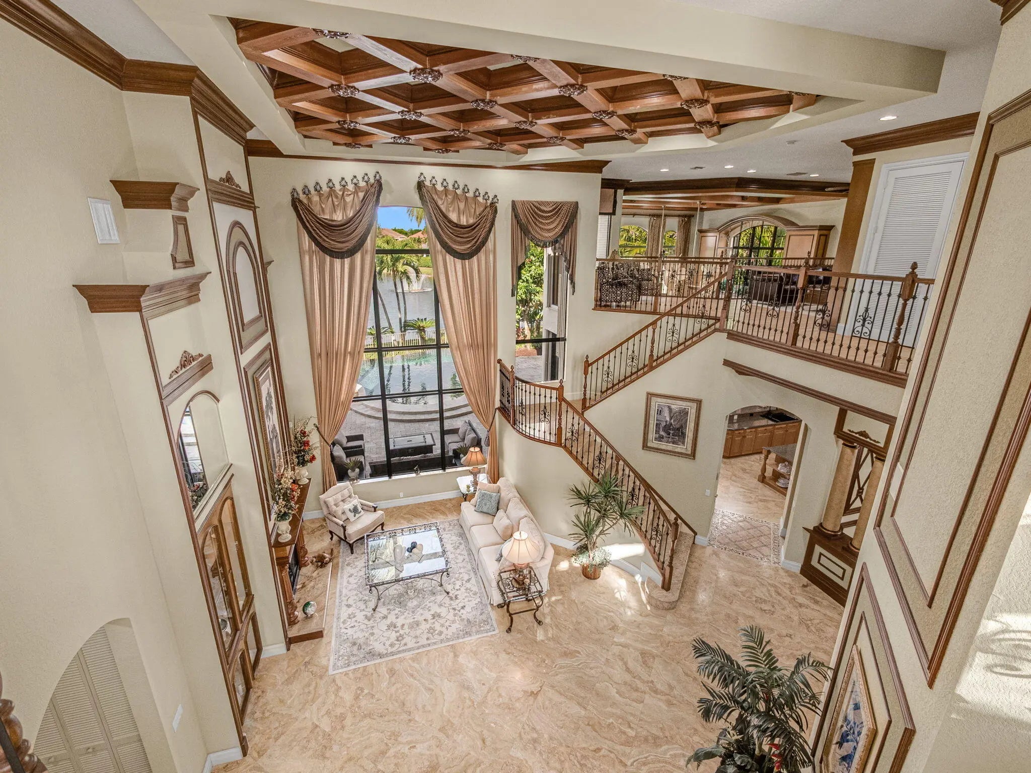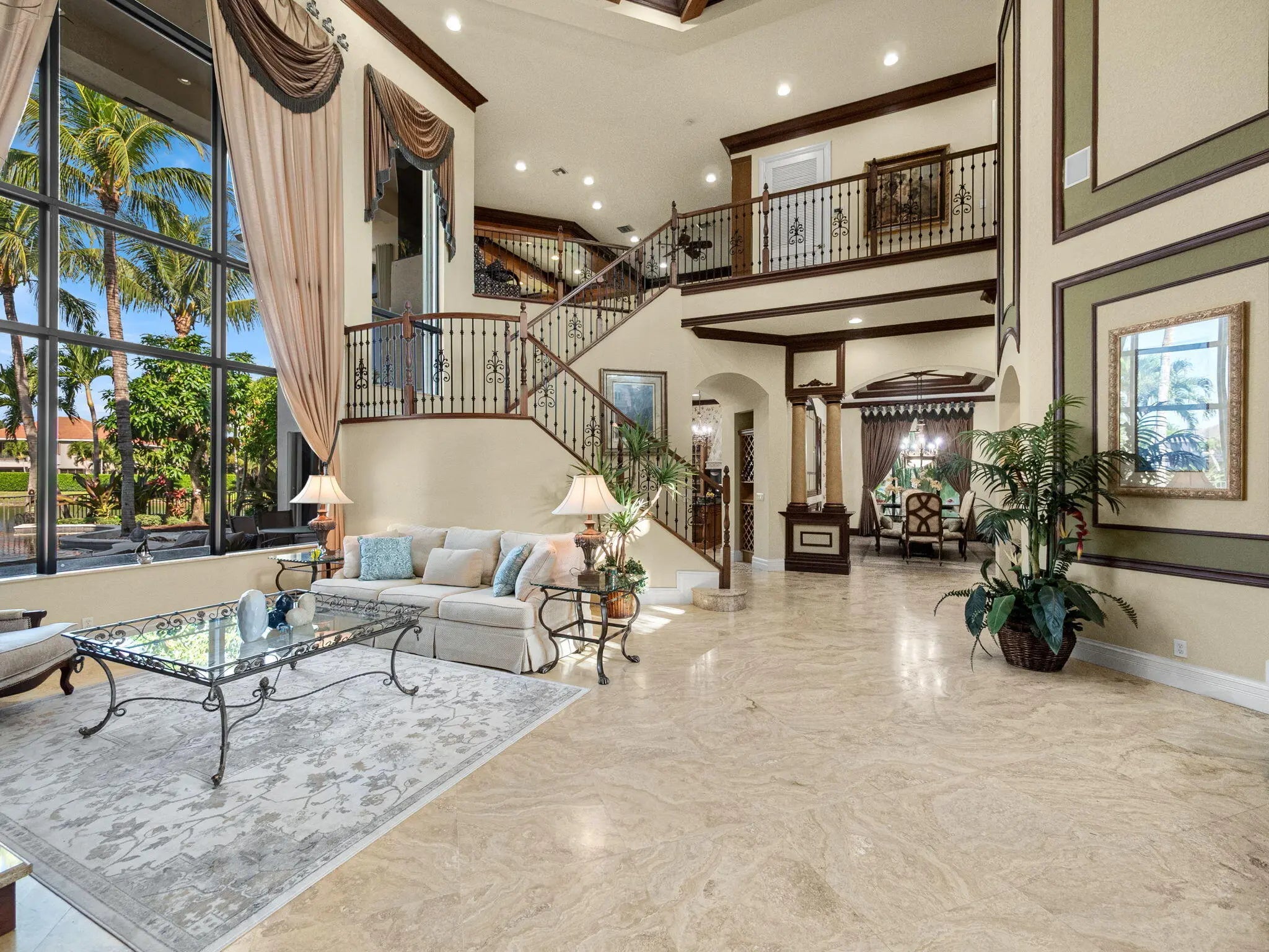 Magnificent former builder's model in Wellington's upscale Versailles sits on a breathtaking lakefront lot with an infinity-edge heated saltwater pool and spa ,travertine tile patio, outdoor kitchen and mango trees. Offering 5 bedrooms 6 1/2 baths and a 3 car garage, this Marseilles model also includes an executive office/library a theater and a spacious loft. Dramatic soaring 23 foot coffered ceilings and the French inspired architectural designs, stately columns, beautified walls, saturnia marble floors, multiple inlaid mosaic insets and diverse custom ceilings, accentuate the uniqueness of this estate home. In 2024,the roof was replaced, complete water filtration system was installed as was LVP flooring in the bedrooms and loft. In 2023 impact doors were installed and a whole house