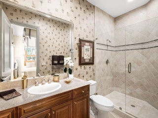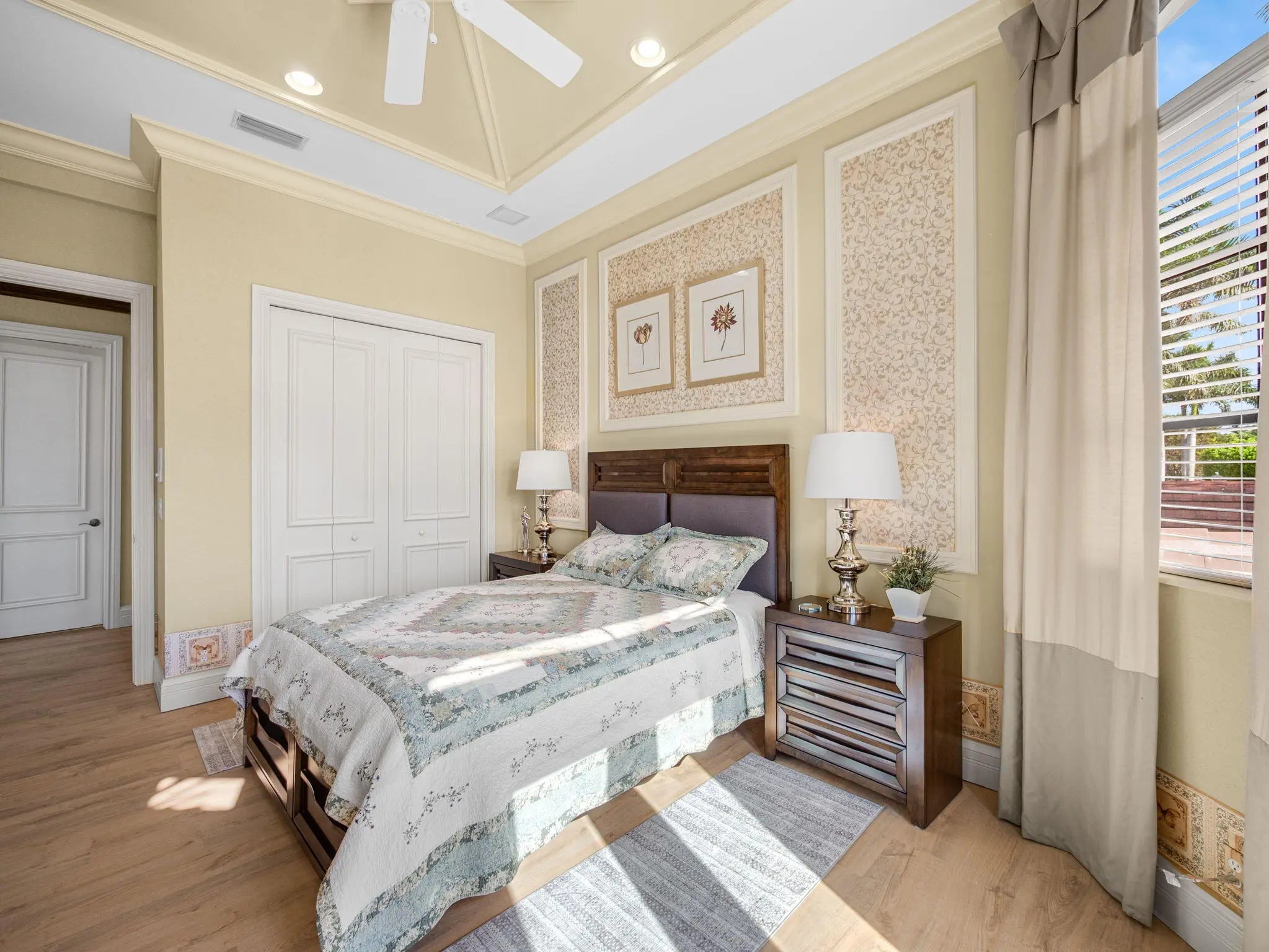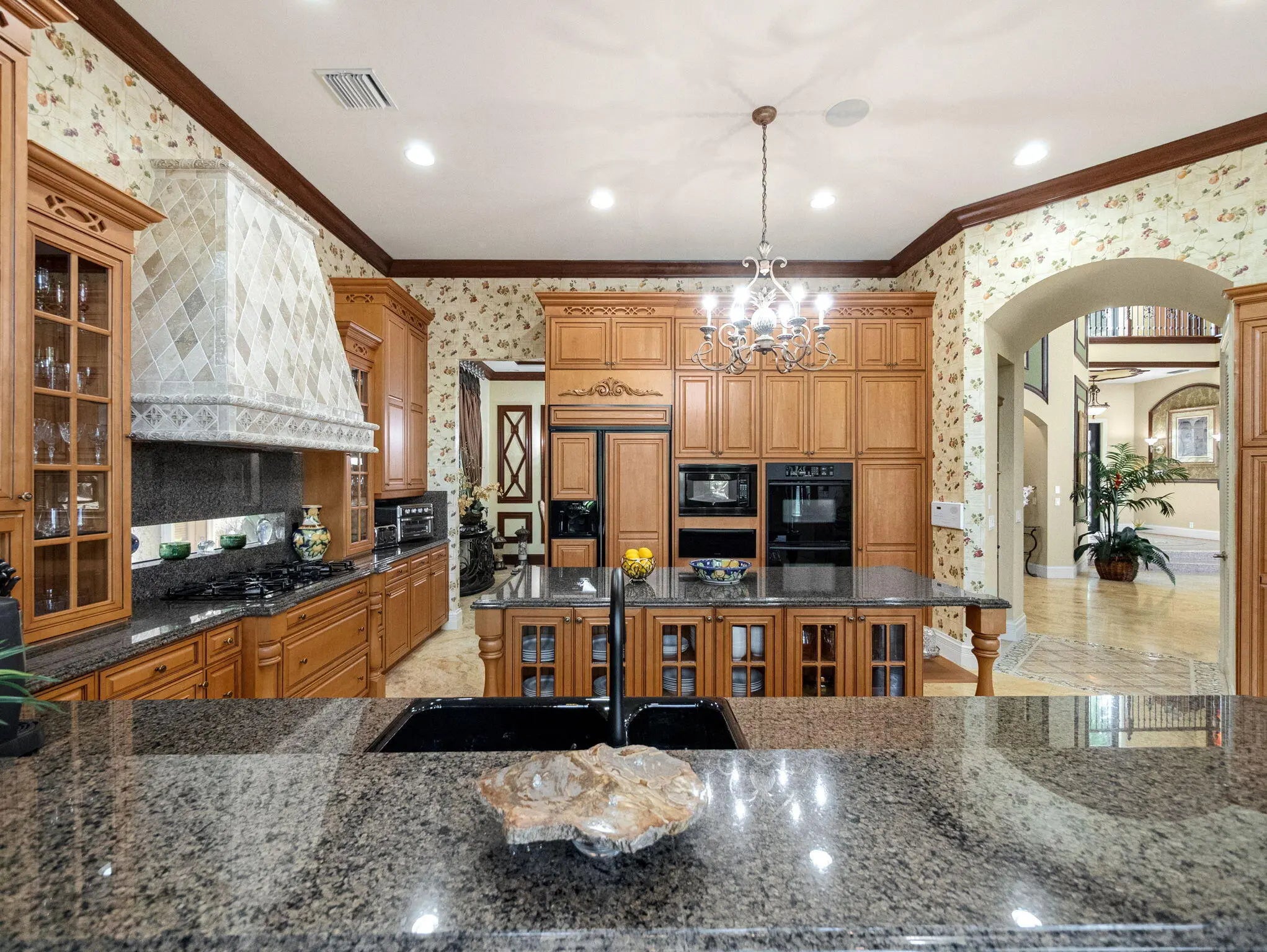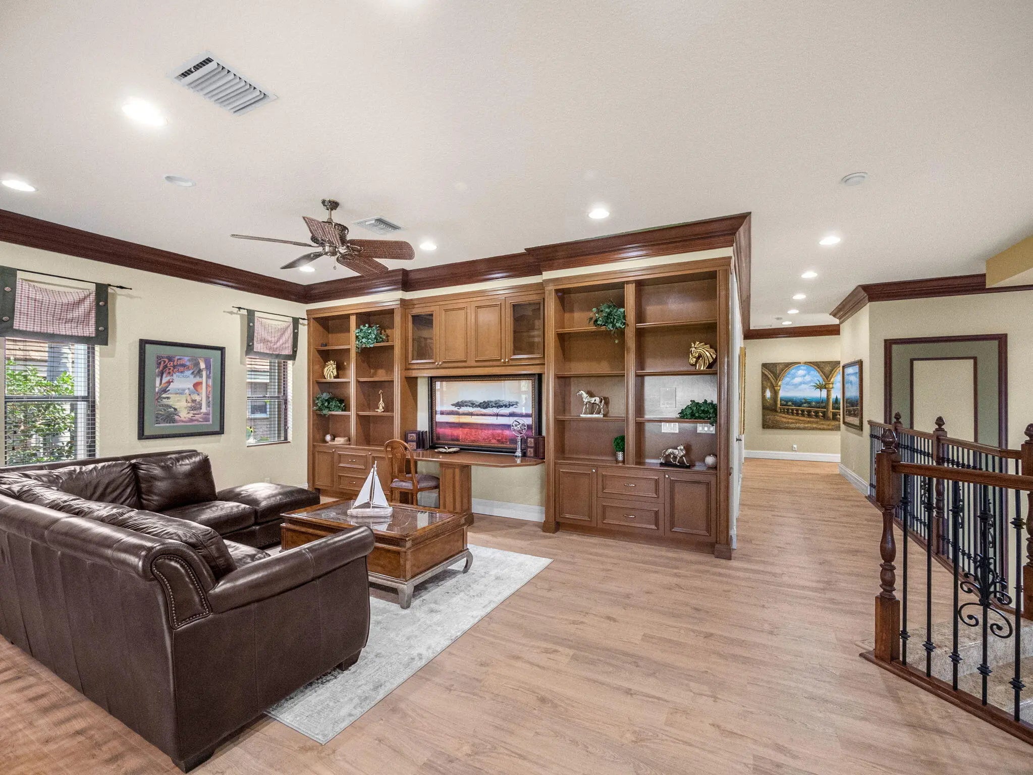 Magnificent former builder's model in Wellington's upscale Versailles sits on a breathtaking lakefront lot with an infinity-edge heated saltwater pool and spa ,travertine tile patio, outdoor kitchen and mango trees. Offering 5 bedrooms 6 1/2 baths and a 3 car garage, this Marseilles model also includes an executive office/library a theater and a spacious loft. Dramatic soaring 23 foot coffered ceilings and the French inspired architectural designs, stately columns, beautified walls, saturnia marble floors, multiple inlaid mosaic insets and diverse custom ceilings, accentuate the uniqueness of this estate home. In 2024,the roof was replaced, complete water filtration system was installed as was LVP flooring in the bedrooms and loft. In 2023 impact doors were installed and a whole house