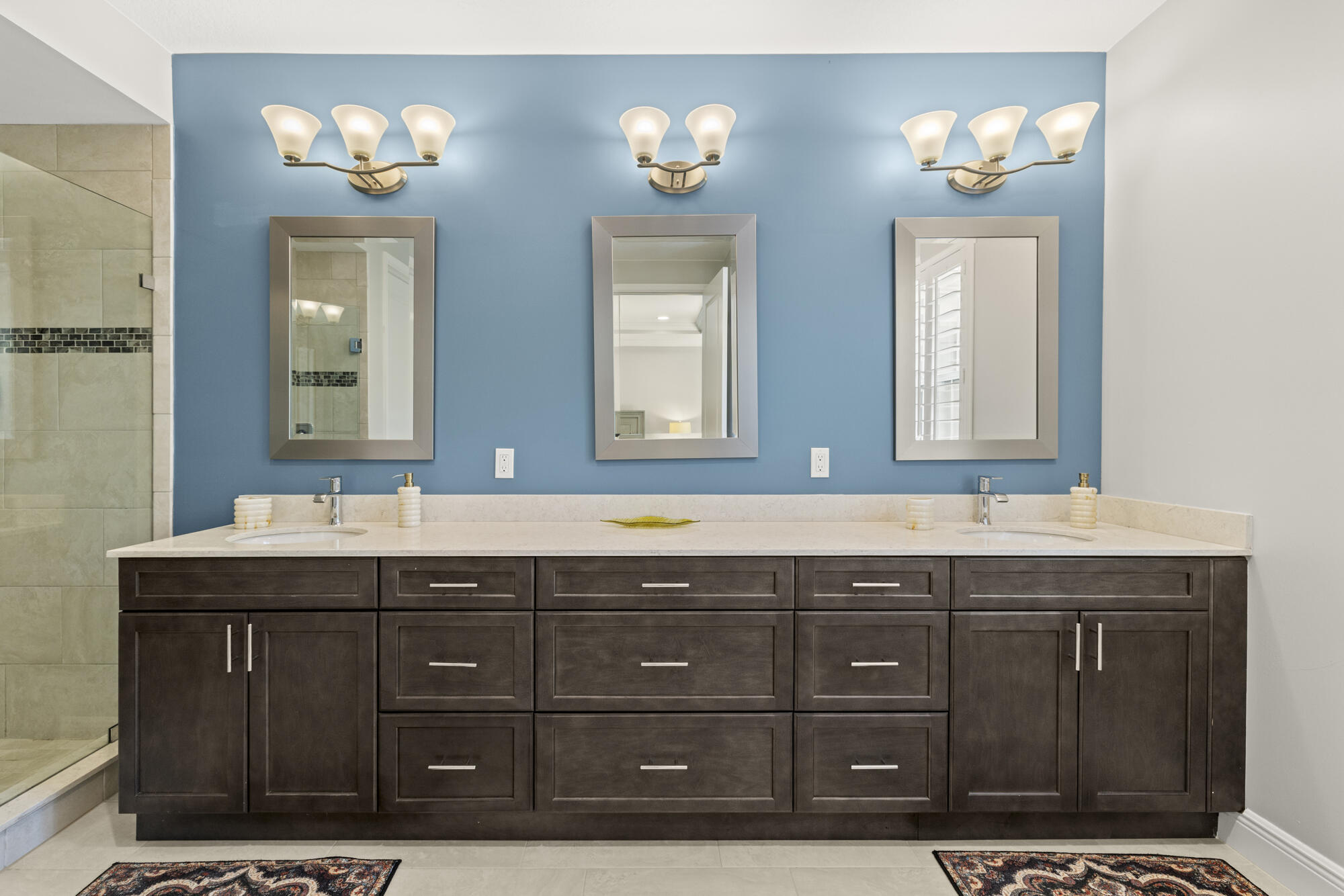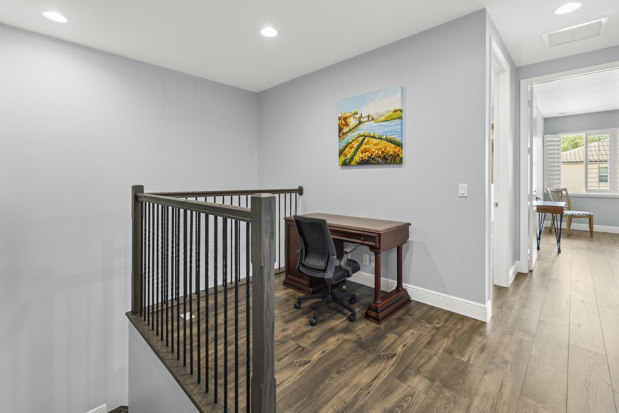Stunning 3 bedroom townhome in gated Binks Pointe that overlooks the 4th hole of Wellington National Golf and preserve. Features impact windows and doors thru out, screened patio and fenced yard. Spacious kitchen with white cabinets and quartz counter tops plus bonus wine and coffee station with extra cabinets and storage and breakfast bar. Formal dining area and half bath downstairs. Huge master bedroom with massive walk in closet, primary bath with oversized walk in shower and double sinks, upstairs laundry room with extra cabinets and counter space plus upstairs work area/loft. The community features pool, gym and clubhouse.