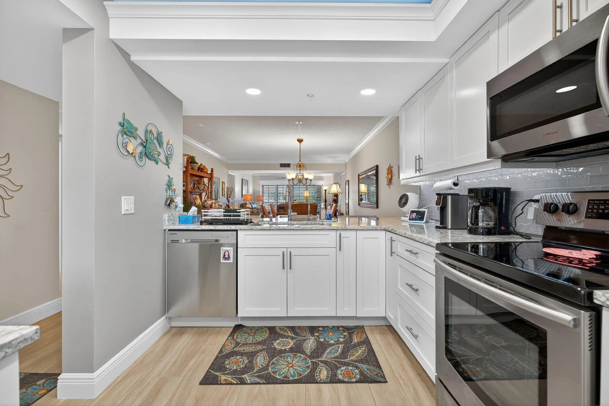 Lovely corner unit 2/2 condo in the Marina at the Bluffs. Pleasant pool, lake and Marina views with screened in balcony with rolldown sun screens & ceiling fans. All windows and doors are impact windows(2021). AC 2020, water heater 2024. new washer dryer 2023. Whole home water filter Roof replaced in 2021, elevators refurbished 2024. Expanded Kitchen with stainless steel appliances & quartz countertops & baths renovated within the last 5 yrs. All assessments paid in full , all milestone work completed.