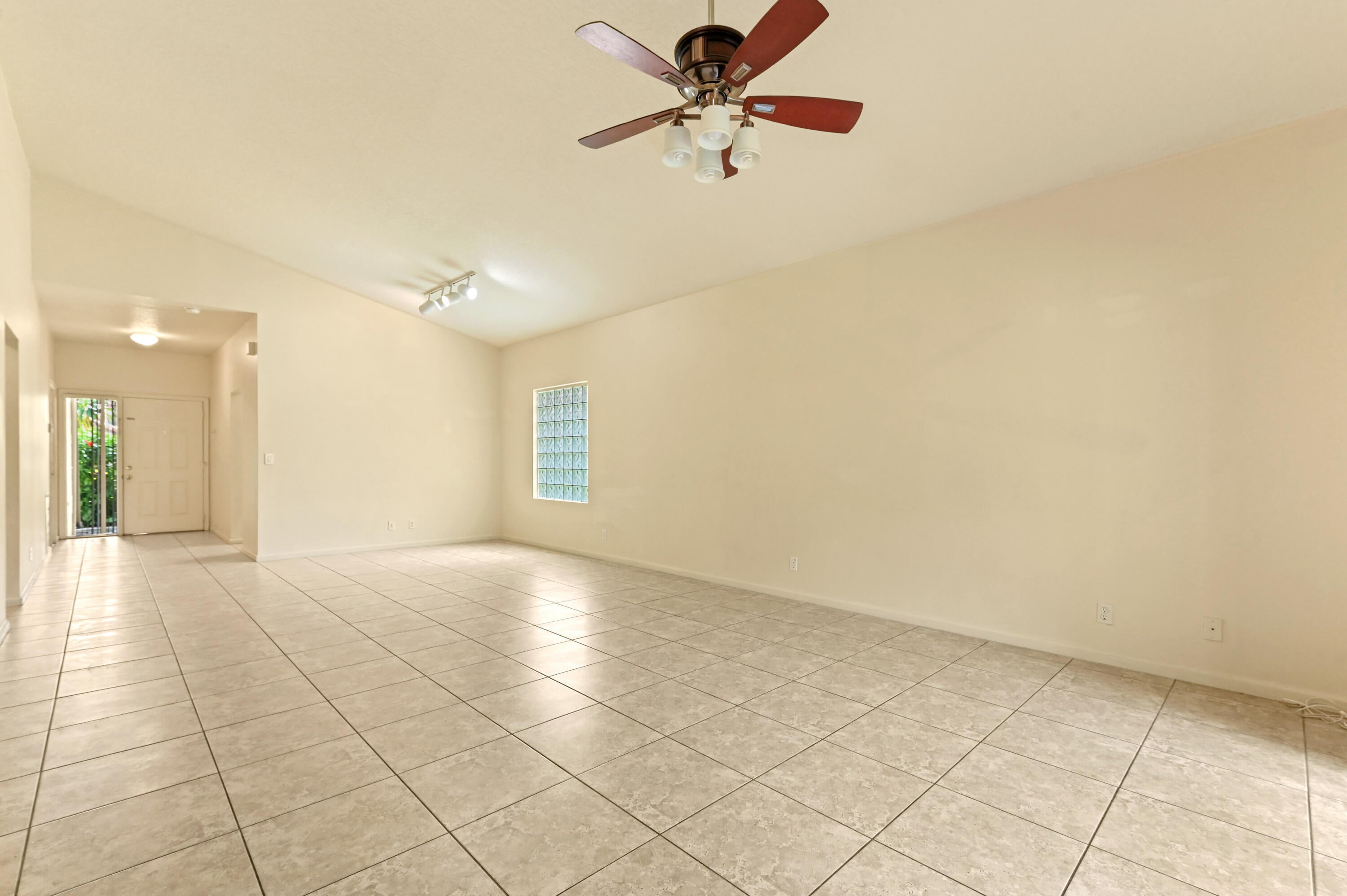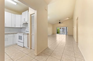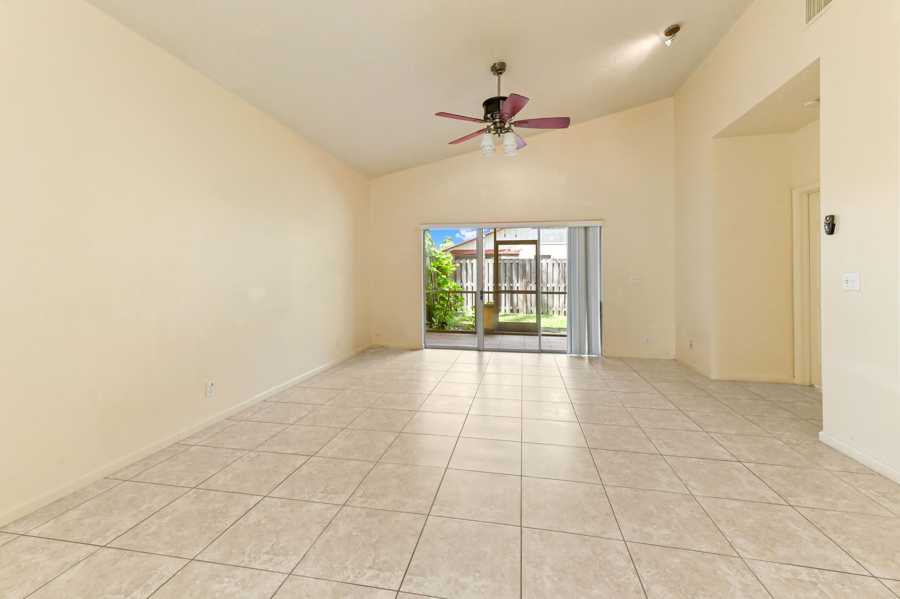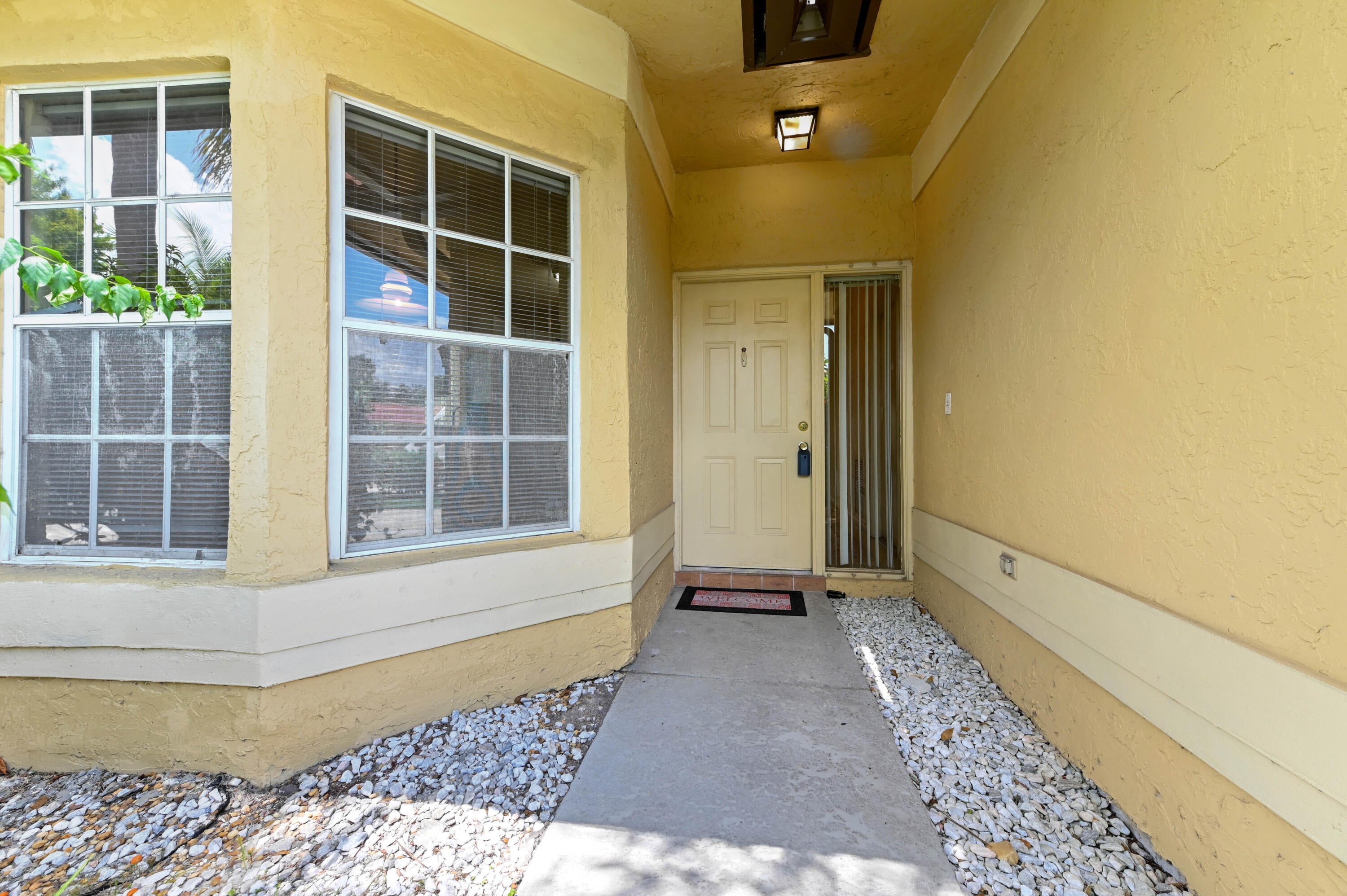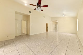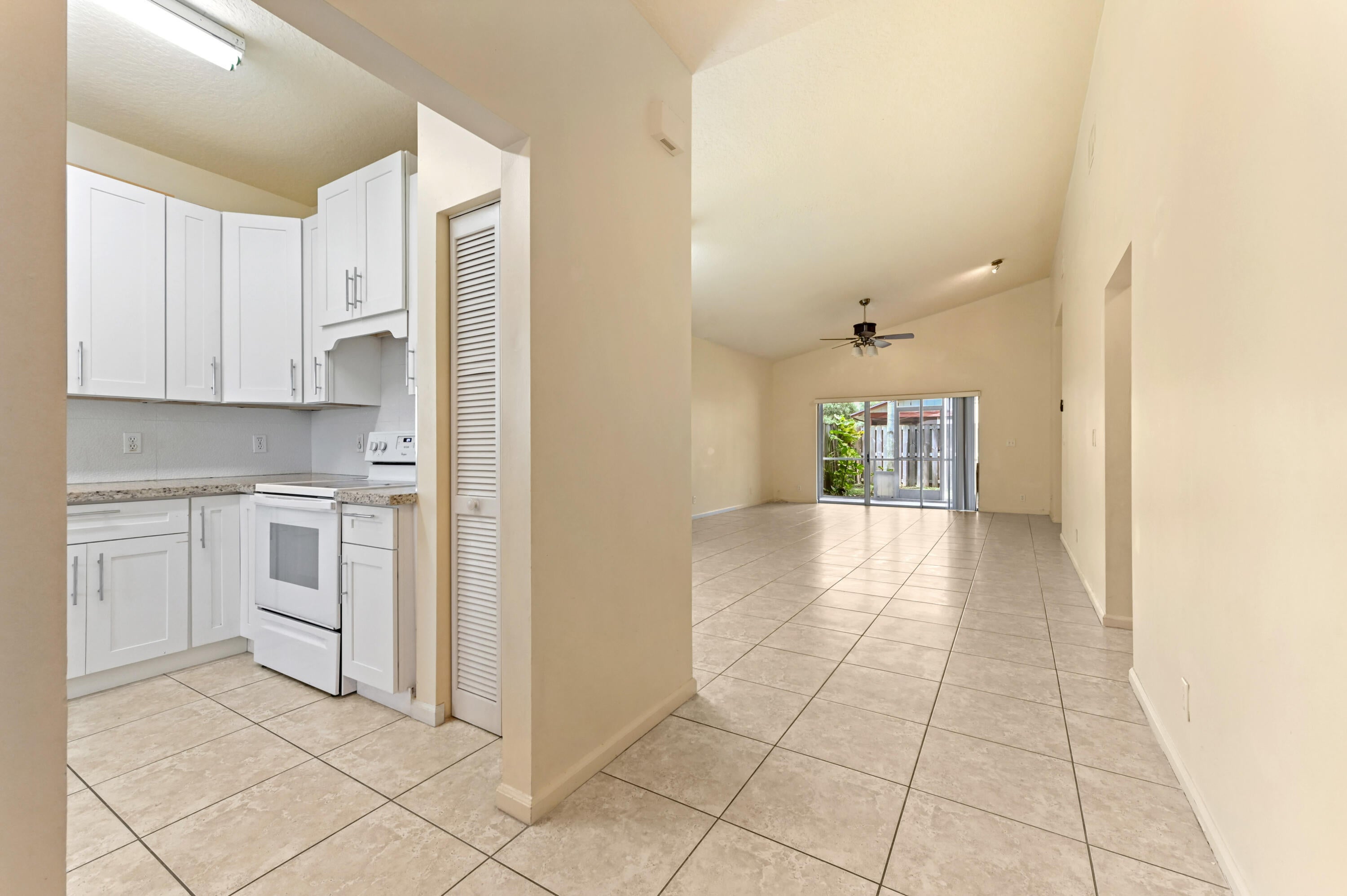 Welcome to this charming single-story home, perfectly situated in the desirable Wellington Downs community. This inviting residence features 3 bedrooms and 2 full bathrooms, offering a seamless blend of modern updates and classic comfort. As you step through the front door, a welcoming foyer leads to a beautifully updated kitchen on your left, complete with gleaming granite countertops, pristine white cabinets, and a cozy breakfast area--ideal for your morning coffee. The main living and dining areas combine to create an expansive, open space, enhanced by soaring vaulted ceilings that create a bright and airy atmosphere.The home's functional layout is complemented by elegant tiled flooring that extends throughout, offering both durability and a cohesive aesthetic. The bedrooms all feature ample closet space, providing plenty of storage. The master bedroom is a private sanctuary, boasting a walk-in closet and an ensuite bathroom. For ultimate convenience and a touch of luxury, the master bedroom also provides direct sliding door access to the back patio. A dedicated laundry room adds to the home's practical appeal, making daily chores effortless. Step outside to discover your private oasis: a screened patio that is perfect for year-round enjoyment, overlooking a fenced backyard that provides a secure space for play or relaxation. Enjoy the peace of mind that comes with a home that has been lovingly maintained, featuring an updated kitchen and bathrooms, as well as a newer A/C unit installed in 2019. The HOA takes care of yard maintenance, freeing up your time to enjoy the community's resort-style amenities, including a pool and tennis court. With a prime Wellington location, this home is within walking distance of the community center, shopping, and dining, and just minutes from all the area has to offer.