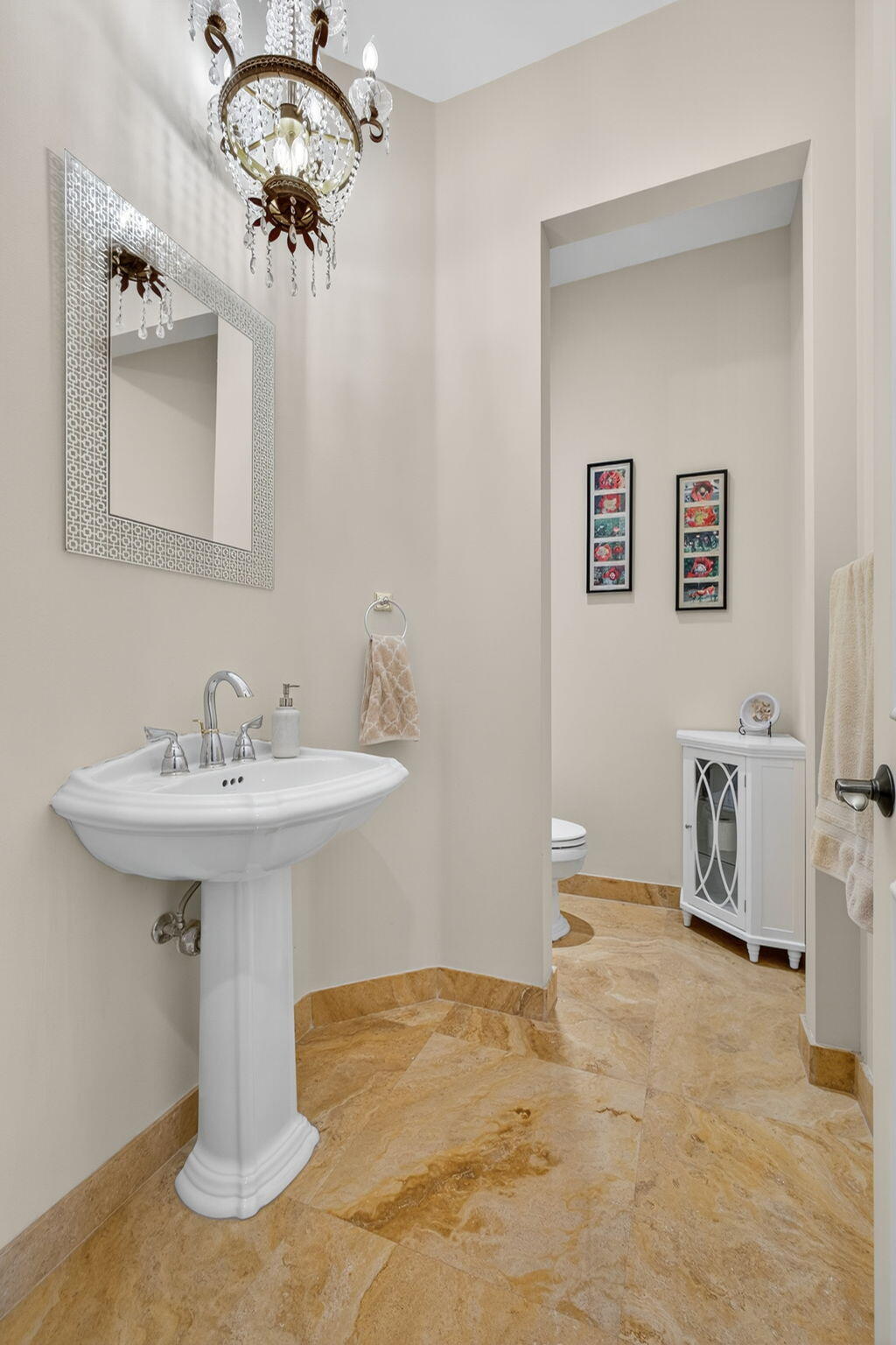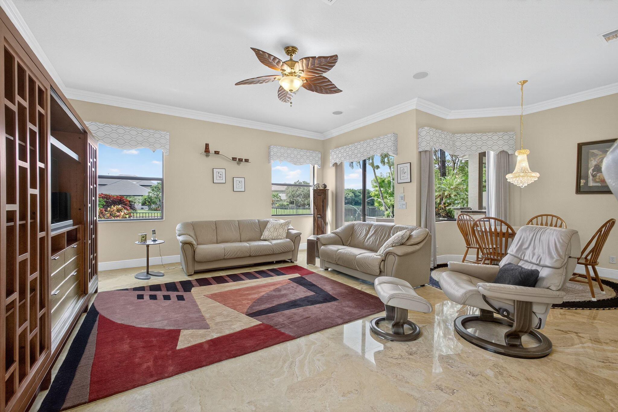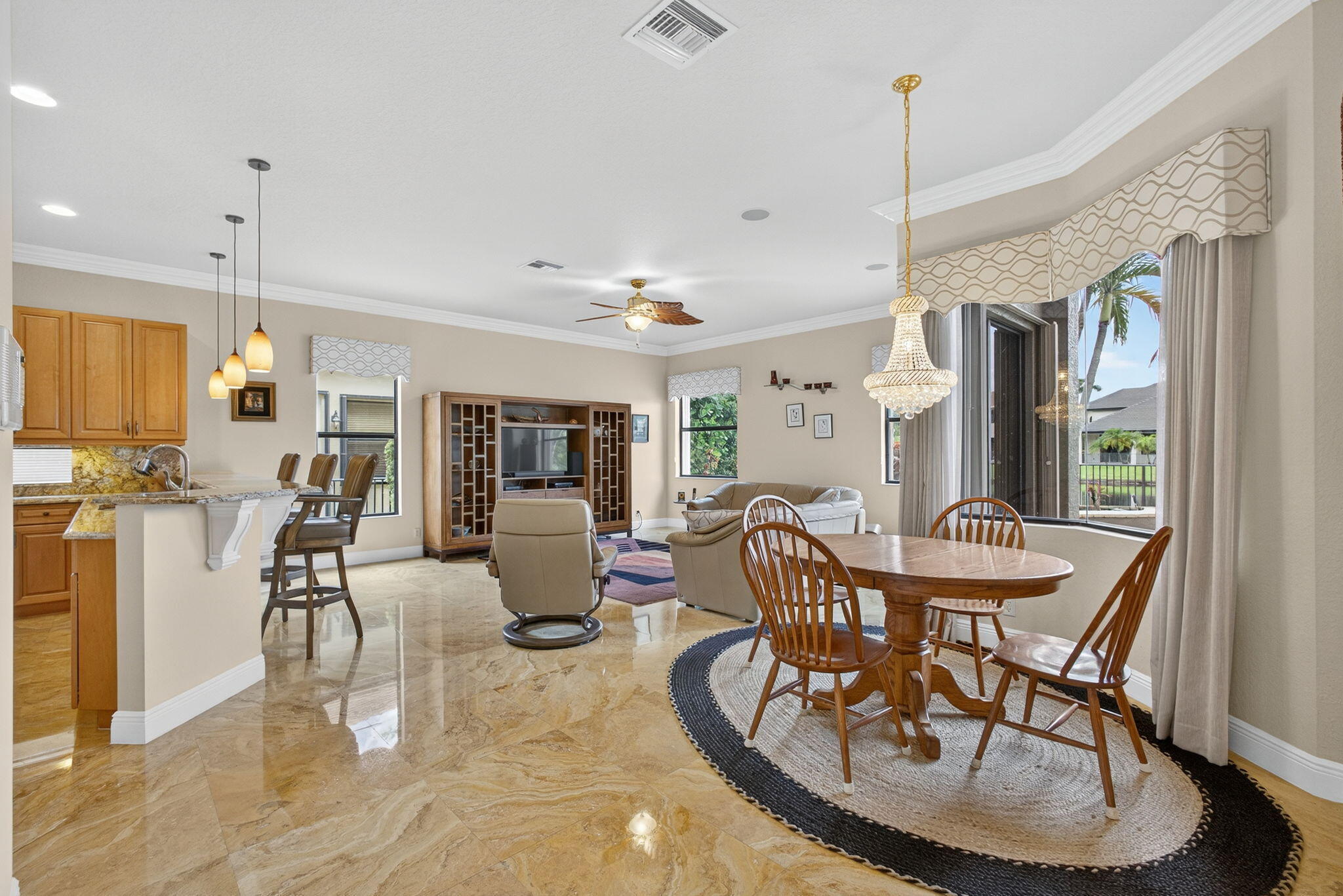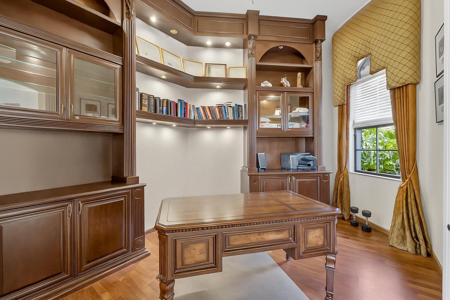 Lakefront luxury! The moment you enter this exquisite estate, you are greeted by breathtaking views of the sparkling pool and tranquil lake through soaring windows that illuminate the formal living room. The elegant dining area and a custom built-in bar, create the perfect setting for both grand entertaining and everyday living. This expansive two-story residence offers more than 4,400 square feet of living space, thoughtfully designed with five bedrooms, four and a half bathrooms, and a three-car garage. The home exudes luxury, from polished Saturnia marble floors and designer chandeliers to the private office with custom built-ins. The first-floor primary suite is a serene retreat, Bright and spacious, it includes a private sitting area that looks out to the lake and garden. The elegantprimary bath is equally impressive, with dual vanities, a soaking tub, and a large walk-in shower, all designed to provide both comfort and privacy. At the heart of the home, the chef's kitchen feature a natural gas cooktop, premium appliances, and sweeping views of the pool and lake. Seamlessly connected to the family room, it is both functional and inviting the perfect space for gathering and creating memories. A convenient powder room and a private guest suite with its own ensuite bath complete the main level, offering the ideal accommodations for visitors or family. Upstairs, three additional bedrooms each offer comfort and style, including two that share a Jack-and-Jill bathroom and one with its own private ensuite. A versatile loft completes the upper level, providing additional space for a playroom, study, or lounging. Outdoors, your private resort paradise awaits. A sparkling pool shimmers against the backdrop of the lake, while an expansive patio and fully equipped summer kitchen invite alfresco dining and relaxed evenings under the Florida sky. Every detail has been considered, from newer A/C units and a whole-house natural gas generator to hurricane-impact windows at the front and accordion shutters at the rear, ensuring peace of mind as well as luxury. Set within the premier gated community of Versailles, this home offers not only elegance but also a coveted lifestyle. Residents enjoy access to a resort-style pool and hot tub, kiddie pool, playgrounds, tennis and basketball courts, and more. The grand clubhouse and state-of-the-art fitness center are being renovated to offer the most current equipment and convivences. Perfectly situated just minutes from equestrian venues, shopping, dining, A-rated schools, major highways, and Palm Beach International Airport, this location is as convenient as it is prestigious. This is more than a home, it is a rare opportunity to experience the perfect blend of luxury, functionality, and resort-style living in one of Wellington's most desirable communities.