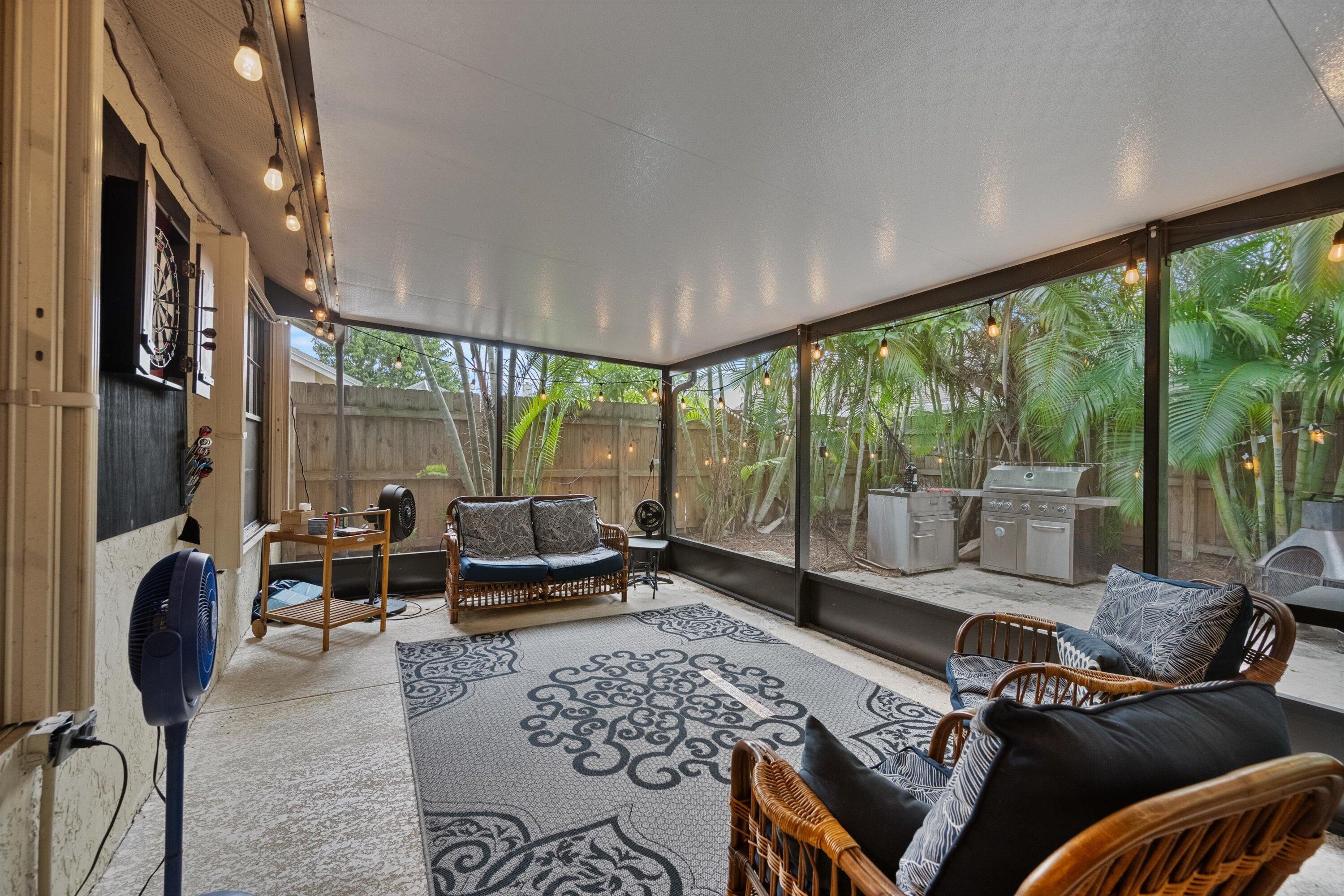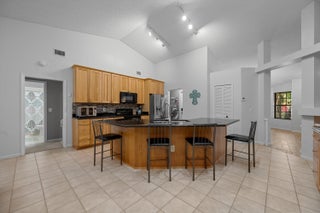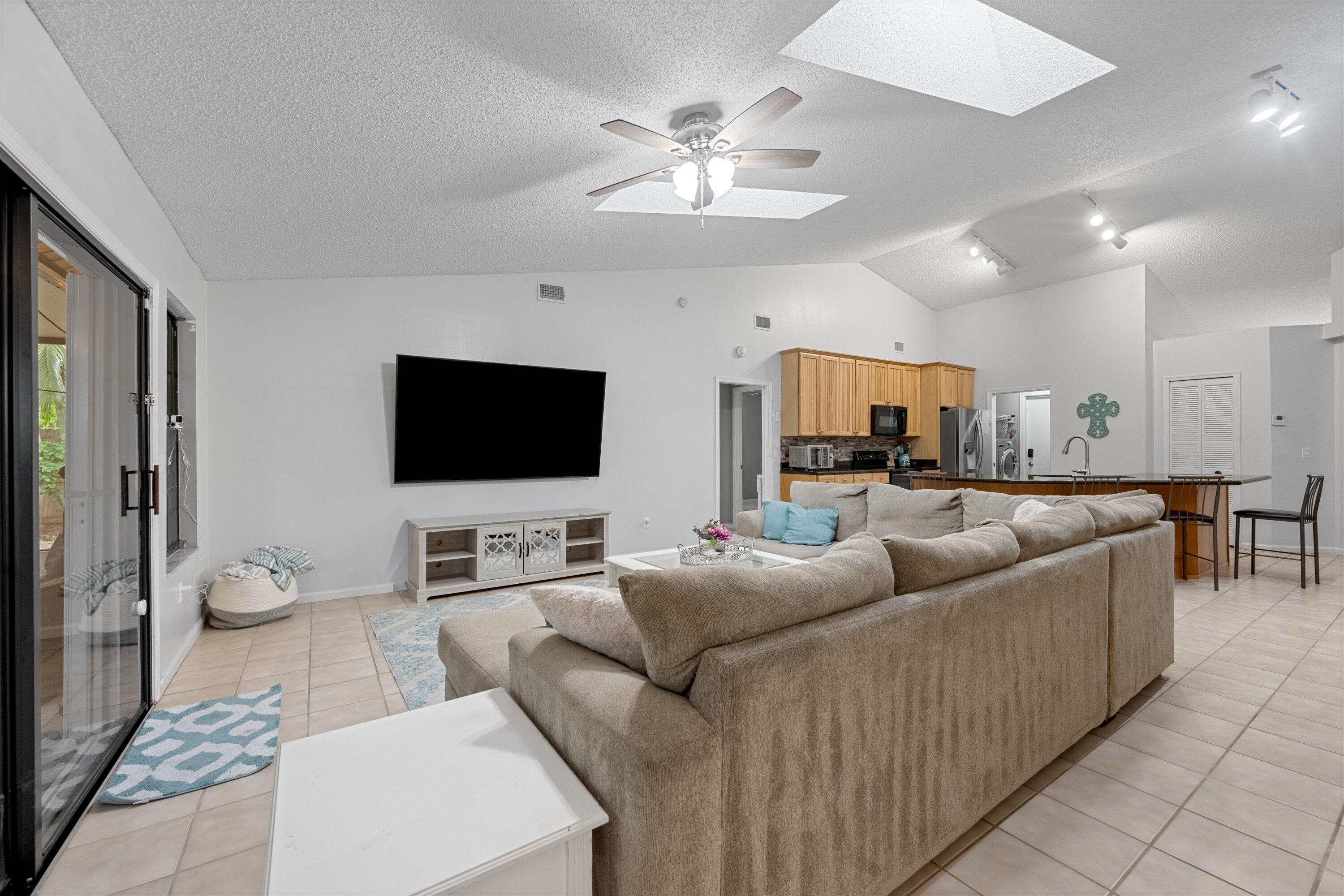 This lovely 3 bedroom 2 bath home has over 1,880 living square feet of comfort! The home has an inviting open floor plan with vaulted ceilings and skylights bringing in natural sunlight. The entry living room has newer tile flooring and leads to the kitchen with beautiful light oak cabinets, granite counter tops, snack bar, plus a work station and opens to the grand family room overlooking the gardens. The primary bedroom is large with an over-sized walk-in closet, bathroom with dual sinks and a separate tub and shower. The covered patio has been added and is screened within the spacious fenced yard which also has a bar-b-que area. The gated community has a clubhouse swimming pool, playground and offers a boat ramp to Lake Wellington for fishing or pontoon cruising. Great location !