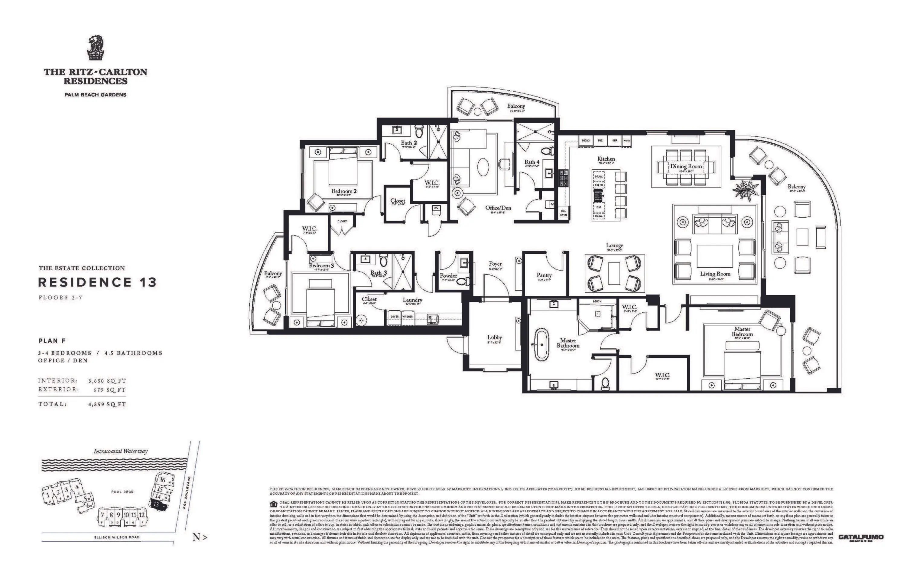Residence 213F is a spacious corner 3BR + Den, 4.5BA at The Ritz-Carlton Residences, Palm Beach Gardens. Located in the North Building, it offers southern exposures over the Intracoastal Waterway, private marina, and resort-style amenities. A flow-through layout and 12' deep balcony create seamless indoor-outdoor living with abundant natural light. The den has its own balcony and is one of only seven F plans with a full bath, allowing a flexible 4th bedroom. Floor-to-ceiling triple-pane glass frames sweeping Intracoastal sunsets. Features include European oak cabinetry, Wolf & Sub-Zero appliances, gas cooktop, and two garage spaces. Residents enjoy 20,000+ sq. ft. of amenities and the legendary service of The Ritz-Carlton. Expected Completion Mid-2026.