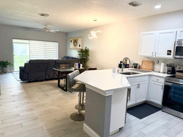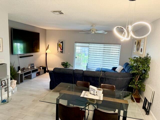 Major price reduction!! Such a beautiful, move-in ready all ages TH in Wellington. Hurricane protection. OPEN, light and bright, white kitchen with SS appliances with large countertop, great for entertaining and for bar stools. Pantry included. Coffee/liquor bar. Gorgeous tile floors on the first floor. Half bath on the first floor for guests. Newer luxury window treatments. Screened patio with storage. Second floor loft/home office/playroom/exercise room. Guest bedroom could have private bathroom. The primary suite is bright and large. White and bright bathroom, double sinks, shower with window. Pet friendly community. Low maintenance. Short walk to pool. Easy access to all that is Wellington.