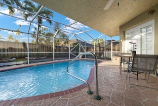 Beautiful 4 bedroom pool home w/ huge bonus room/5th bedroom in gated Meadowland Cove. Gorgeous wood look tile in living areas, separate dining & breakfast nook. Kitchen features granite counters tops, pantry,new dishwasher, & wood cabinets. Primary bedroom retreat has walk in closet, soaking tub, walk in shower, plus dual sinks. Other features include cabana bath,newer water heater (large capacity) w/heat pump to primary bedroom, transferable AC service contract , hurricane impact garage doors.Screened pool w/privacy fence & lush landscaping. Decorative concrete decking around pool patio & tiled front walkway on quiet cul de sac lot. The community features a clubhouse w/heated community pool & boat ramp. Perfect location in the heart of Wellington & Equestrian Venues. ''A'' rated schoo