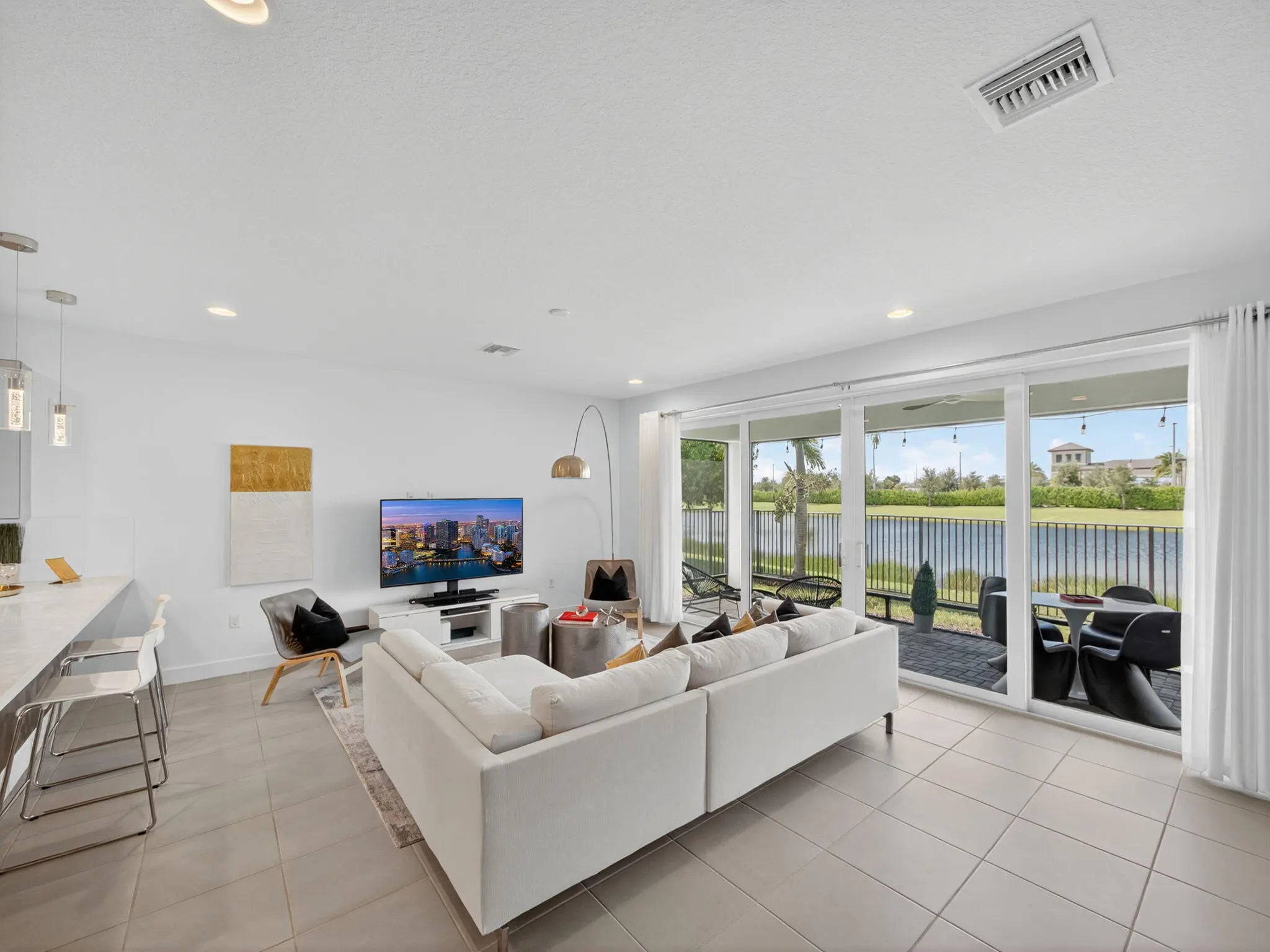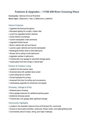 Welcome to this impeccably upgraded 2-bedroom plus den that can be converted into a bedroom, 2-bathroom lakefront home located in the highly sought-after Valencia Grove at Riverland community. Thoughtfully designed for both comfort and style, this residence offers a blend of modern finishes and functional upgrades that make it truly stand out. The impact glass front door fills the entryway with natural light, leading into an open-concept living space adorned with upgraded tile flooring throughout, recessed lighting, and a spacious layout ideal for entertaining or everyday living.