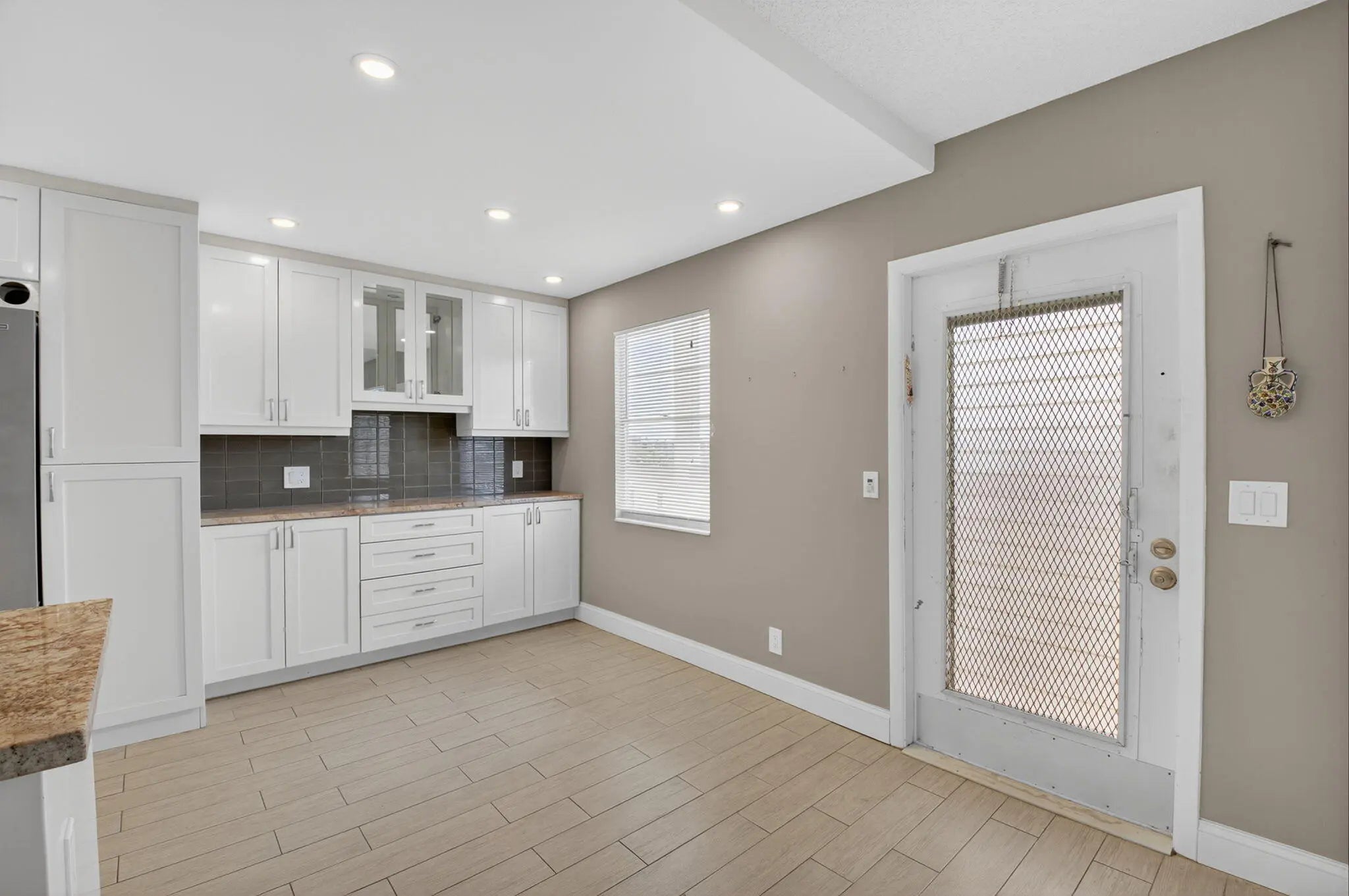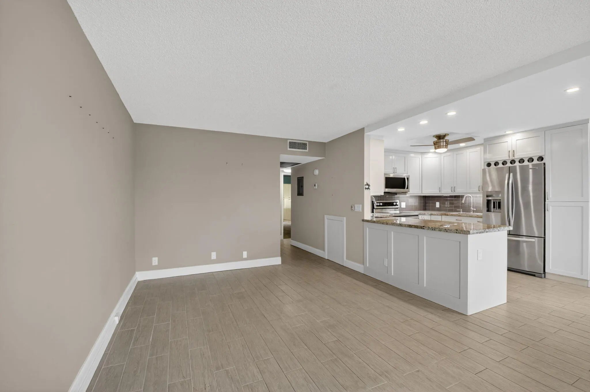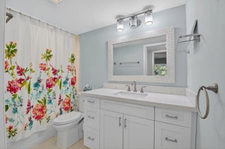 This top-floor, 2/2 condo in desirable Rexford offers quiet, updated living with no upstairs neighbors. Enjoy an open, modern kitchen featuring Quartz countertops and stainless steel appliances. The living area boasts stylish wood-look tile floors. The patio has been transformed into a bonus room with extra storage, thanks to sliding impact windows, providing a tranquil lake view. A newer AC and updated electric panel ensure peace of mind. Close to house of worship and clubhouse.Amenities include internet and WIFI, Century Village is like living in a resort, fitness center, live shows,movies,buses,classes,bingo,card rooms,trips,tennis,pickelball, close to shopping and restaurants,come see and then check out the clubhouse to see it for yourself.