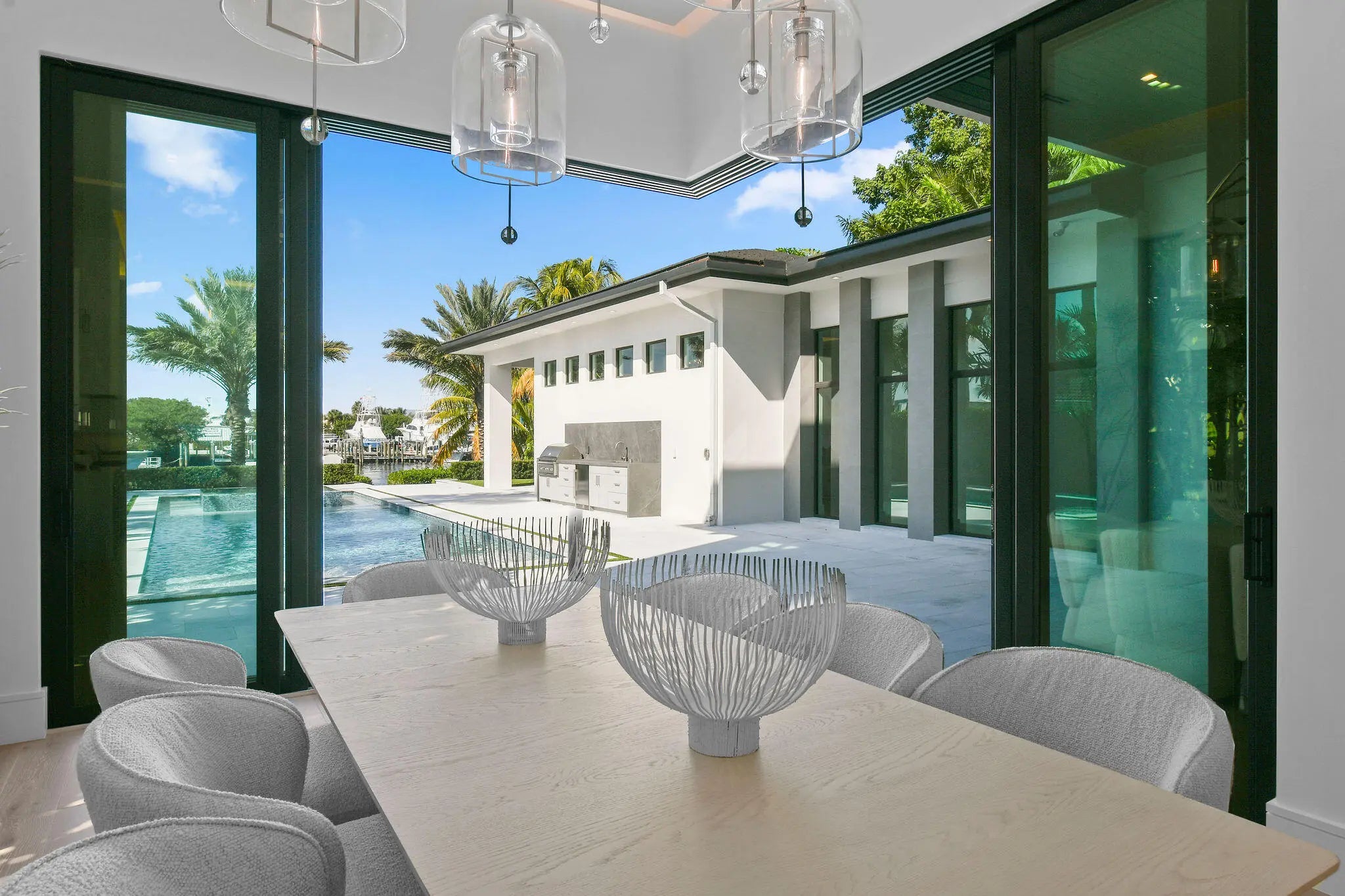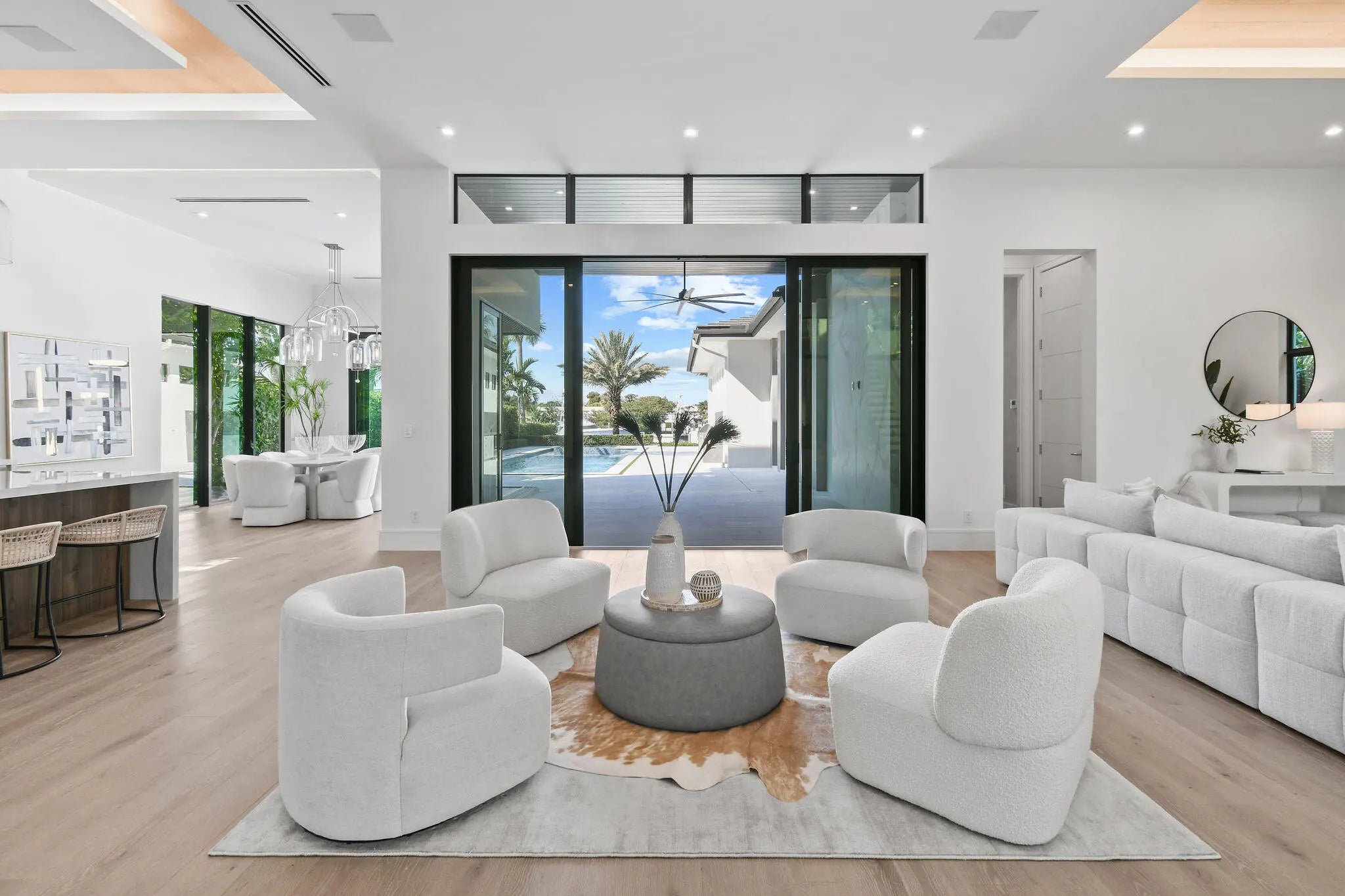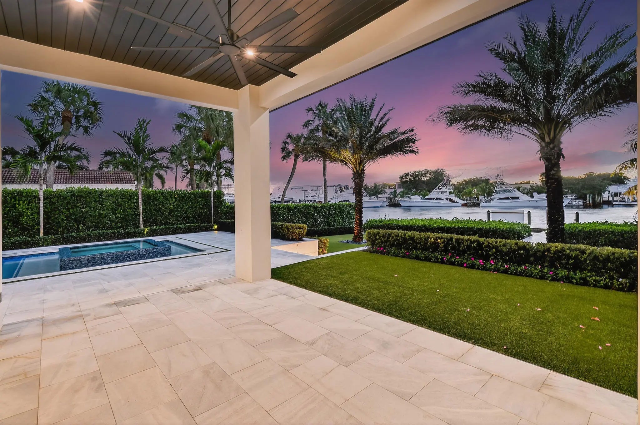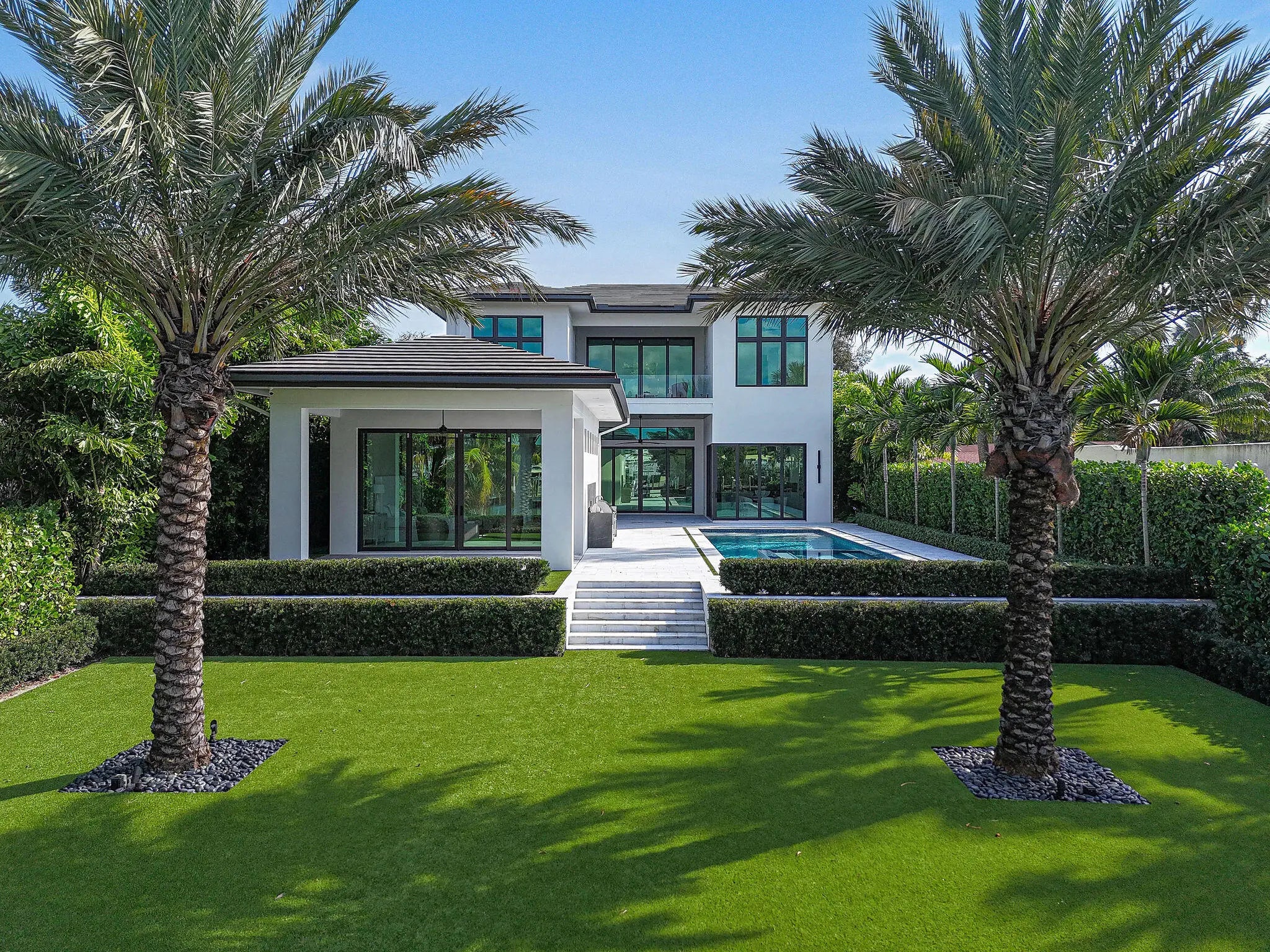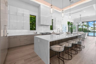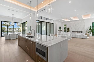 Newly built Intracoastal estate positioned on over half an acre along the direct Intracoastal. This privately gated modern estate embodies uncompromising craftsmanship and refined contemporary living. Completed with a structural integrity seldom seen in residential construction, the home and pool are supported by 106 helical piles, establishing a foundation built for permanence and peace of mind. Thoughtfully designed to merge the architecture with its waterfront surroundings, the residence showcases clean lines, expansive glass, and seamless indoor-outdoor living. A spacious motor court and gated entry offer complete privacy upon arrival, framed by illuminated, meticulously designed landscaping, turf grounds, and custom hardscape inlays. Inside, the home reveals 12-foot ceilings with