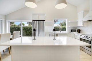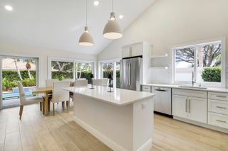 Modern Coastal Elegance! Completely renovated! Brand new everything inside and out including a brand new roof (2025), exterior paint, and hurricane impact windows. Situated on an oversized corner lot, only 7/10ths of a mile from your front door to the Atlantic Ocean! 3 bedrooms + a loft, 2 full baths. Bosch appliances. Custom cabinetry. Quartz kitchen countertops. Marble shower tile and counters in the bathrooms. Custom accent walls. Closet built-ins. Full summer kitchen w/ Alfresco Grill and Refrigerator. Salt chlorinated private pool with sun shelf and water feature, surrounded by lush tropical landscaping. Epoxy floored garage. As move-in ready as it gets! Offered furnished. (Guest rooms and patio virtually staged). If you're looking for your renovated, modern beach house, this is it!