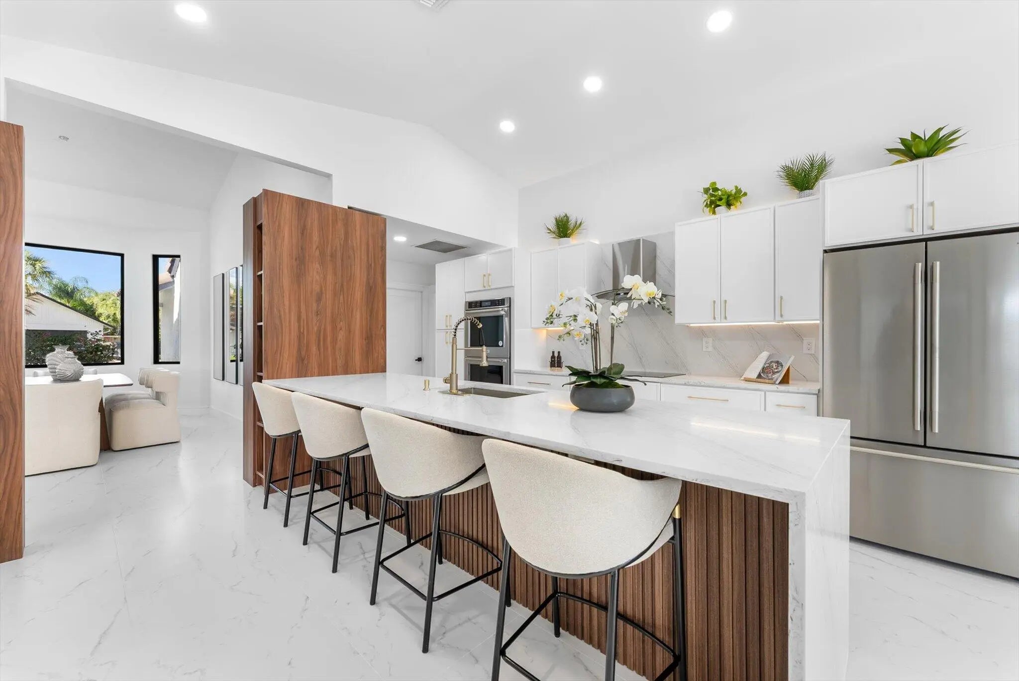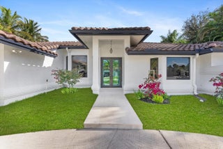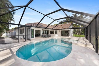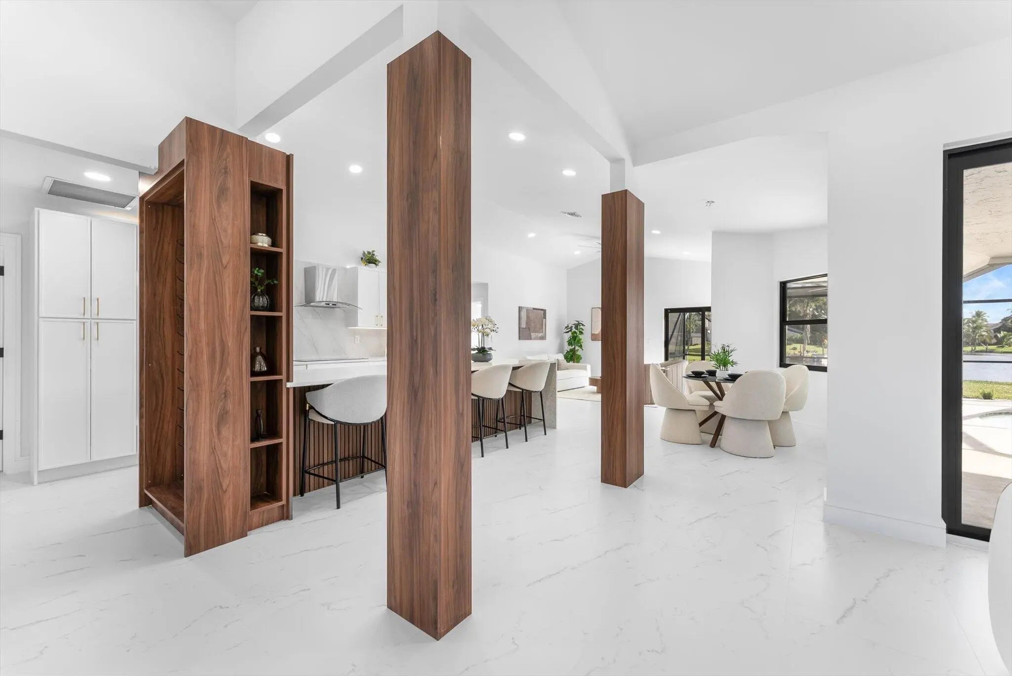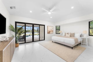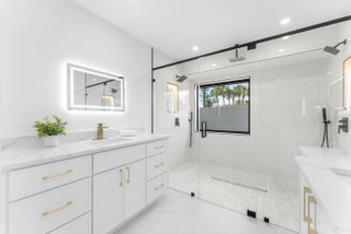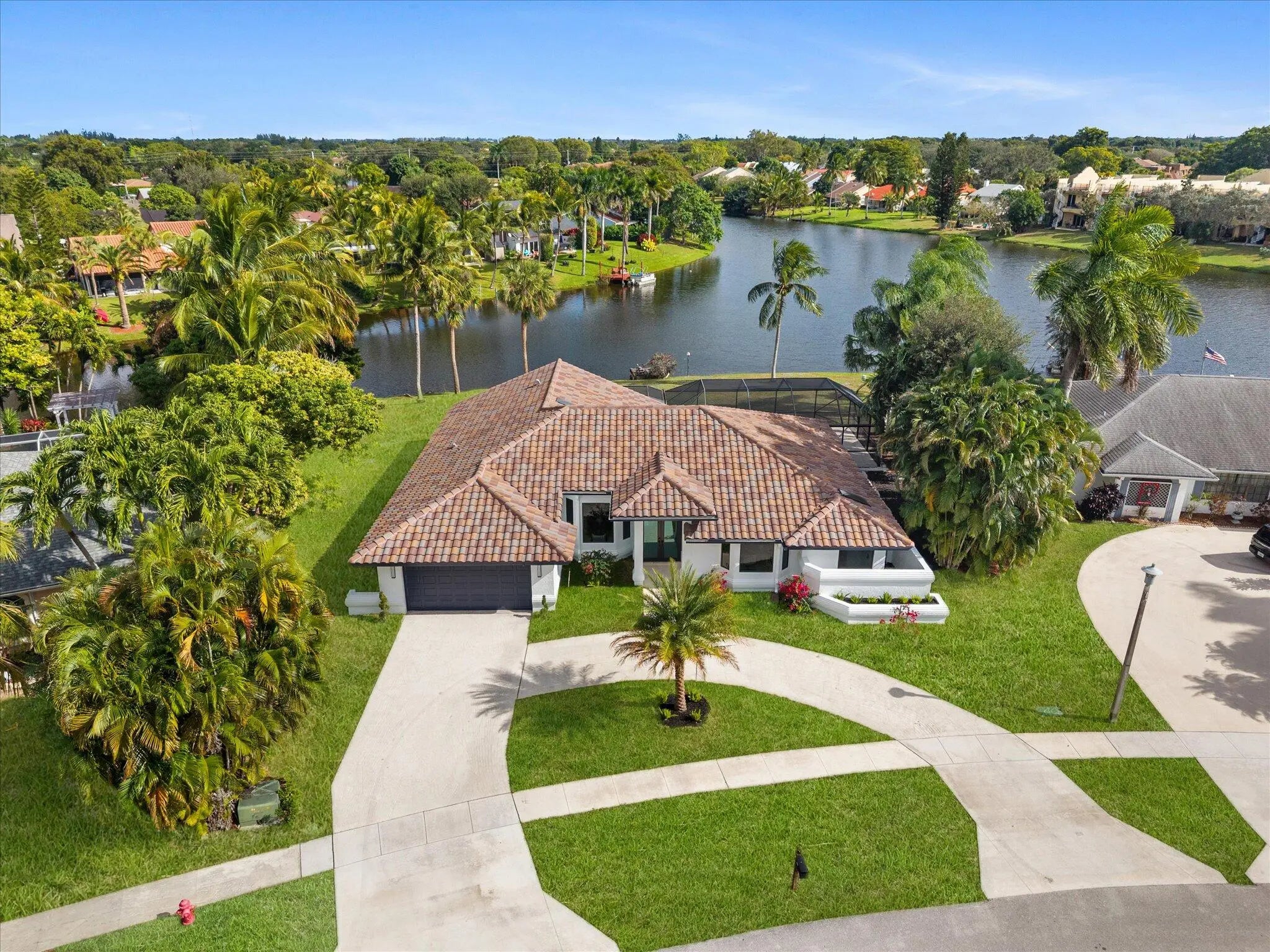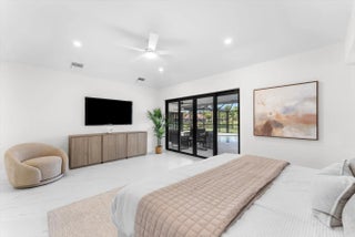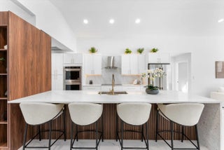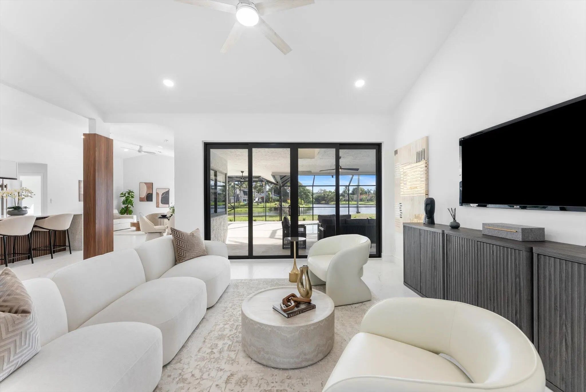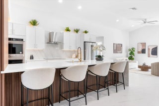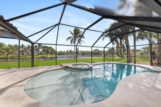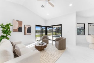 Stunning modern 4BR/2.5BA lakefront pool residence showcasing refined architectural details throughout. Porcelain tile flooring, vaulted ceilings, and crisp white designer finishes that create a bright, sophisticated ambiance. The chef's kitchen offers quartz counters, warm wood accents, gold-style hardware, and premium appliances including dual wall ovens, a sleek cooktop with programmable vent hood, dishwasher, and abundant storage. The spa-inspired primary suite features dual vanities, LED mirrors, and a large walk-in shower with triple heads. Outdoor living includes a screened free-form pool and spa, cabana bath access, covered patio, circular drive, garage and, serene lake views, plus a 3-year-old barrel tile roof, impact glass, CBS construction, and an oversized 13,519 SF Lot.
