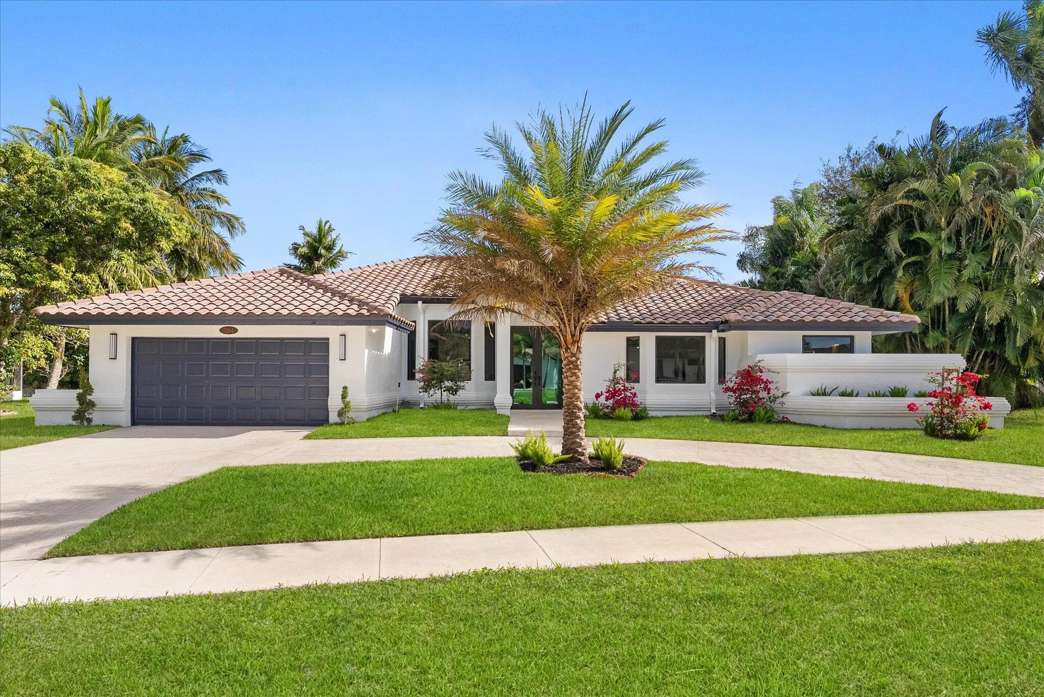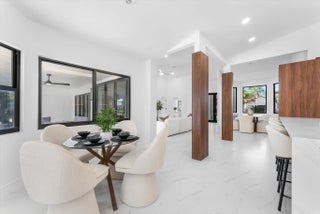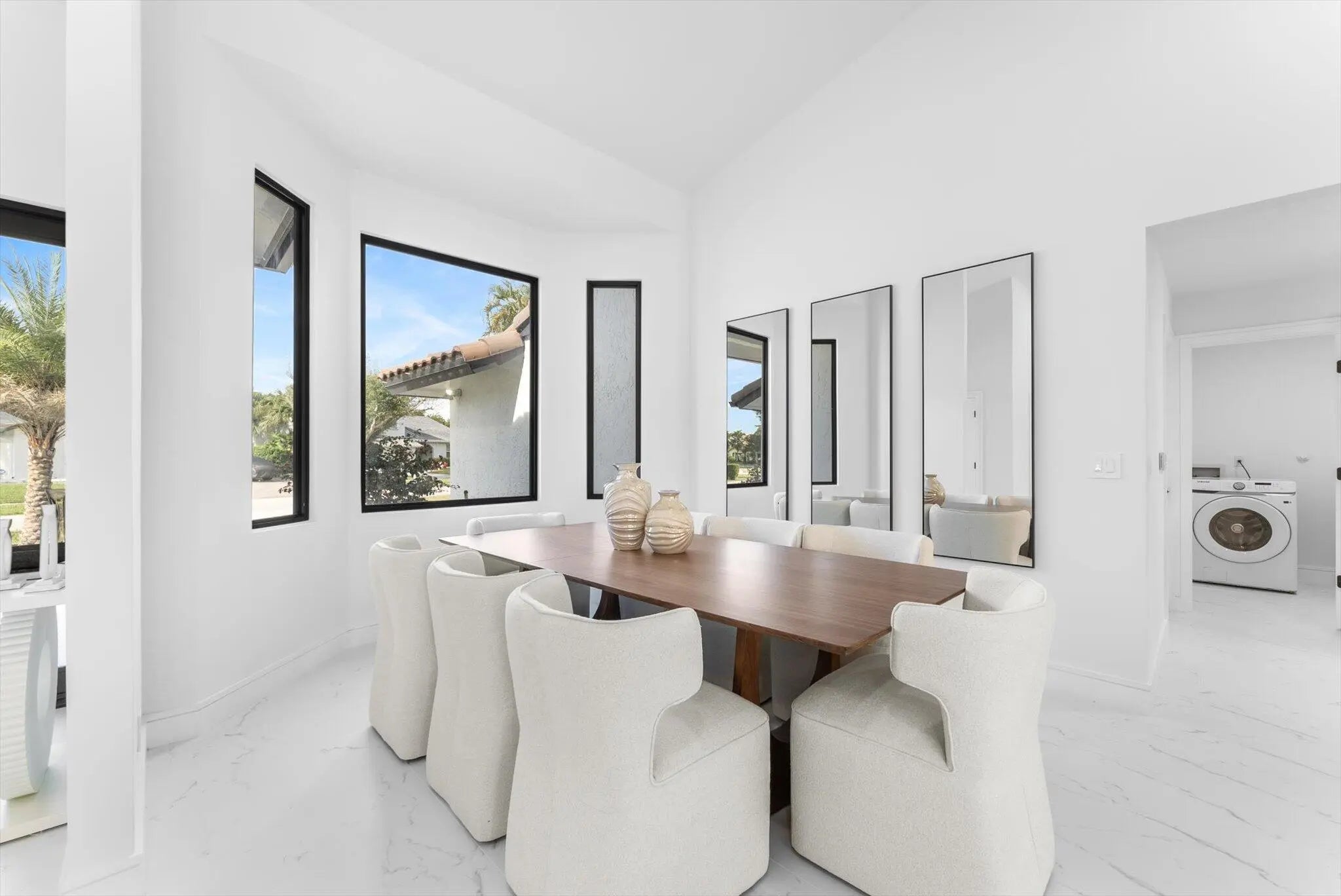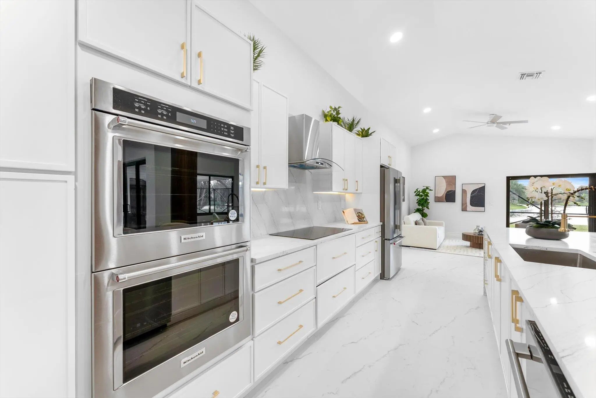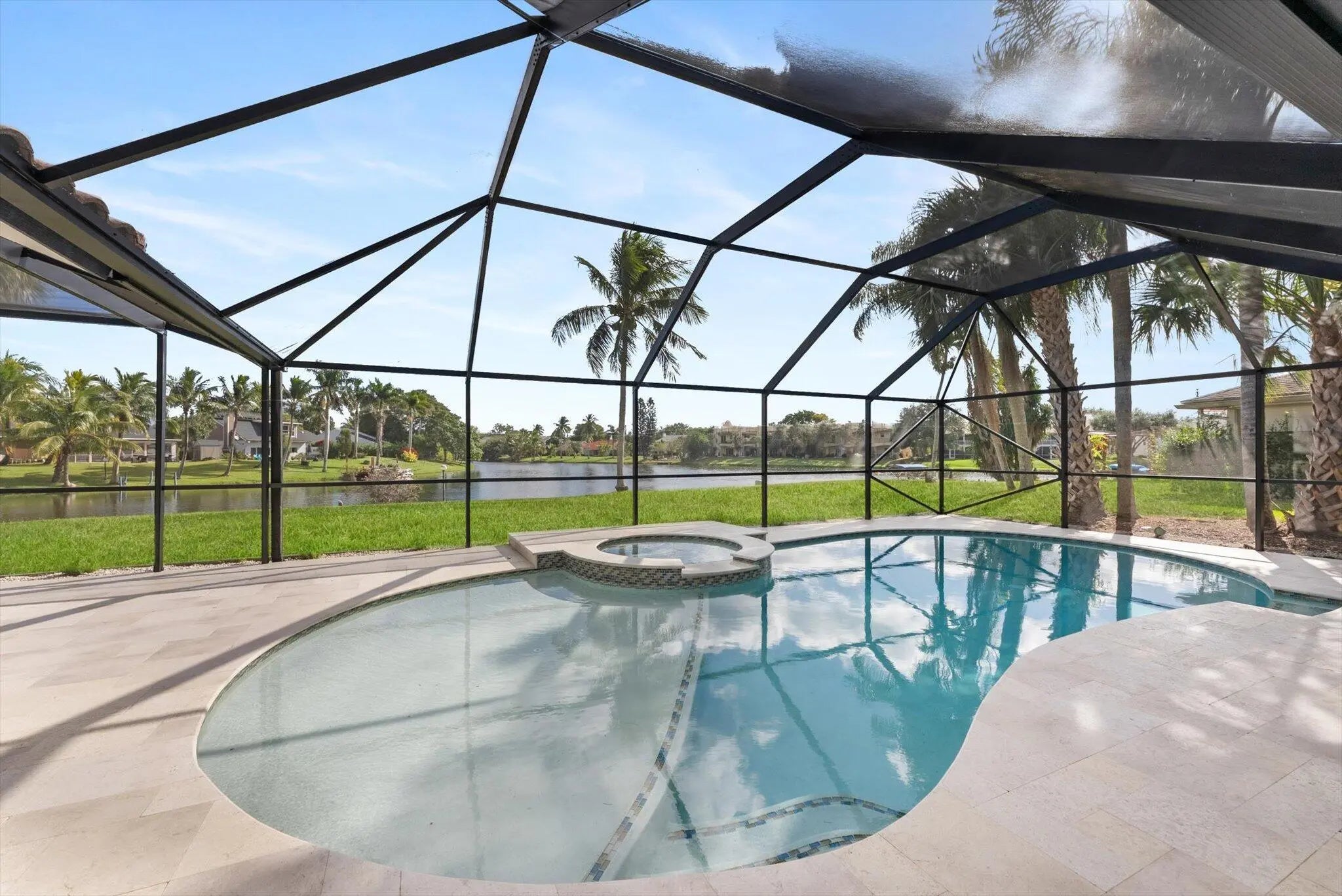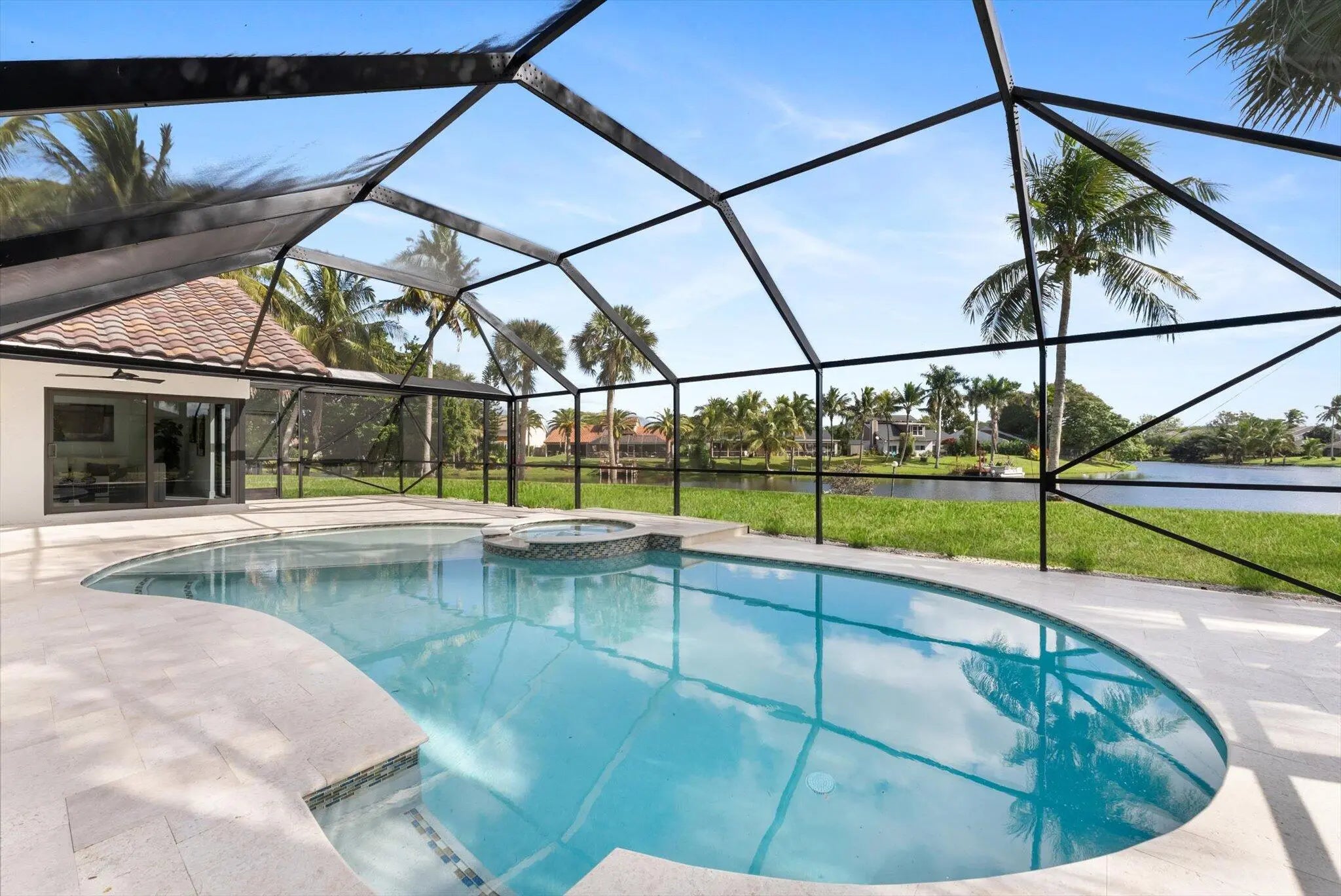 Stunning modern 4BR/2.5BA lakefront pool residence showcasing refined architectural details throughout. Porcelain tile flooring, vaulted ceilings, and crisp white designer finishes that create a bright, sophisticated ambiance. The chef's kitchen offers quartz counters, warm wood accents, gold-style hardware, and premium appliances including dual wall ovens, a sleek cooktop with programmable vent hood, dishwasher, and abundant storage. The spa-inspired primary suite features dual vanities, LED mirrors, and a large walk-in shower with triple heads. Outdoor living includes a screened free-form pool and spa, cabana bath access, covered patio, circular drive, garage and, serene lake views, plus a 3-year-old barrel tile roof, impact glass, CBS construction, and an oversized 13,519 SF Lot.