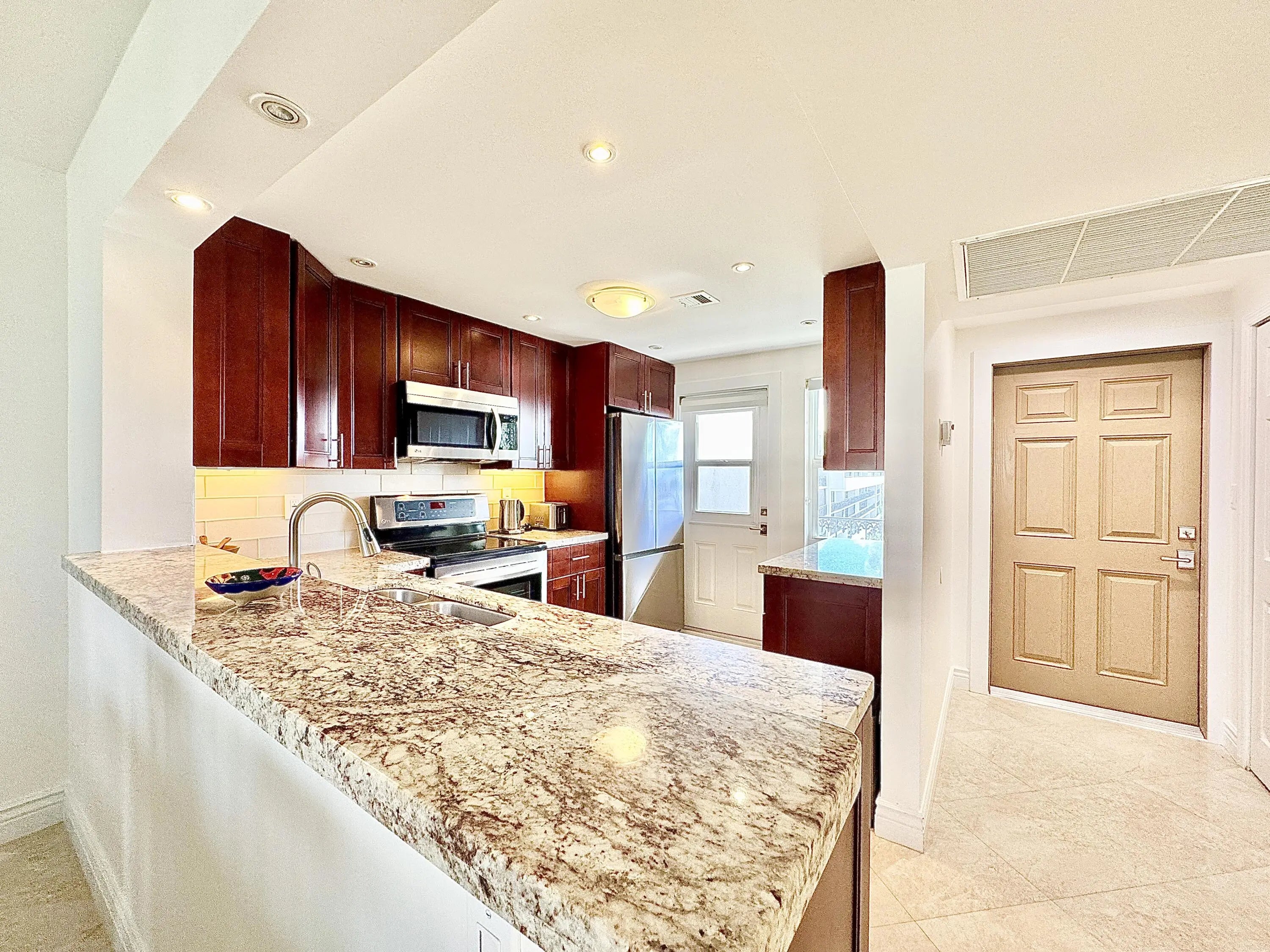 Gorgeous ocean views! Completely remodeled 2br, 2ba. Open-concept kitchen with granite counters, SS appliances & 42-in cabinetry. Elegant marble flooring, open floor plan-ideal for entertaining and everyday living. Enjoy ocean breezes from the screened balcony or open the 3-panel hurricane-impact sliders for true indoor-outdoor living. Baths offer marble and granite countertops, frameless glass showers & custom cabinetry. 1-car gar and storage closet. Located in the luxurious gated waterfront community of San Remo: Private beach, marina, clubhouse, heated pool, spa, gym, BBQ area, bocce ball, and dockage waitlist. Situated between the Ocean and Intracoastal. Steps to beach, Mins to downtown Boca, Delray, I-95, FAU, shopping, dining & entertainment. True South Florida Resort-style Living!