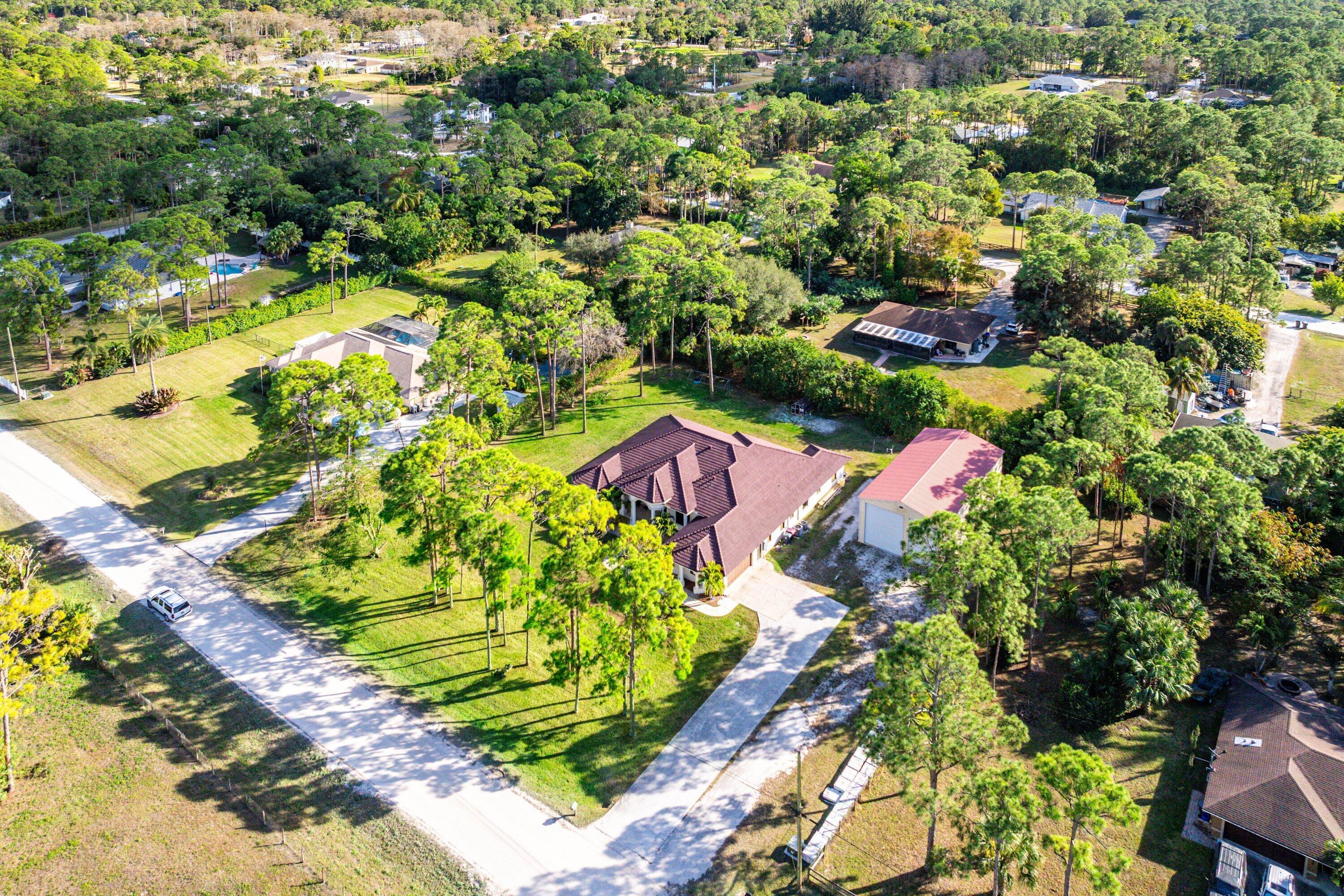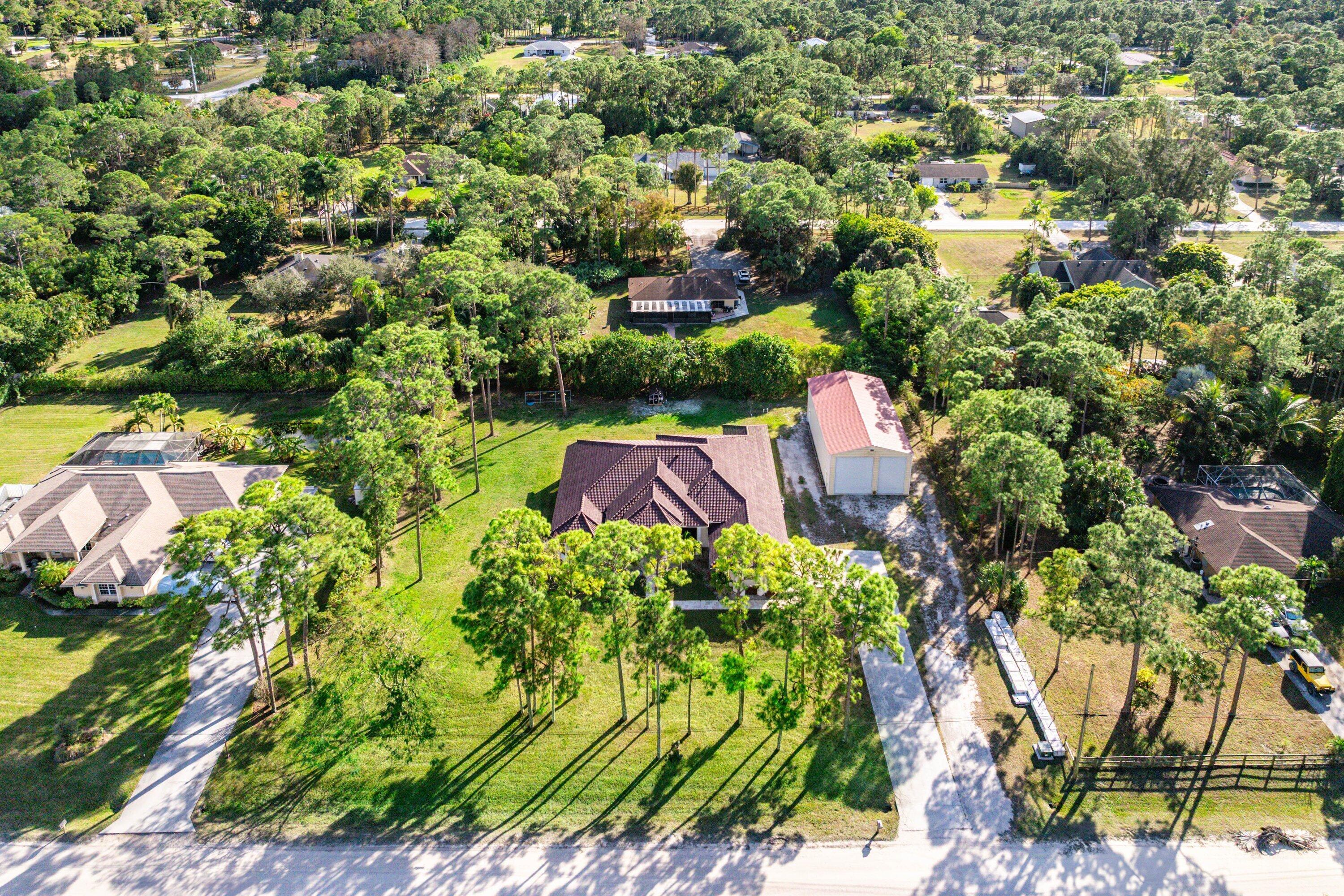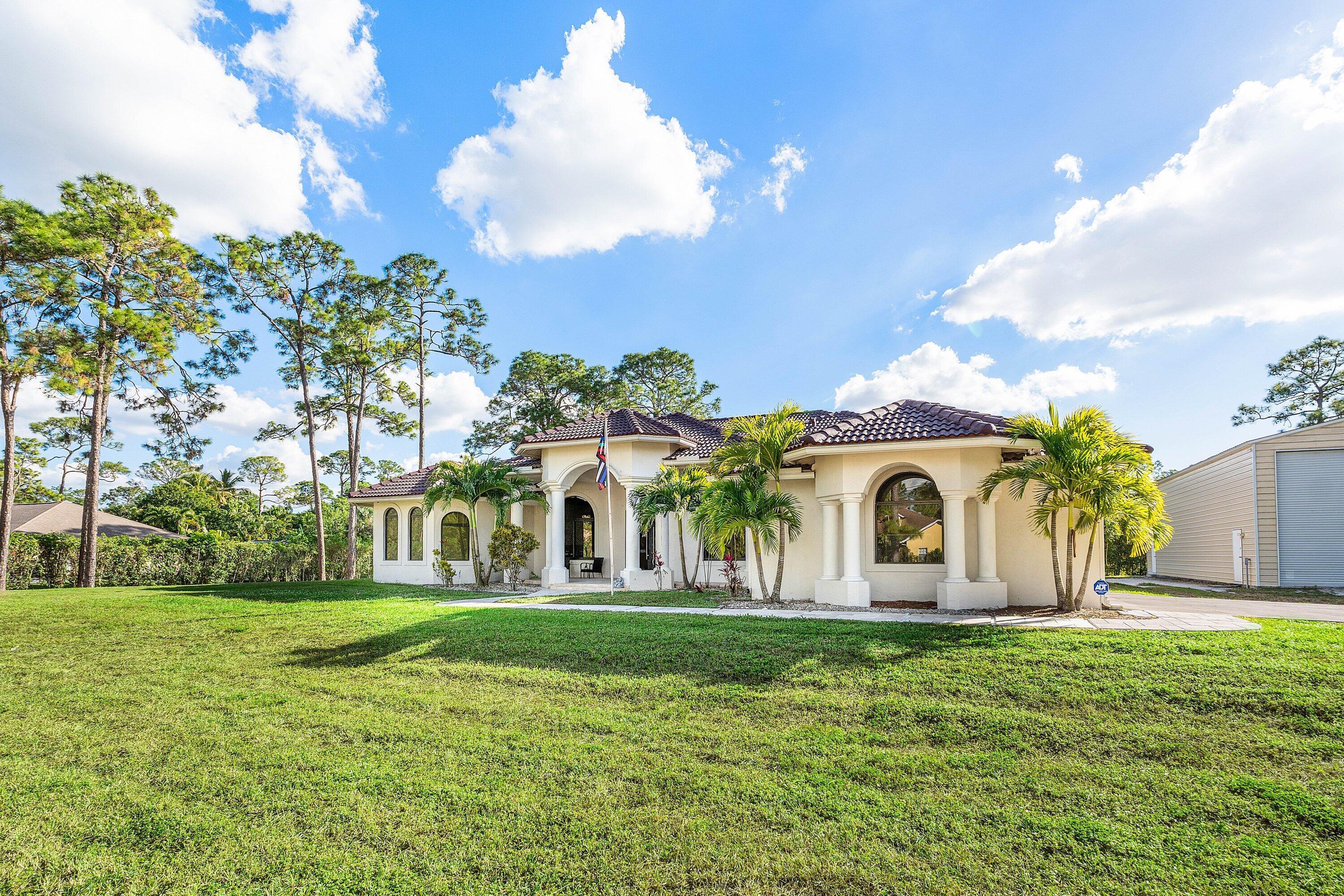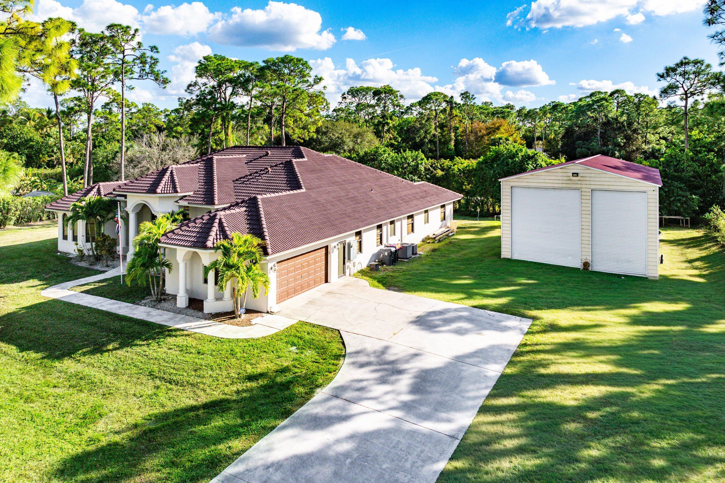 WELCOME HOME This well appointed rare gem is resting on a premium 1.14 acre lot and boasting; 4 bedrooms PLUS DEN, 3 full baths, 1/2 bath, 2 car attached garage, PLUS A SPECTACULAR 60'X30' / 1800 SQFT DETACHED STEEL SHOP, upgrades galore, hurricane impact windows and doors and this estate home is located in a peaceful location! ENTERING the property you will discover that this beauty is resting on a high and dry lot with no pond, expansive concrete driveway and a grand covered entry that brings you inside the double front doors where you are greeted by 12' ceilings, 10'x8' foyer, vertically laid porcelain flooring, arched windows and a hello spacious kitchen that features; kitchen island with storage, 8'x4' walk-in pantry, glass panel display cabinets, stainless steel appliance (CLICK)package, sink reverse osmosis system, bullnose granite countertops, 6 person bar, lovely breakfast nook with a picture window that overlooks the abundant green space. PASSING THROUGH you will find a dynamite split floor plan, this gem is very well maintained, high-end flat wall finish and extensive millwork, columns and arches, french doors, luxurious fixtures throughout, light and bright rooms, beautiful color palette, windows galore including countless transom windows, real wood floors, en-suite bedroom with walk-in closet, double tray ceilings, 12'x9' under AC laundry room with front loading washer and dryer, cabinetry, folding counter, utility sink, tankless hot water heater and much more! And hello elegant master suite boasting a green space view, his and hers walk-in closets, exclusive AC system, private water closet, spacious walk-in shower, his and hers granite vanities, linen closet and grand jacuzzi tub. STEPPING OUTSIDE brings you into a private oasis... Spacious 34'' x 16' lanai that is plumbed for an outdoor kitchen, countless mature pine trees, triple Christmas palms, convenient full concrete areas and simply, a perfect space for quiet time, cozy fires, family gatherings, entertaining and enjoying Florida living at its best. HELLO SHOP, SAVINGS, PEACE OF MIND: 1800 sqft Eversafe 2021 shop boasting a 21' ceiling, 14' front roll up doors, rear rollup door, 200 amp service with multiple 220 and 110 outlets, and Eversafe Buildings has over 40 years' experience in providing high quality metal buildings and only uses the finest materials on the market. Their buildings are made with 100% American commercial grade steel and they have an outstanding reputation for superior quality, durability and strength. And you can have peace of mind from their A+ rating with the BBB and with the knowledge that your personal property is protected and safe in an Eversafe structure that was engineered to meet Florida's building department requirements and can withstand the worst climatic conditions. And generator hook up, newer water system, state-of-the-art home and shop Lorex alarm system equipped with 10+ cameras, audio, sensors, motion lighting, Ring system and much more! LOCATION LOCATION LOCATION Loxahatchee/The Acreage is located in Palm Beach County, which is home to one of Florida's best public school systems and some of the country's most rigorous public magnet and private schools in the nation as recognized by U.S. New & World Report, the New York Times and sitting just a few miles away from the Palm Beach State College. And from your own yard residents can enjoy year-around farm-to-table living, taking classes in the community and learning about the full spectrum of food production and healthy eating. Along with, this gem is just minutes to everything one could possibly desire; shopping and dining just around the corner and nine quaint parks with countless year-round outdoor activities such as; free concerts at the community amphitheater, play grounds and picnic areas with grill pavilions, fishing, skate and equestrian parks, fitness and equestrian trails, football, baseball and soccer fields, tennis, basketball, volleyball and racquetball courts and is located just minutes to everything one could possibly desire; Florida's Turnpike, I-95, Palm Beach international Airport, arts, entertainment, world class equestrian shows and facilities, beaches, theater, golf, business and economic development, education, green living and countless activities for all ages, Simply, the best of everything and your perfect Florida retreat. COME AND SEE WHY The Acreage is so sought after and take in the fresh country air and peaceful sounds of nature. Build a pool, guest house, kids play house, garden and bring your toys, pets or just about anything your heart desires... The possibilities are endless and there is no HOA! Come and enjoy your life away from the hustle and bustle and your evenings gazing at the stars.