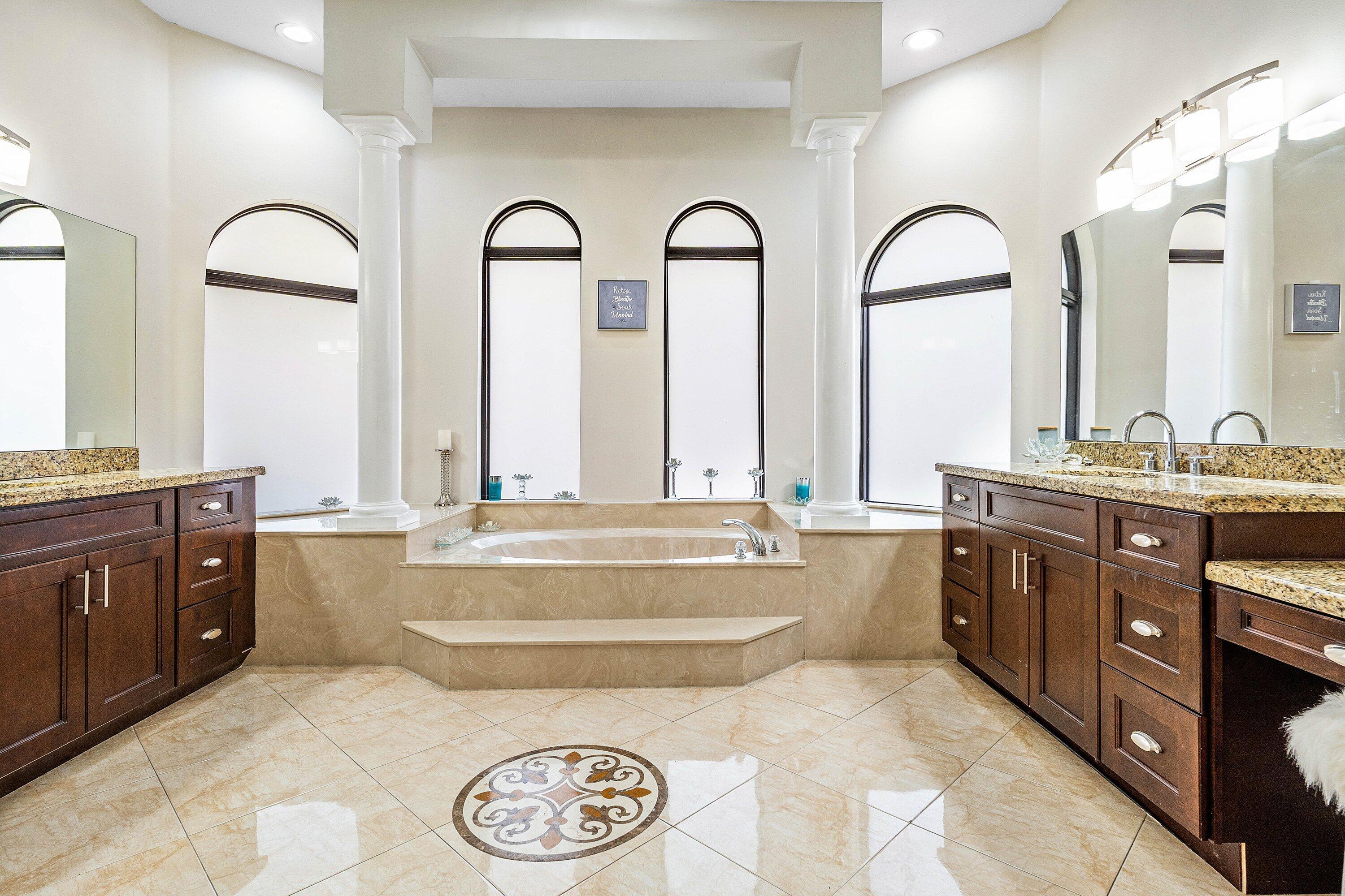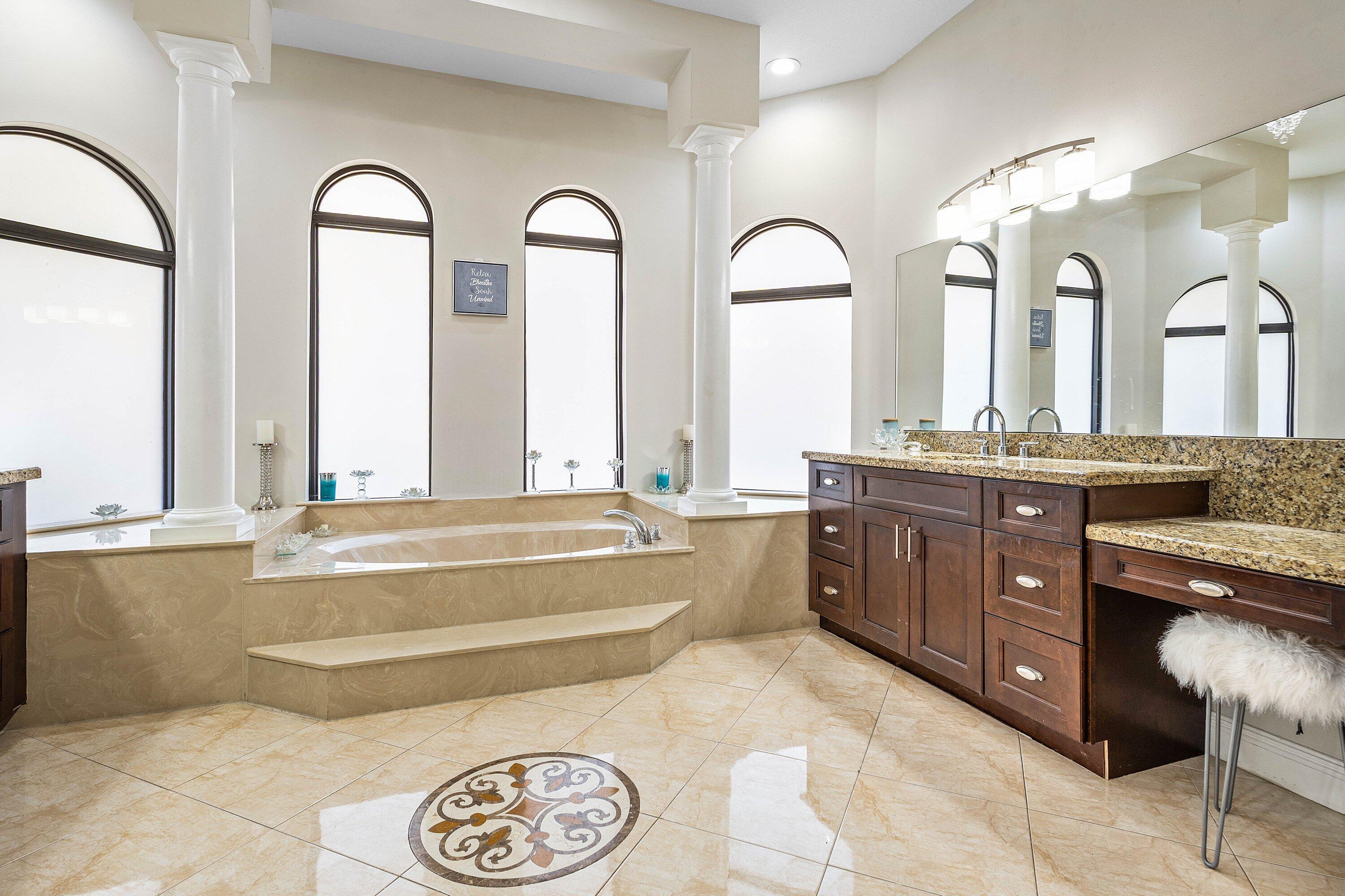 Bar, Foyer, French Door, Cook Island, Laundry Tub, Pantry, Roman Tub, Split Bedroom, Volume Ceiling, Walk-in Closet, Pull Down Stairs