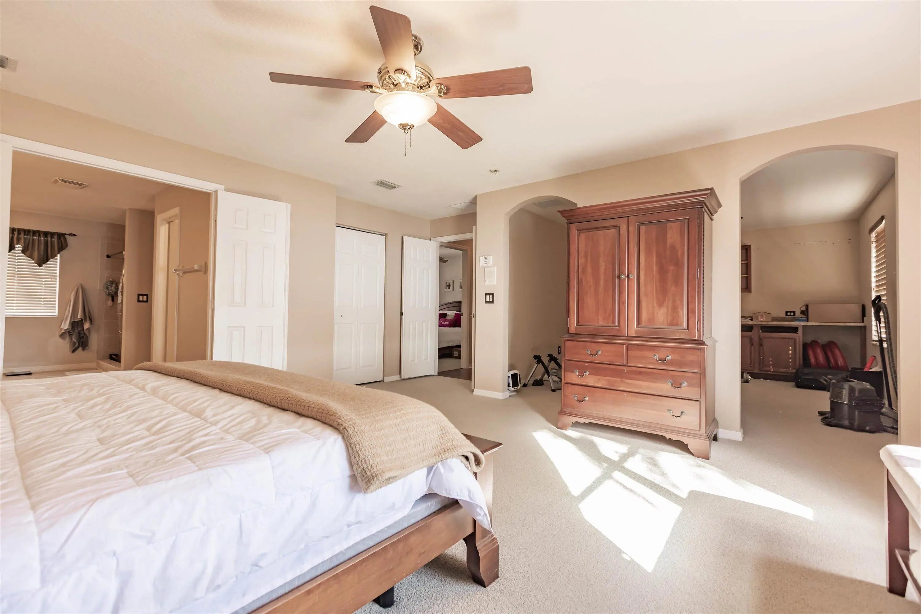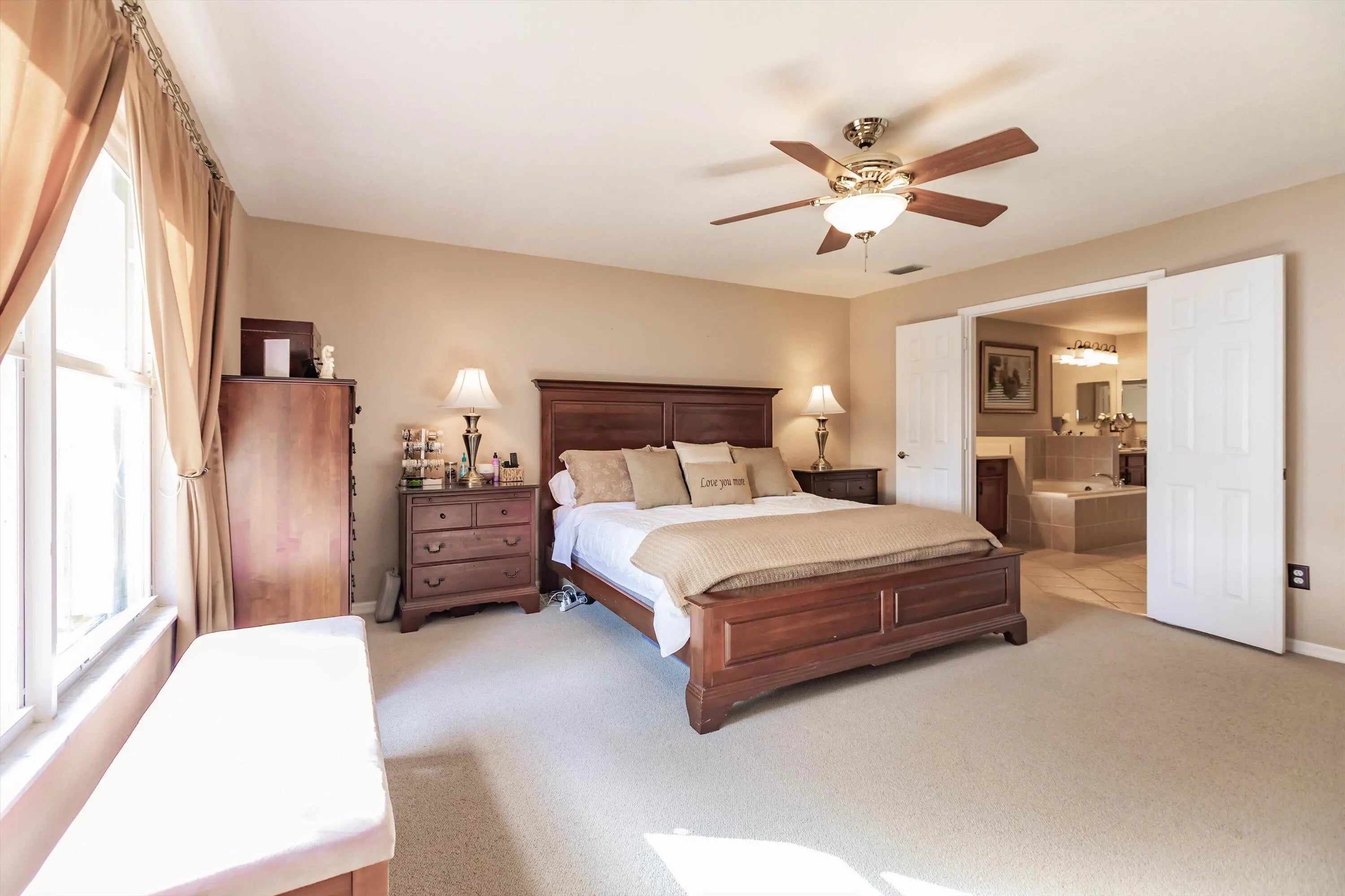 Welcome to this beautifully designed two-story home, offering 5 spacious bedrooms and 3 full bathrooms in a serene, gated community of only 200 homes. The 5th bedroom was opened up to create a large master suite, but can be converted to 5th bedroom again. Nestled on a premium waterfront lot, this property boasts breathtaking lake views that can be enjoyed from the comfort of your living spaces and backyard with fruits trees. The thoughtfully designed floor plan includes a downstairs bedroom with its own bathroom--perfect for guests or multi-generational living. Upstairs, you'll find four additional bedrooms, including a luxurious primary suite with panoramic lake views. 3rd car garage workshop was converted to an extra room in the home, (SEE MORE for ADDT'L DESC.)