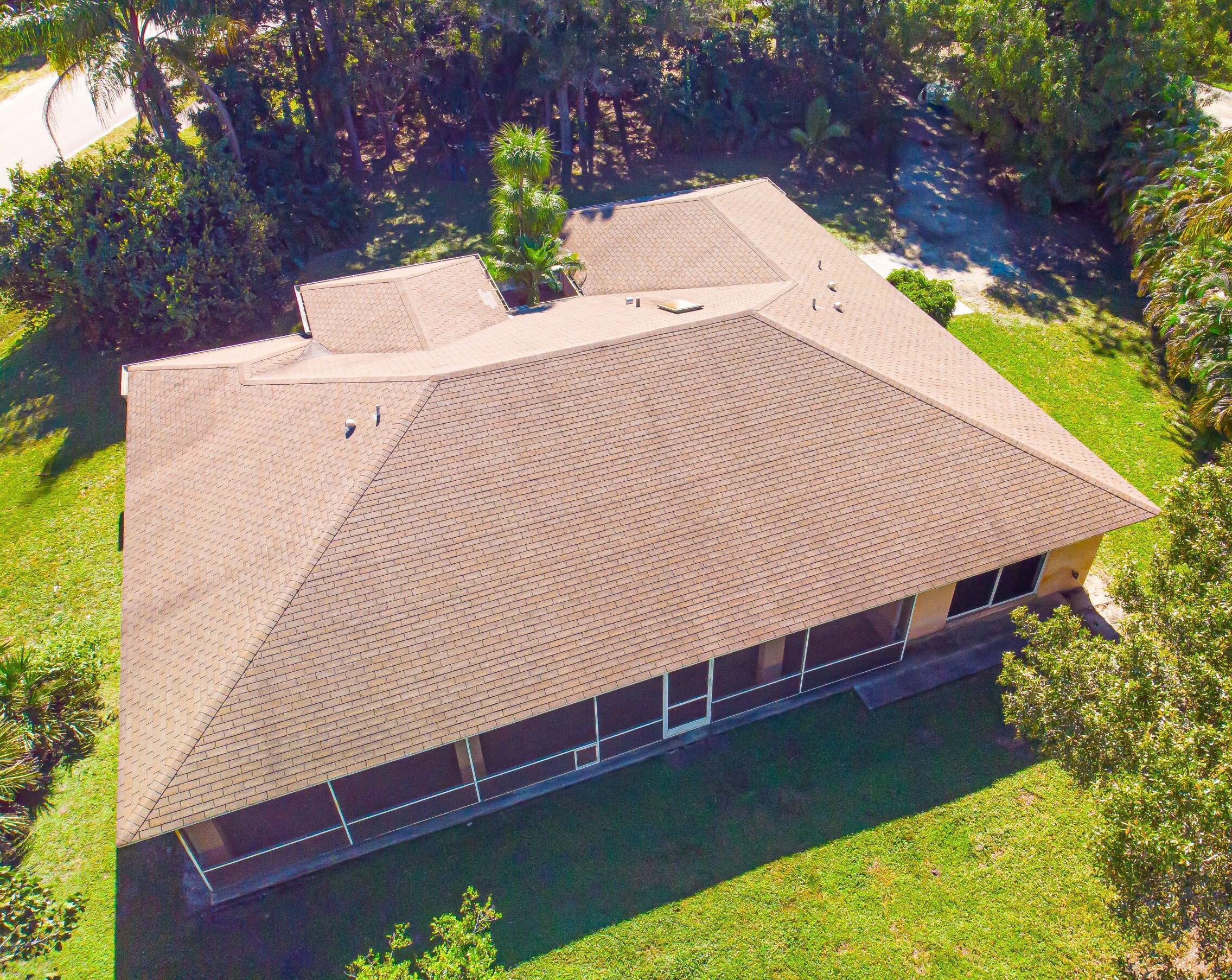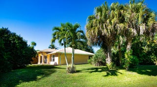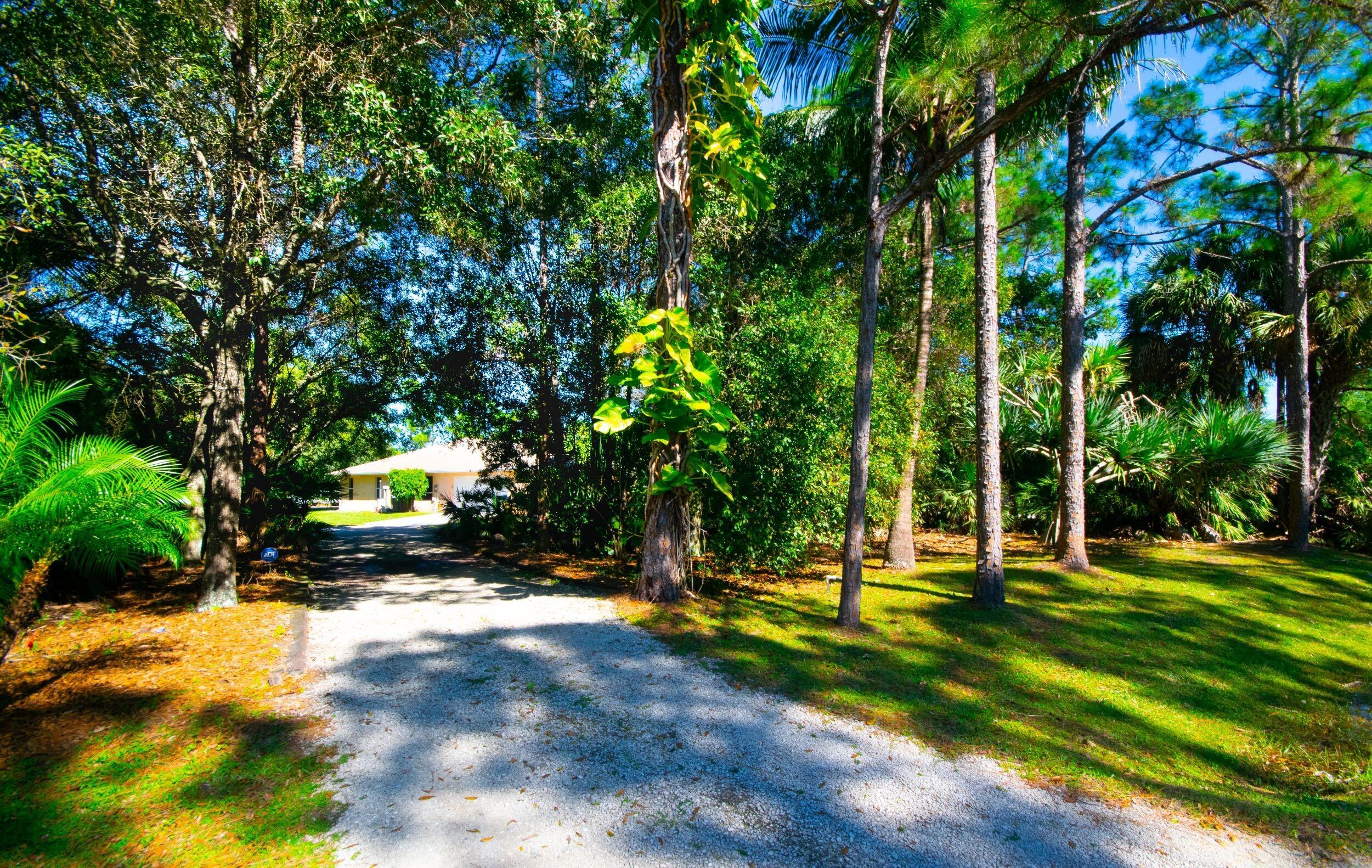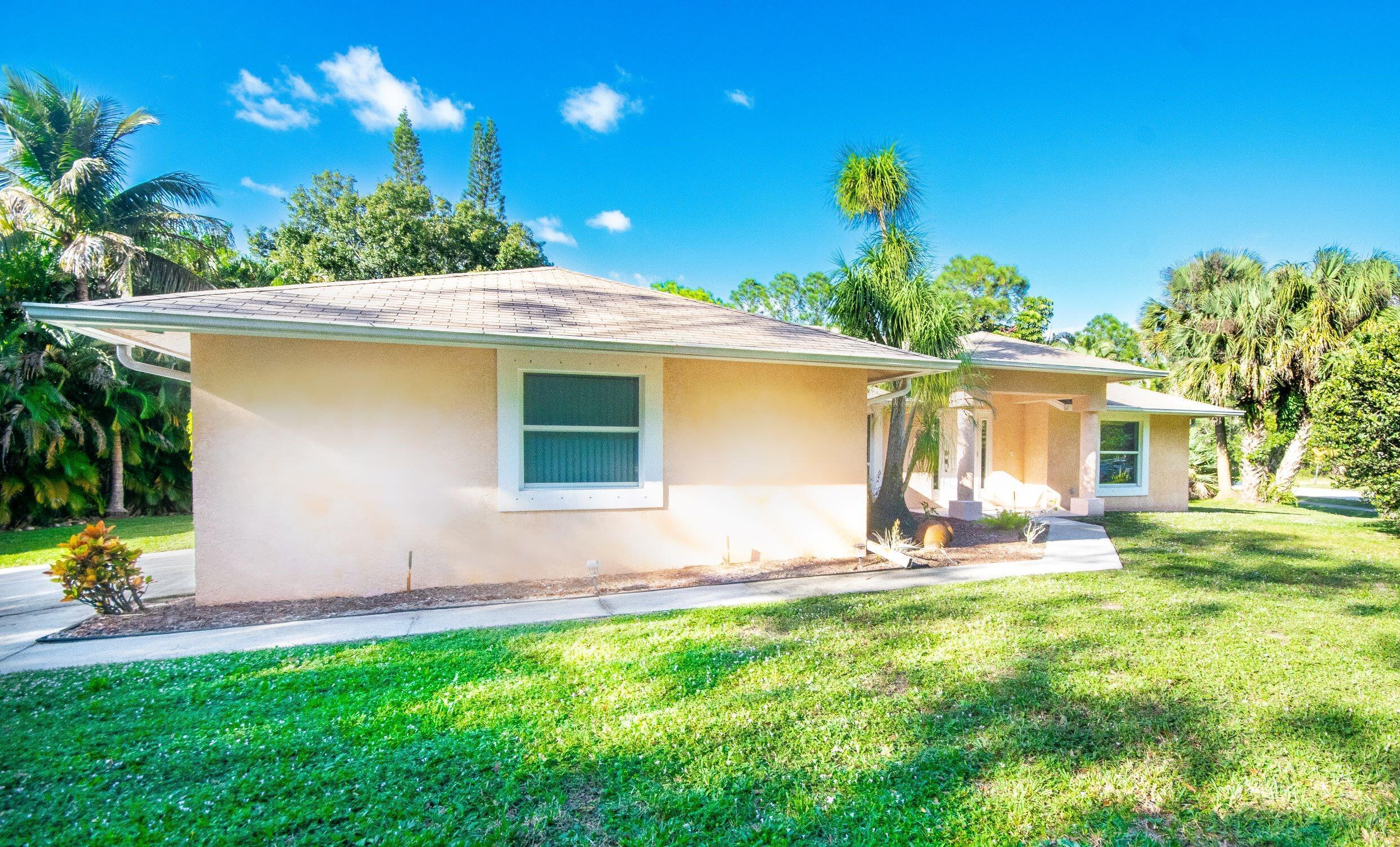 Welcome home to a private oasis located in Jupiter Farms. Single story CBS home with 2 car attached Garage located on paved road. The home has been freshly painted with all New Oak Ceramic Planking and base boarding. Open floor plan with renovated kitchen and baths. Quiet corner property with Large Screened Patio. The kitchen features a center island and white raised cabinetry. Master suite features his and her walk-in closets. The Primary bath has been totally remodeled er, water closet and dual sinks. Second bathroom could serve as a cabana bath. Inside laundry room has built in cabinetry and folding station. Living area has a pocket sliding glass door that leads to a huge 12 x 34 screened in patio.