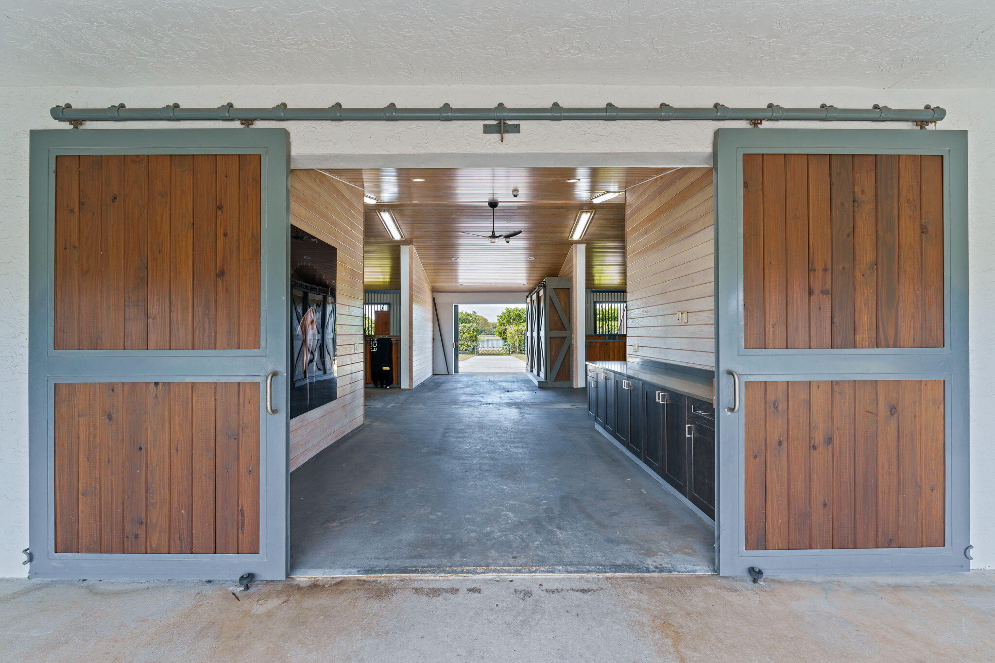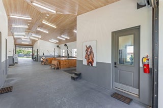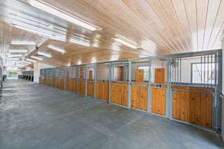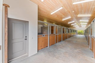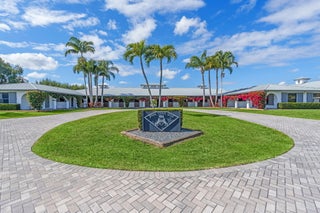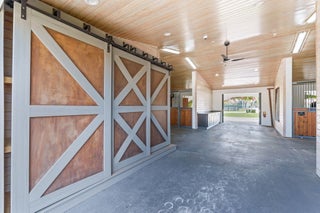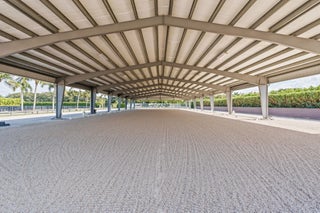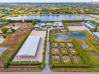 Tucked away in a quiet, secluded setting yet optimally positioned near the horse show, this exceptional farm offers the rare combination of privacy and convenience. From the moment you pass through the gates, it is clear this is a special property, framed by lush bougainvillea and beautifully curated landscaping that feels both welcoming and picturesque. Spanning just over 5 acres, the farm is thoughtfully designed and impeccably maintained. A standout feature is the oversized mirror arena, mostly covered and equipped with all-weather fiber footing, making it ideal for year-round training. The property includes 38 total stalls, with a 24-stall main barn featuring a center aisle and 14 additional stalls in a separate rear center-aisle barn. Abacus cushion stall flooring Abacus cushion stall flooring provides exceptional comfort, and the stalls feature Dutch doors that allow horses to look out. Tongue-and-groove finishes, generous storage throughout, and well-planned workspaces elevate both function and aesthetics. The layout is unlike most barns and offers a highly functional, flexible design. One side is fully owner-oriented and equipped with all amenities, while the opposite side offers a flexible configuration that can accommodate private facilities with separate workstations and tack rooms, alongside shared amenities including grooming and work areas, a feed room, and laundry, well-suited for multiple training operations. Additional amenities include a hot walker, round pen, 16 paddocks, and a fully fenced perimeter with mature clusia hedging. A shared pond provides irrigation, enhancing both sustainability and the striking façade of the property. The farm is set up for easy truck and feed delivery with a proper turnaround area and includes a hurricane-rated roll-down outbuilding. The property is supported by a full-property generator and offers four apartments, including two newly updated one-bedroom units and two studios, providing flexibility for staff or guests. With ample parking, thoughtfully separated work areas, and a picturesque setting, this farm blends beauty, efficiency, and top-tier equestrian functionality, all just a short hack to the horse showgrounds.